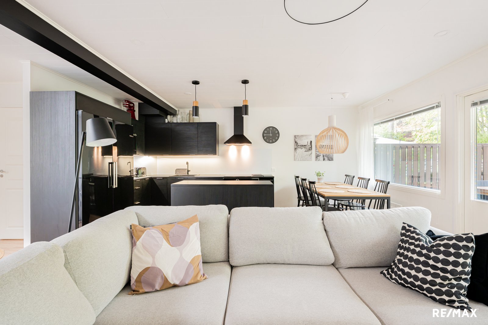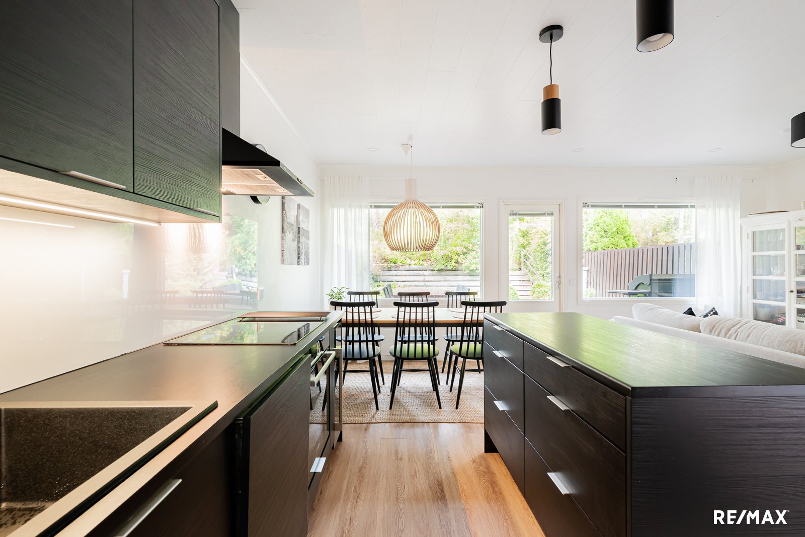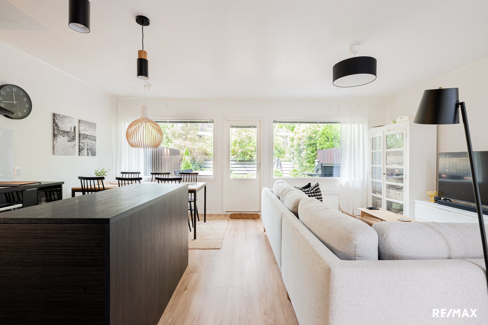 Asunnon olohuone ja keittiö muodostavat avaran kokonaisuuden, josta on suora käynti omalle terassille / suojaisalle takapihalle.