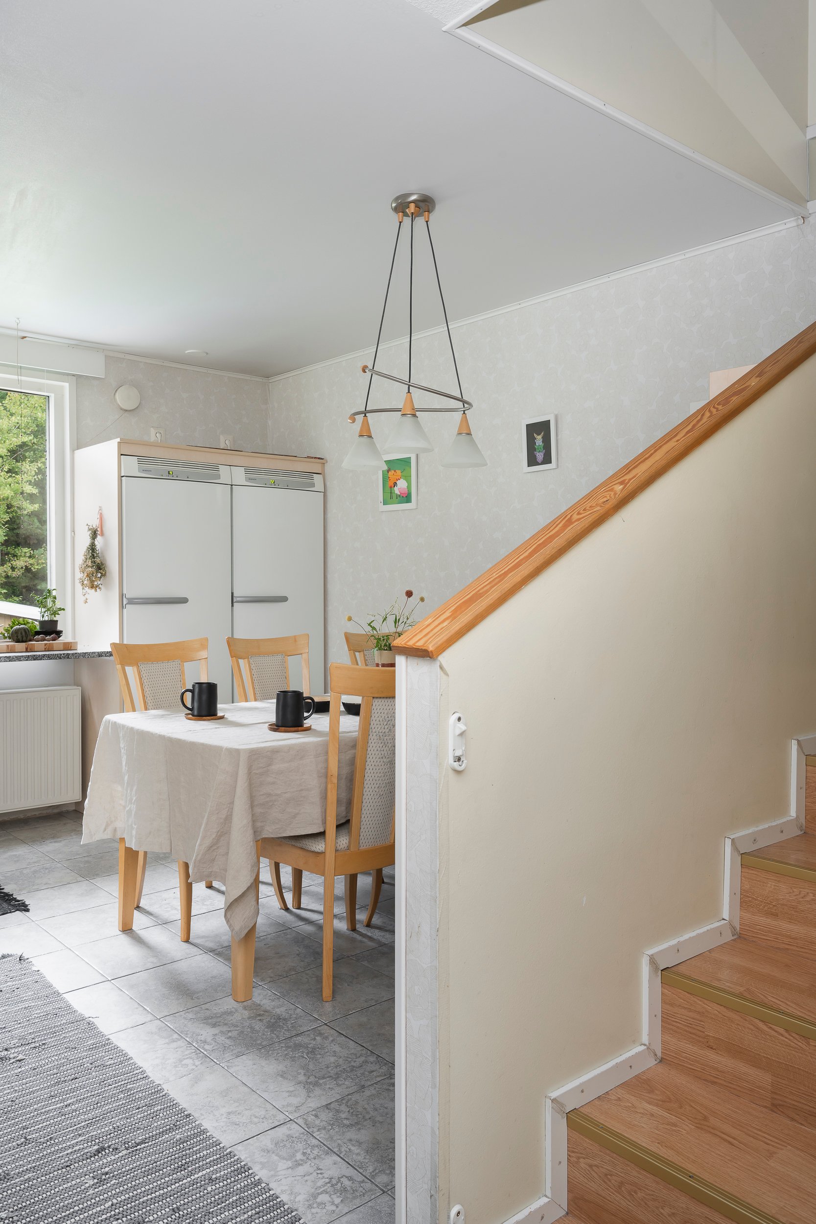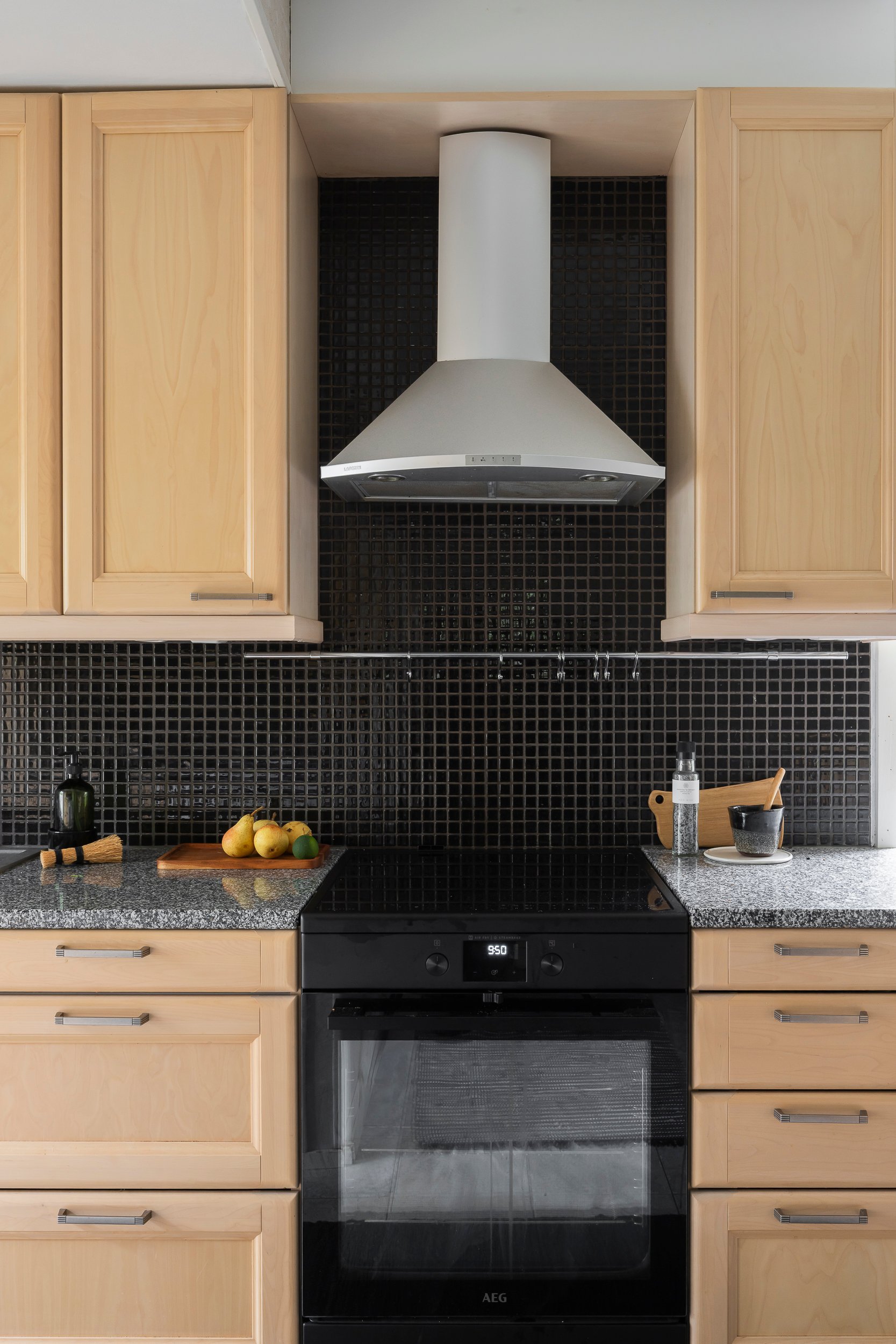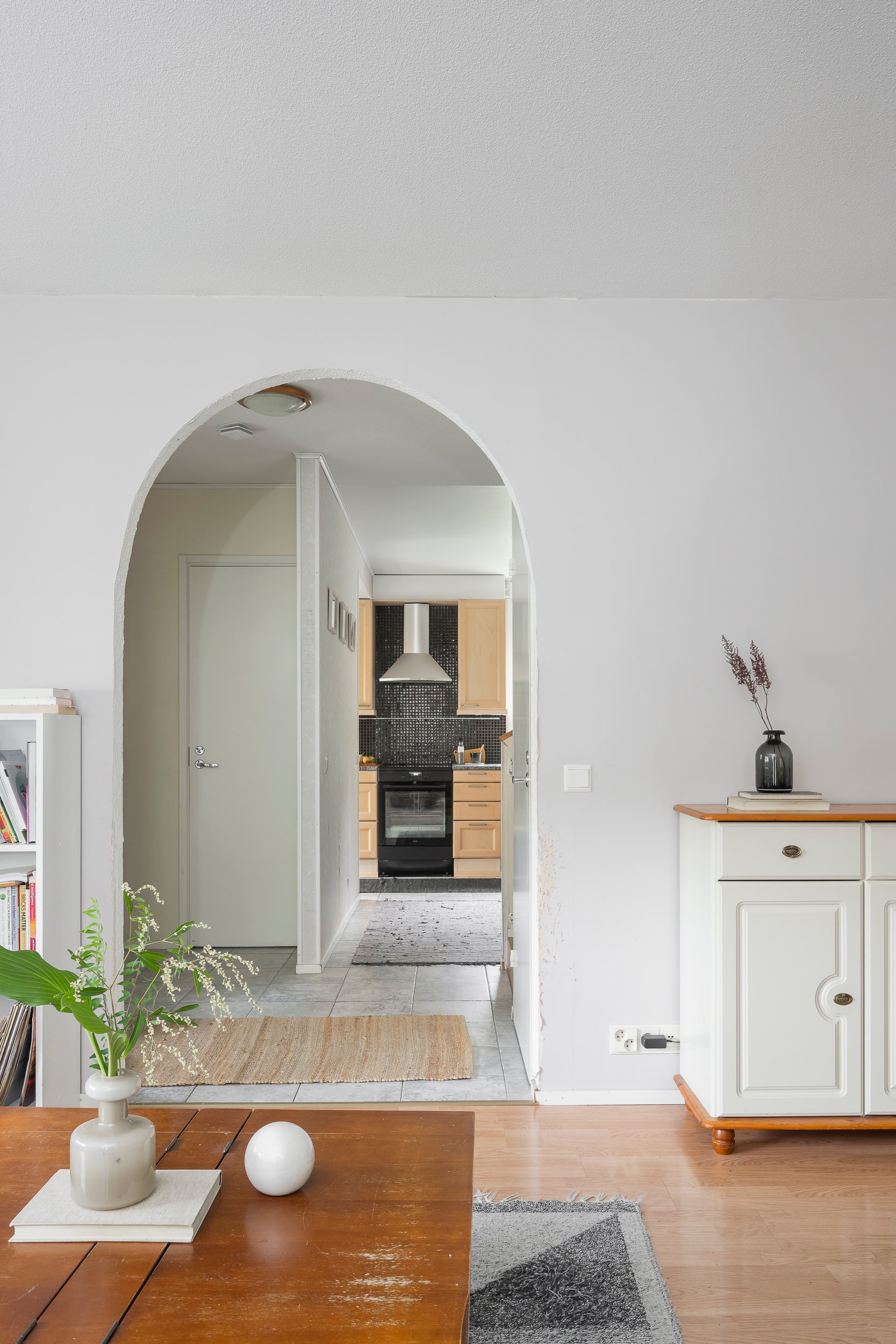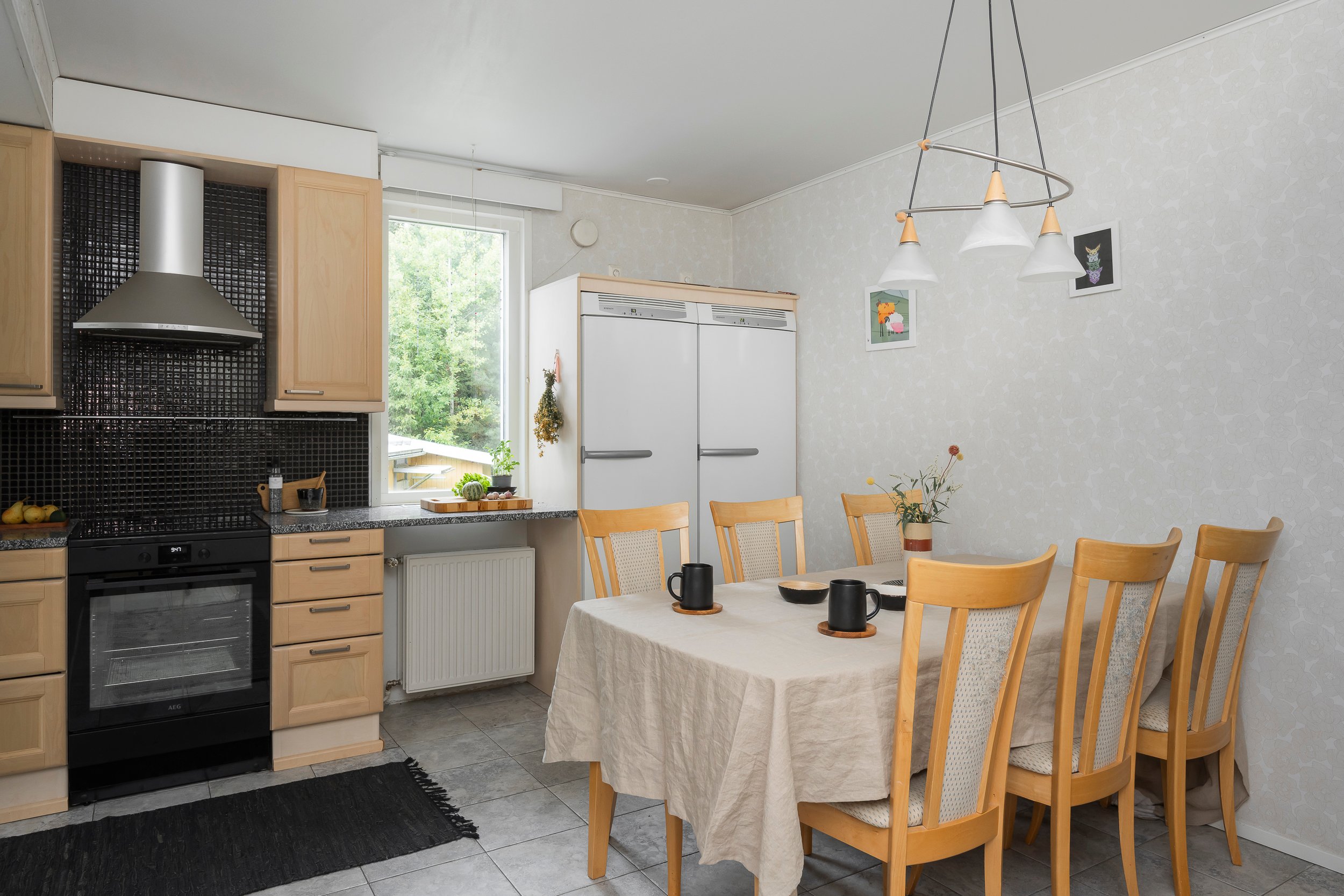 Keittiö on remontoitu Puustellin kalusteilla vuonna 2009, sen ajattoman tyylikkäät graniittitasot sekä upouusi liesi kutsuvat kokkailemaan. Halutessaan pääsee tekemään pientä pintaremonttia mm. osa seinien tapettipinnoista kaipaa uusimista.