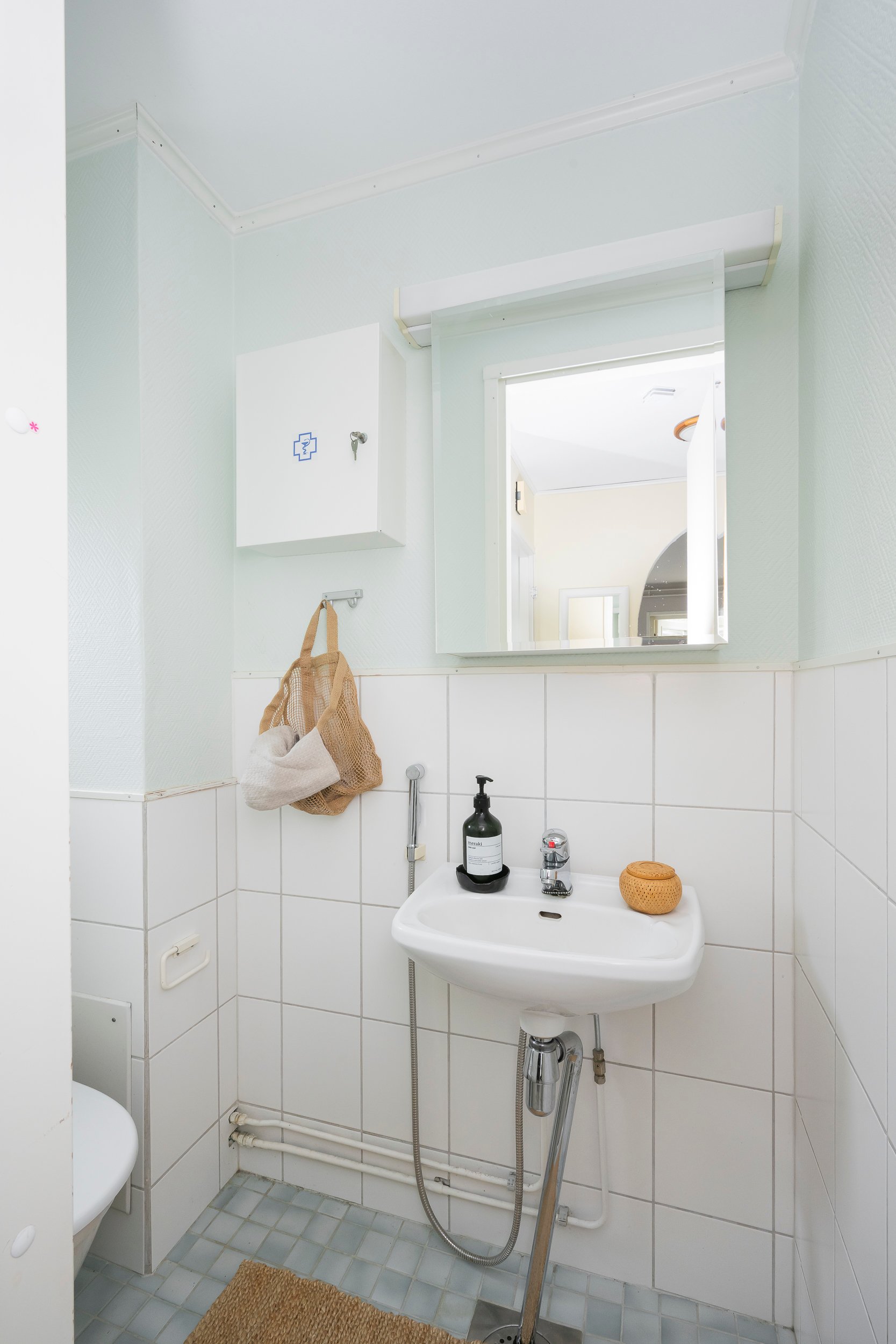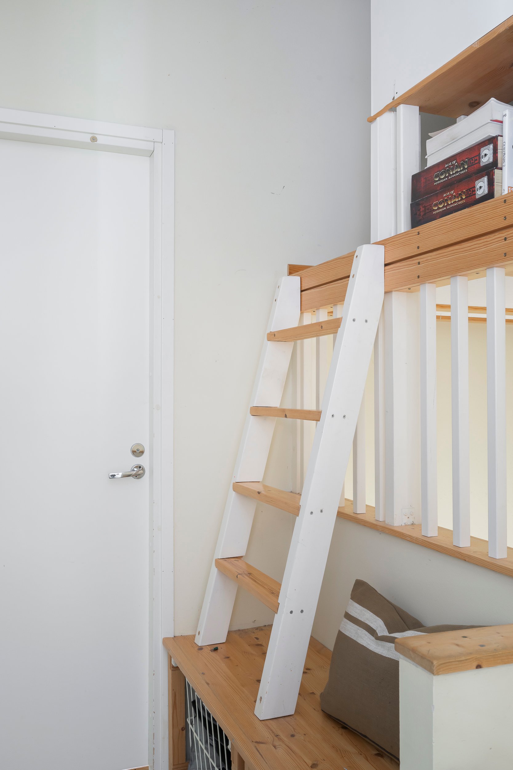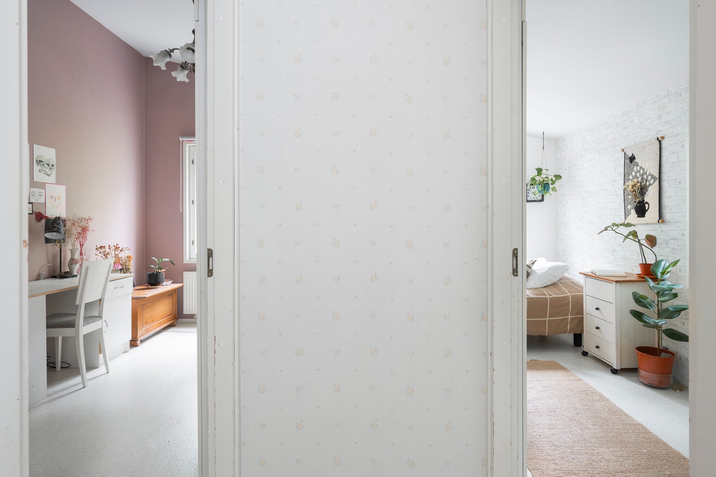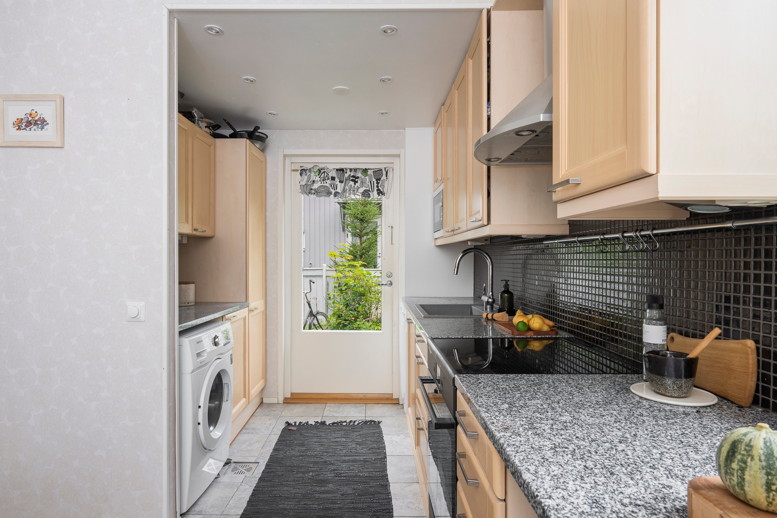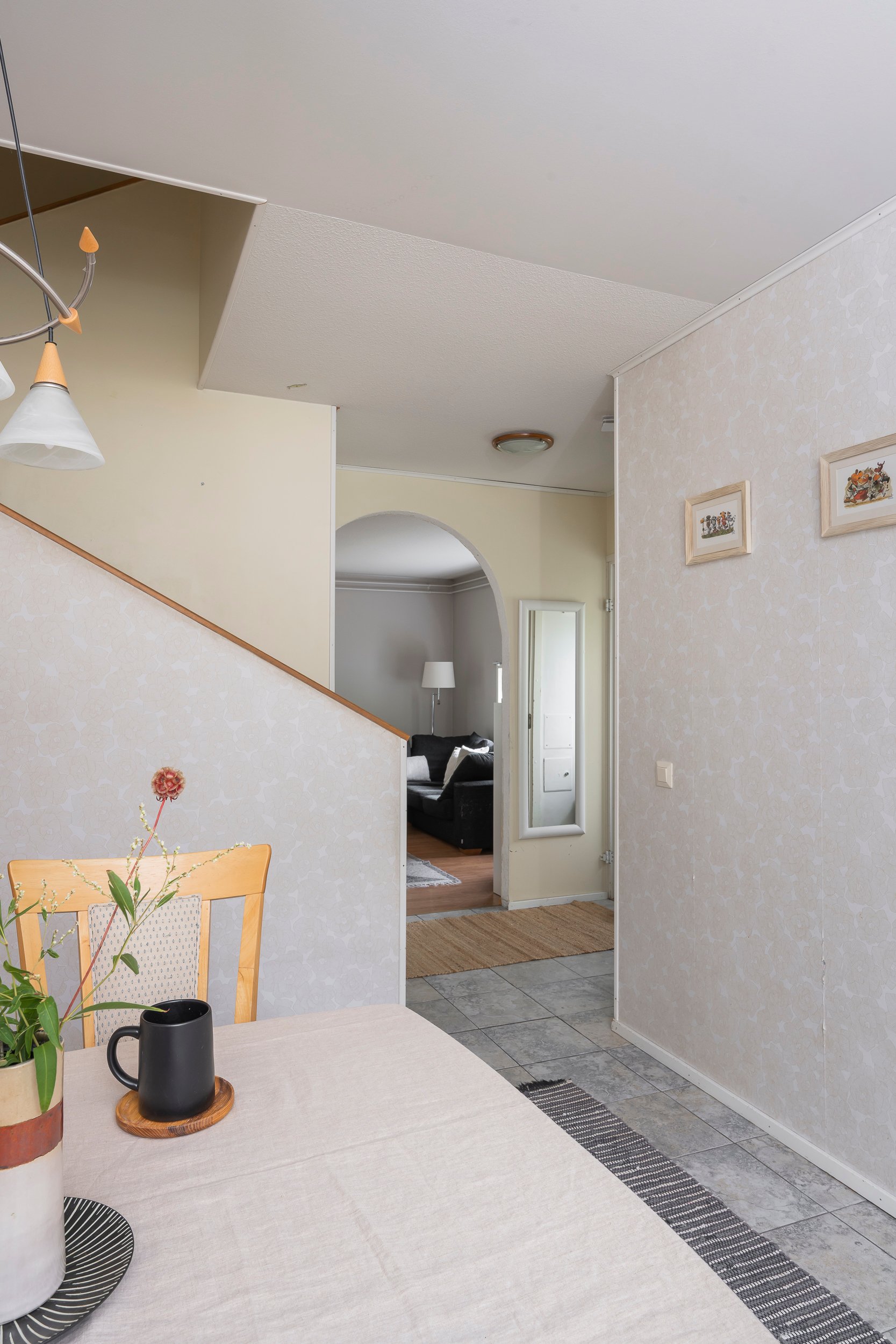 Keittiö on remontoitu Puustellin kalusteilla vuonna 2009, sen ajattoman tyylikkäät graniittitasot sekä upouusi liesi kutsuvat kokkailemaan. Halutessaan pääsee tekemään pientä pintaremonttia mm. osa seinien tapettipinnoista kaipaa uusimista.