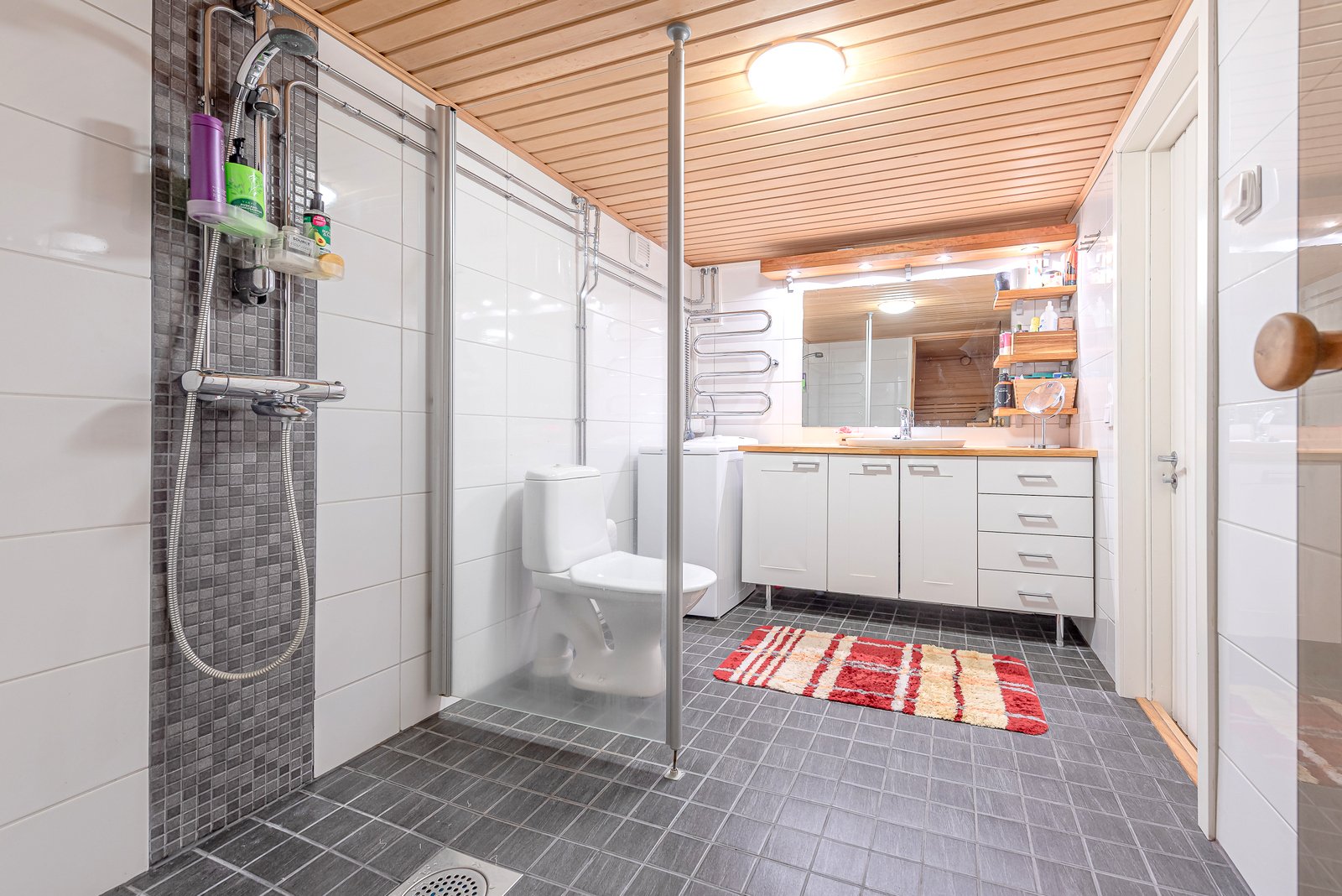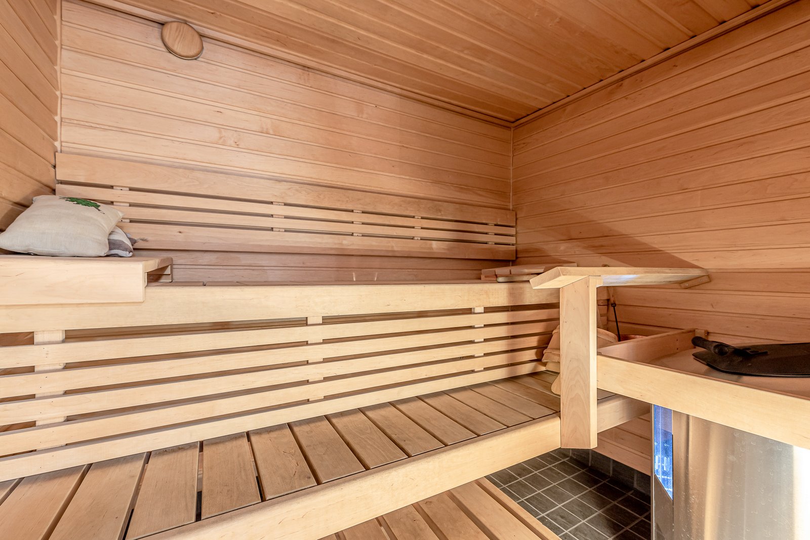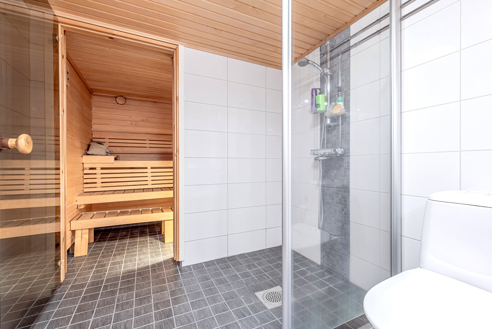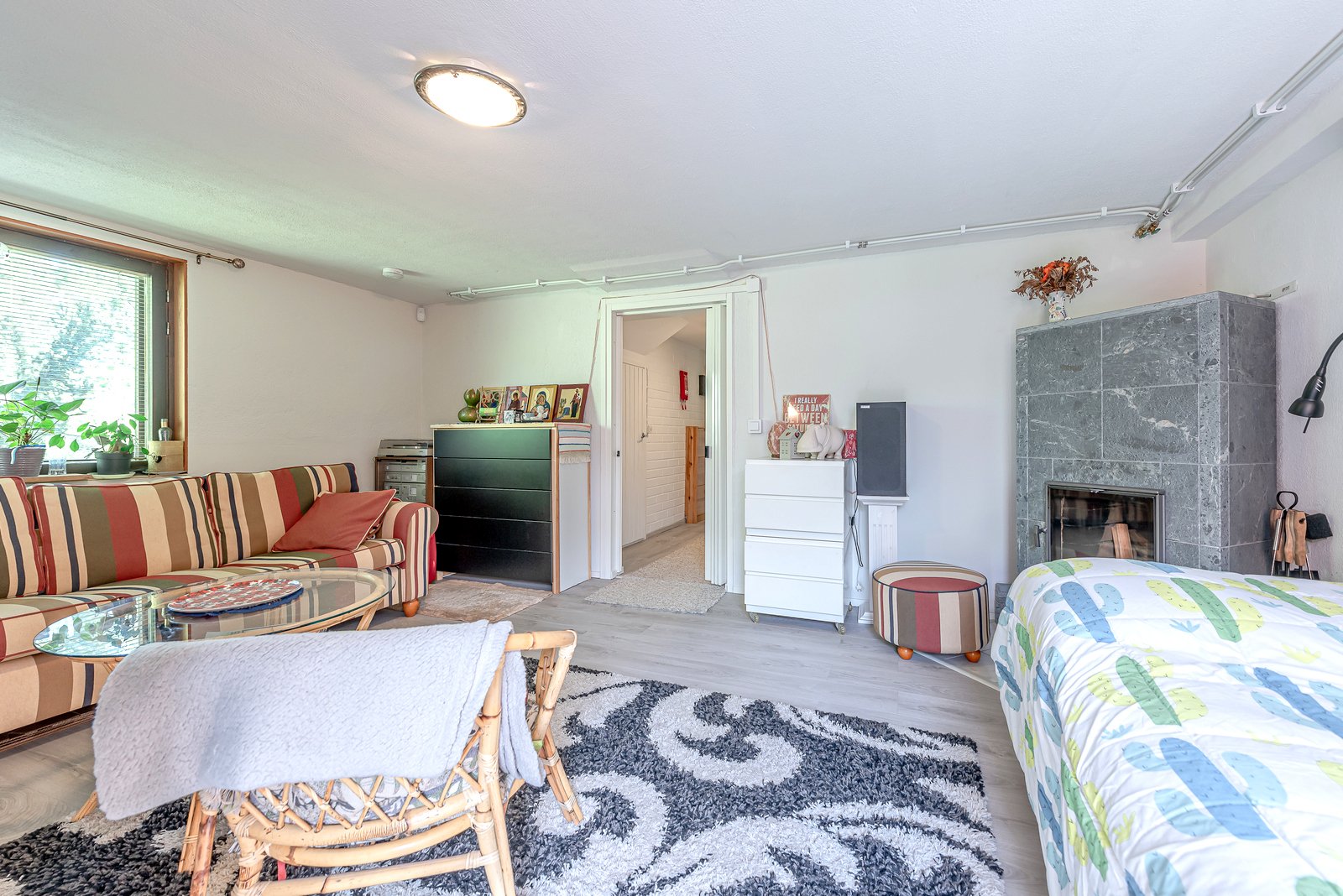 Kodissa on tilava olohuone, johon tulee valoa isojen ikkunoiden ja kattoikkunan kautta, Keittiö on pienehkö, mutta sieltä löytyy kaikki tarpeellinen arjen kokkailuihin. Asunnon sauna tarjoaa rentouttavat löylyt ja saunan jälkeen rentoutuminen on takkatulen ääressä luksusta. Takkahuoneen kautta pääsee myös vilvoittelemaan pihalle saunan löylyistä.