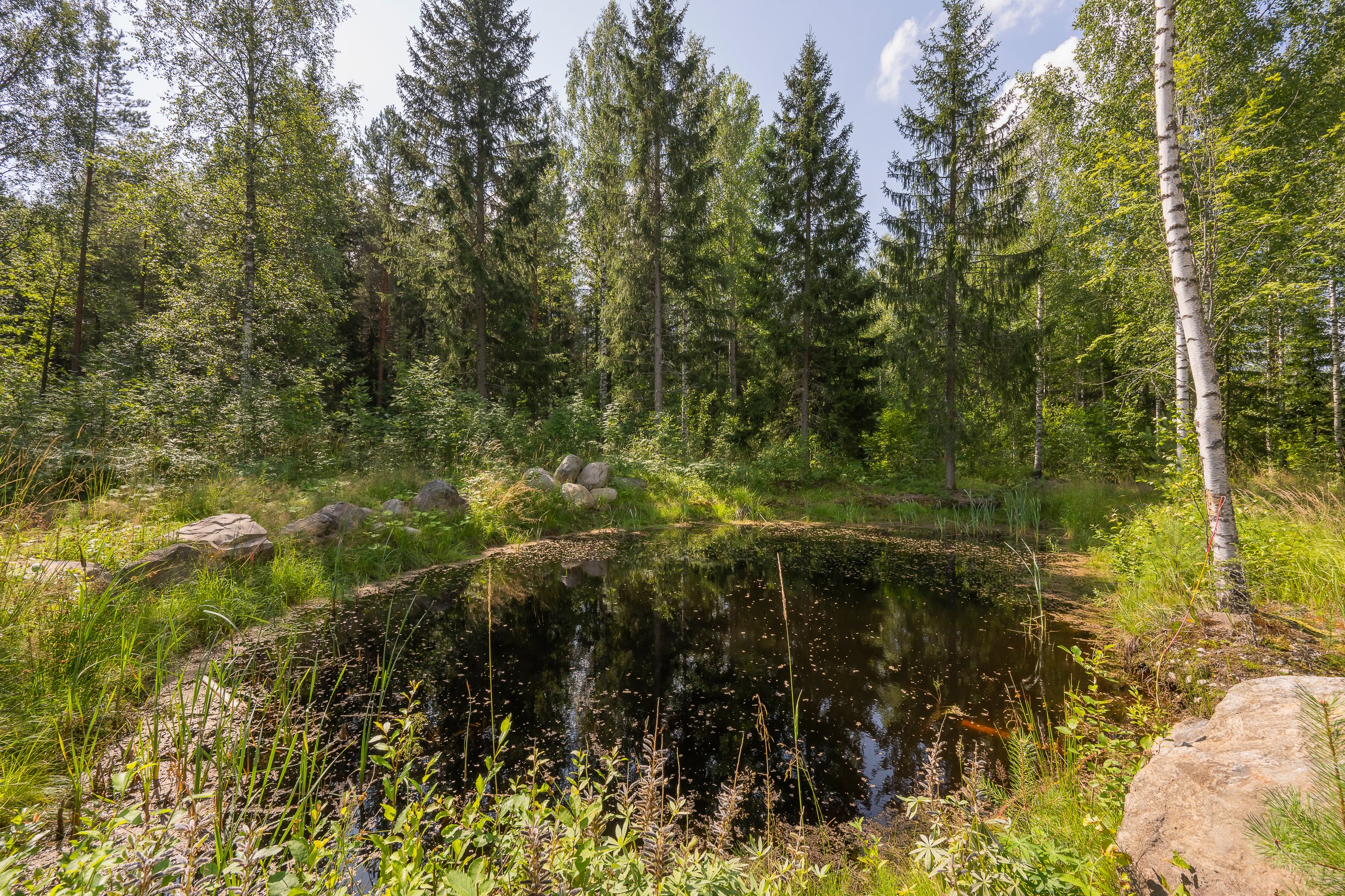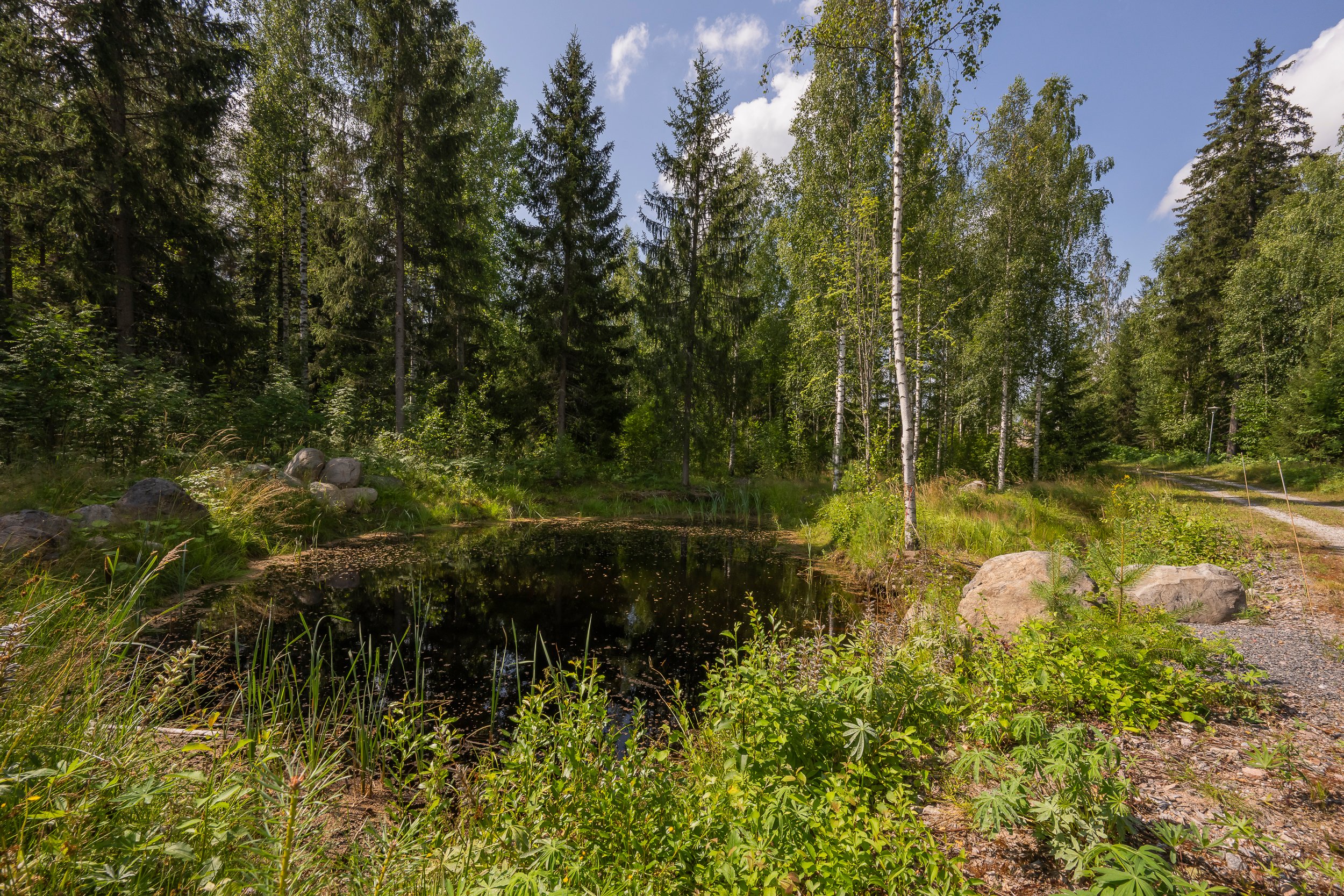 Tontti sijaitsee rauhallisella ja suojaisalla paikalla, jossa oma rauha ja vehreä ympäristö yhdistyvät hyviin kulkuyhteyksiin. Iso tontti sisältää sekä tasamaata että loivasti nousevaa rinnettä, ja se rajoittuu omaan metsään, joka tuo yksityisyyttä ja tunnelmaa ympäri vuoden. Pihapiirissä on oma luonnonlampi, joka lisää viehätystä.