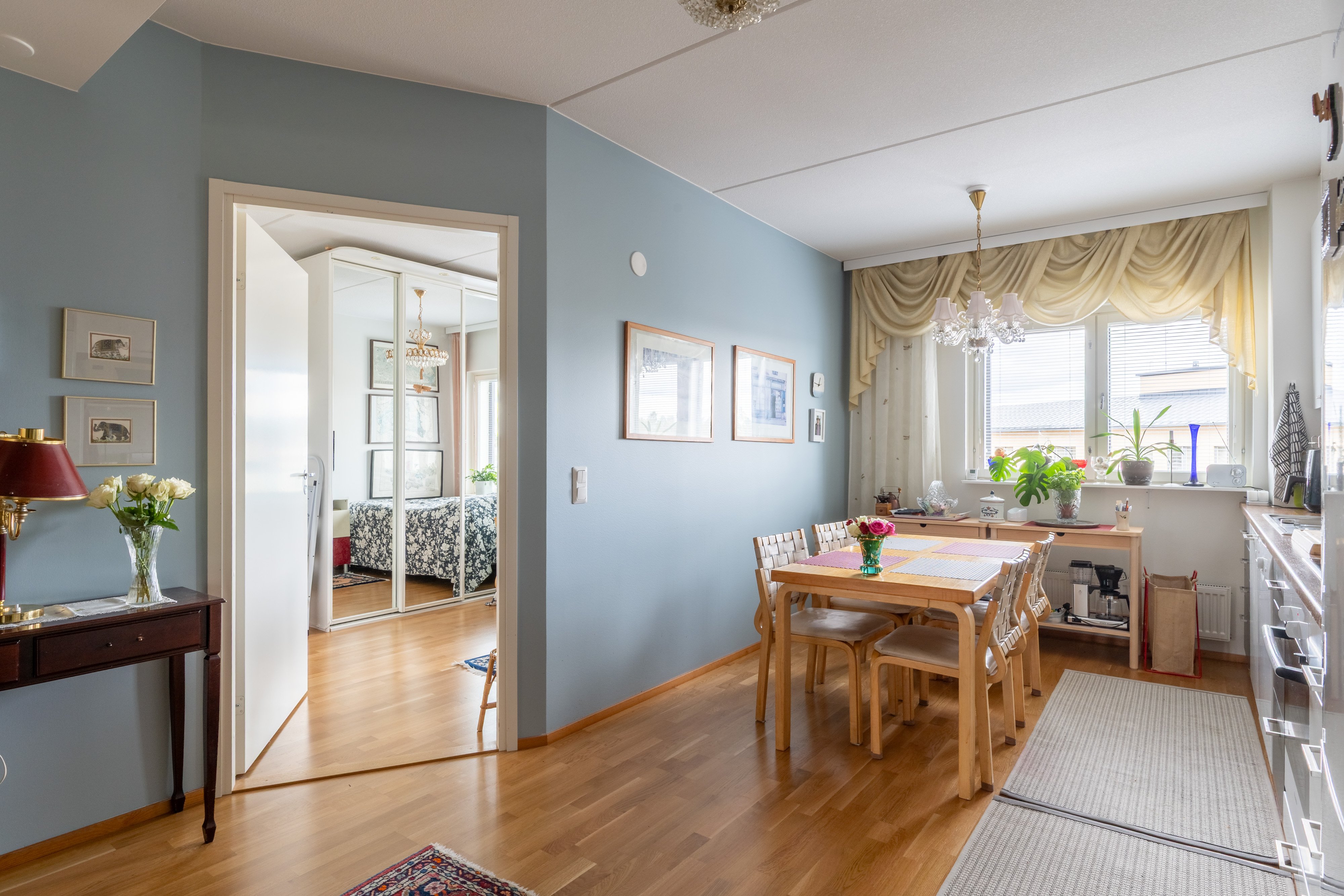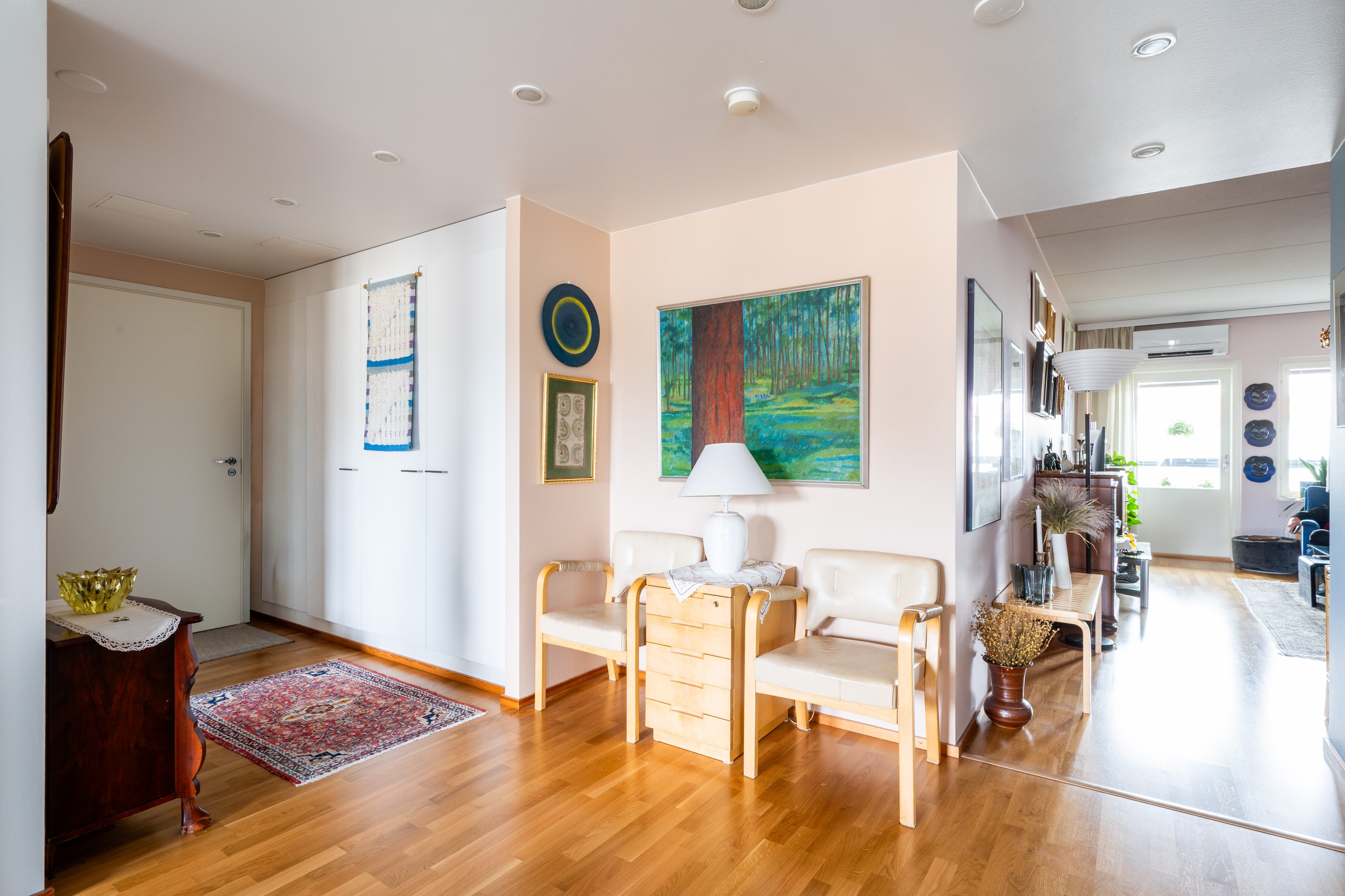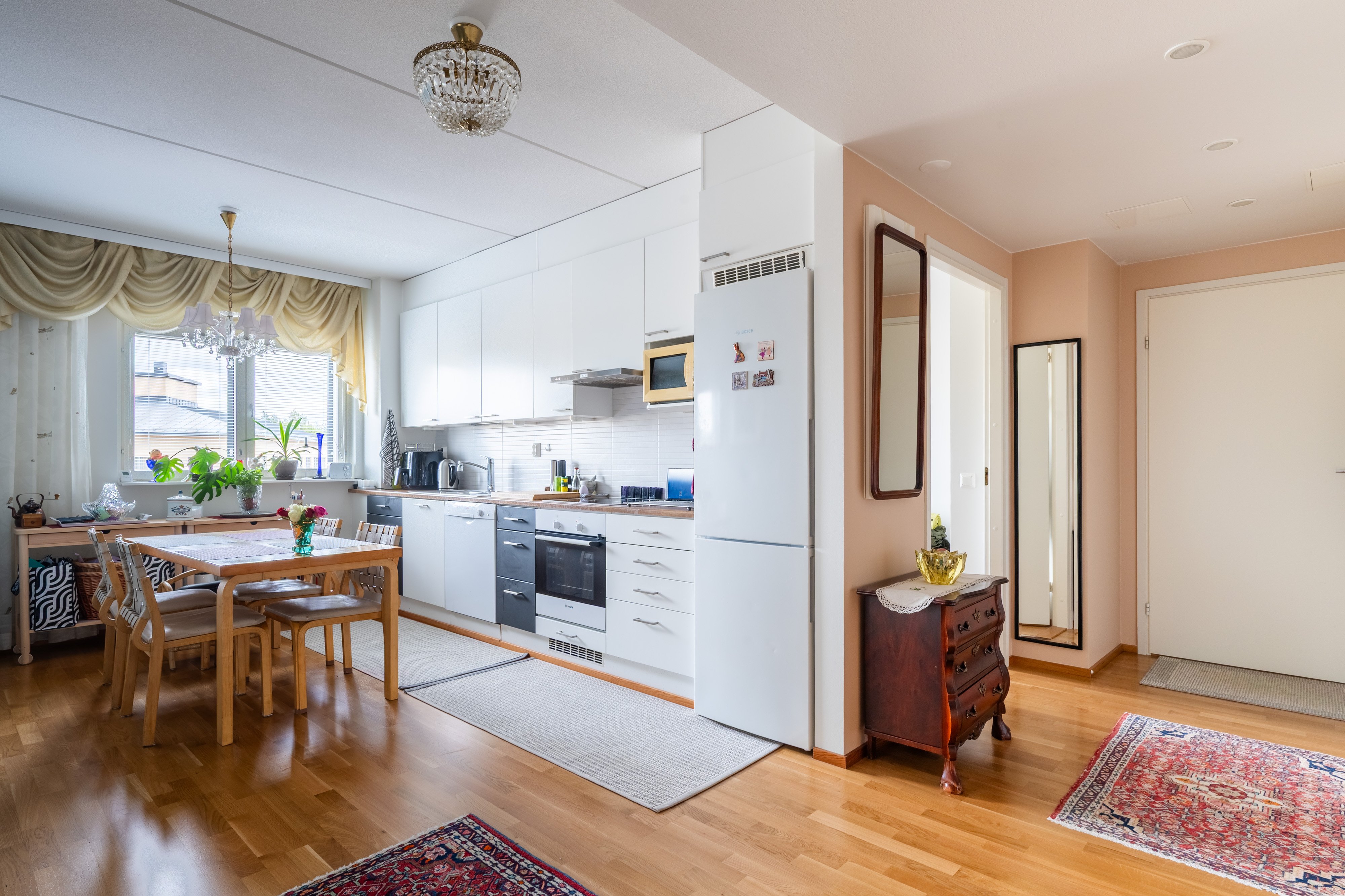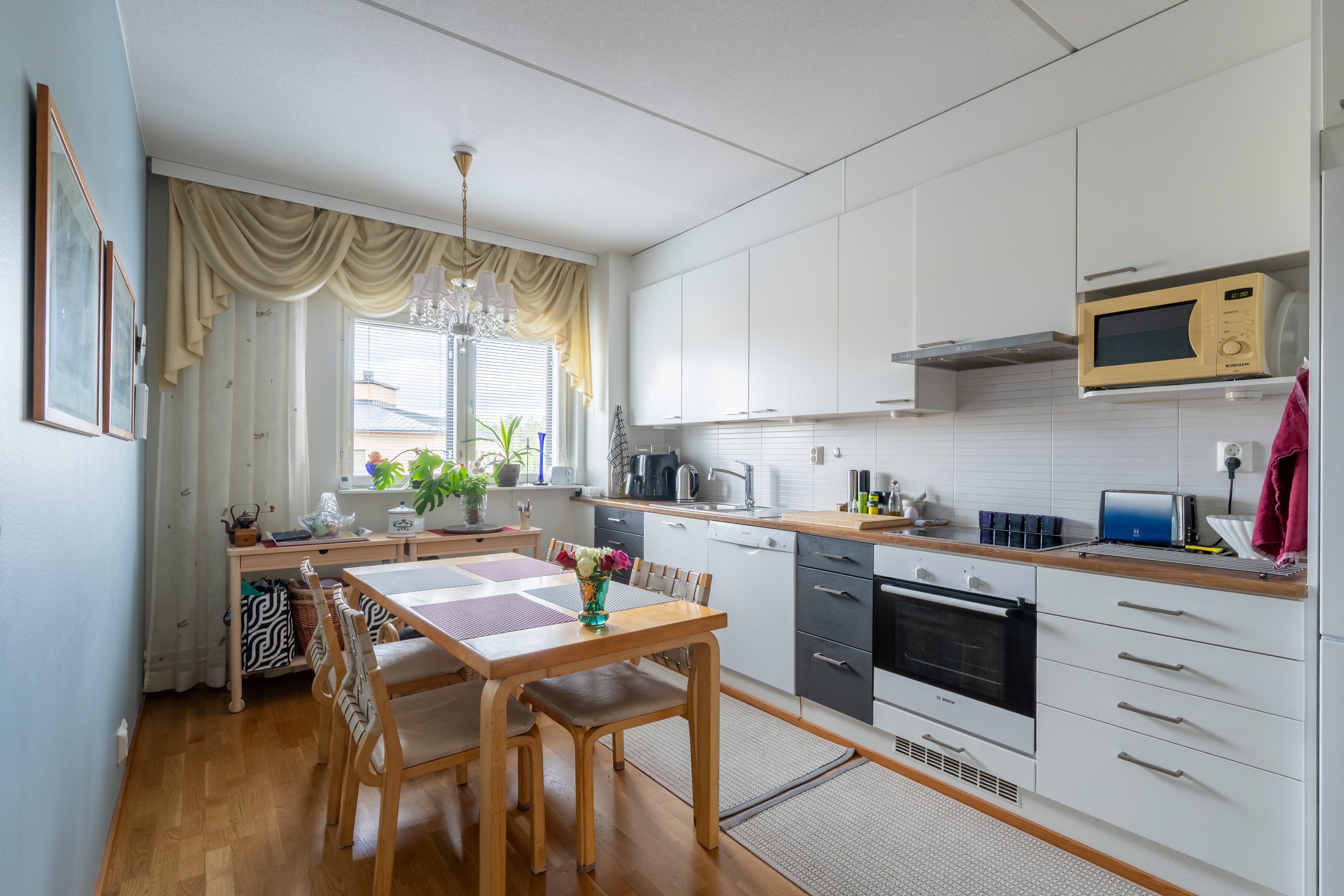 Asunnon avarat huoneet ja laadukkaat materiaalit, kuten parkettilattiat ja laatoitettu kylpyhuone, luovat tyylikkään ja ajattoman ilmeen. Keittiö on varustettu nykyaikaisilla laitteilla, kuten astianpesukoneella ja keraamisella liedellä, mikä tekee arjesta sujuvaa ja vaivatonta. Oman saunan ansiosta voit nauttia rentouttavista löylyistä milloin tahansa.