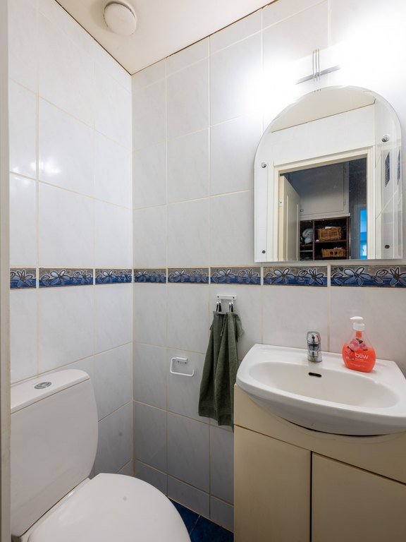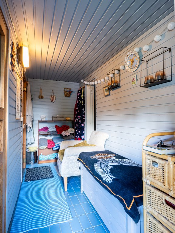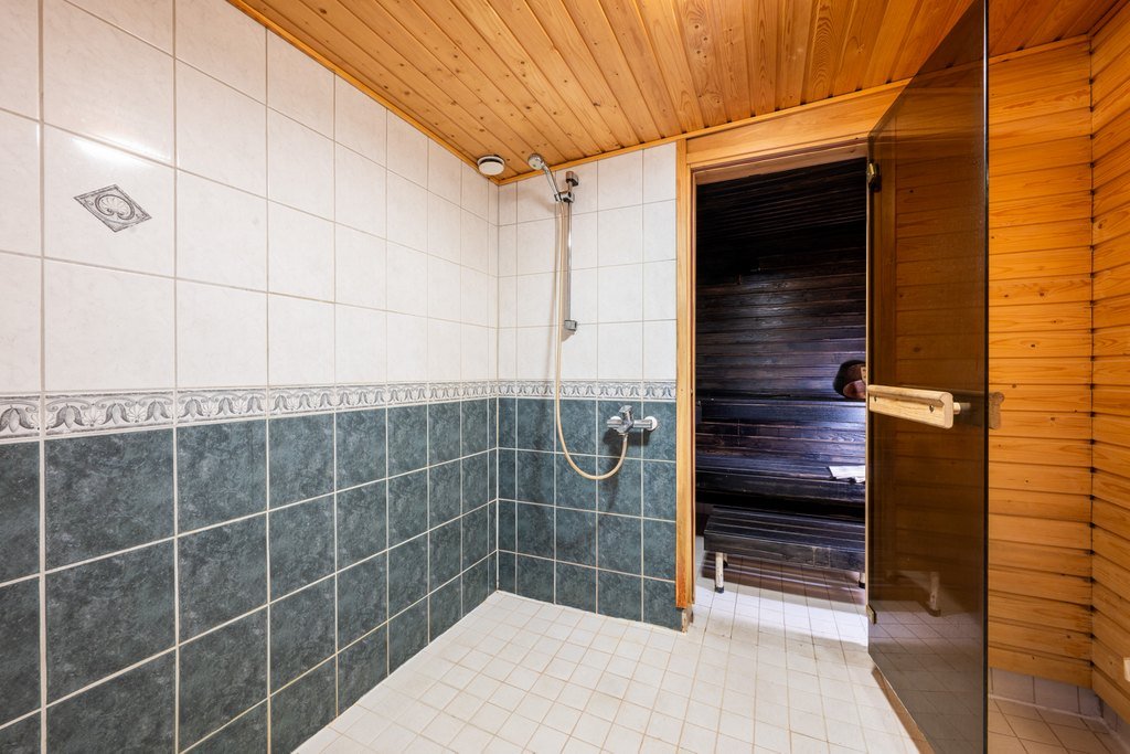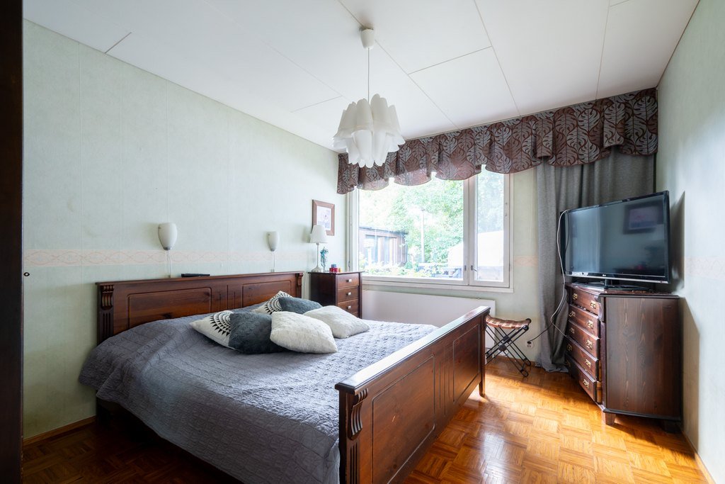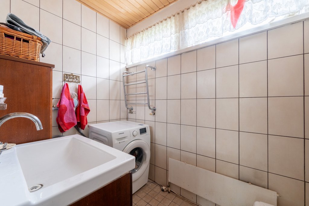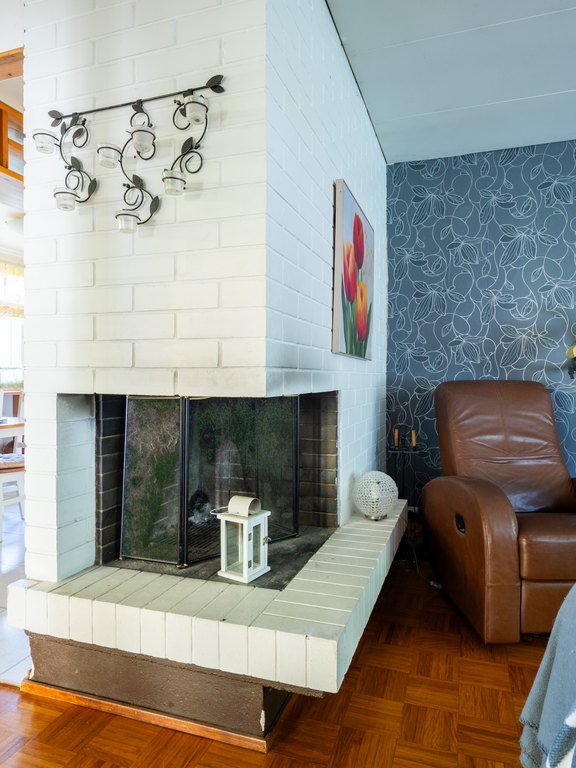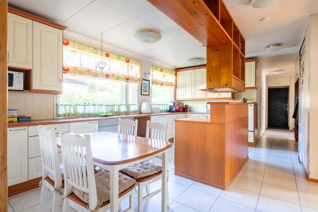 Taloon sisälle tultaessa vasemmalla makuuhuoneet ja oikealla toimiva kodinhoitotila sekä erillinen wc. Oikealla avara avokeittiö ja ruokailutila erikseen. Talon päädyssä reilun kokoinen olohuone, jossa on myös avotakka (ei ole ollut käytössä).