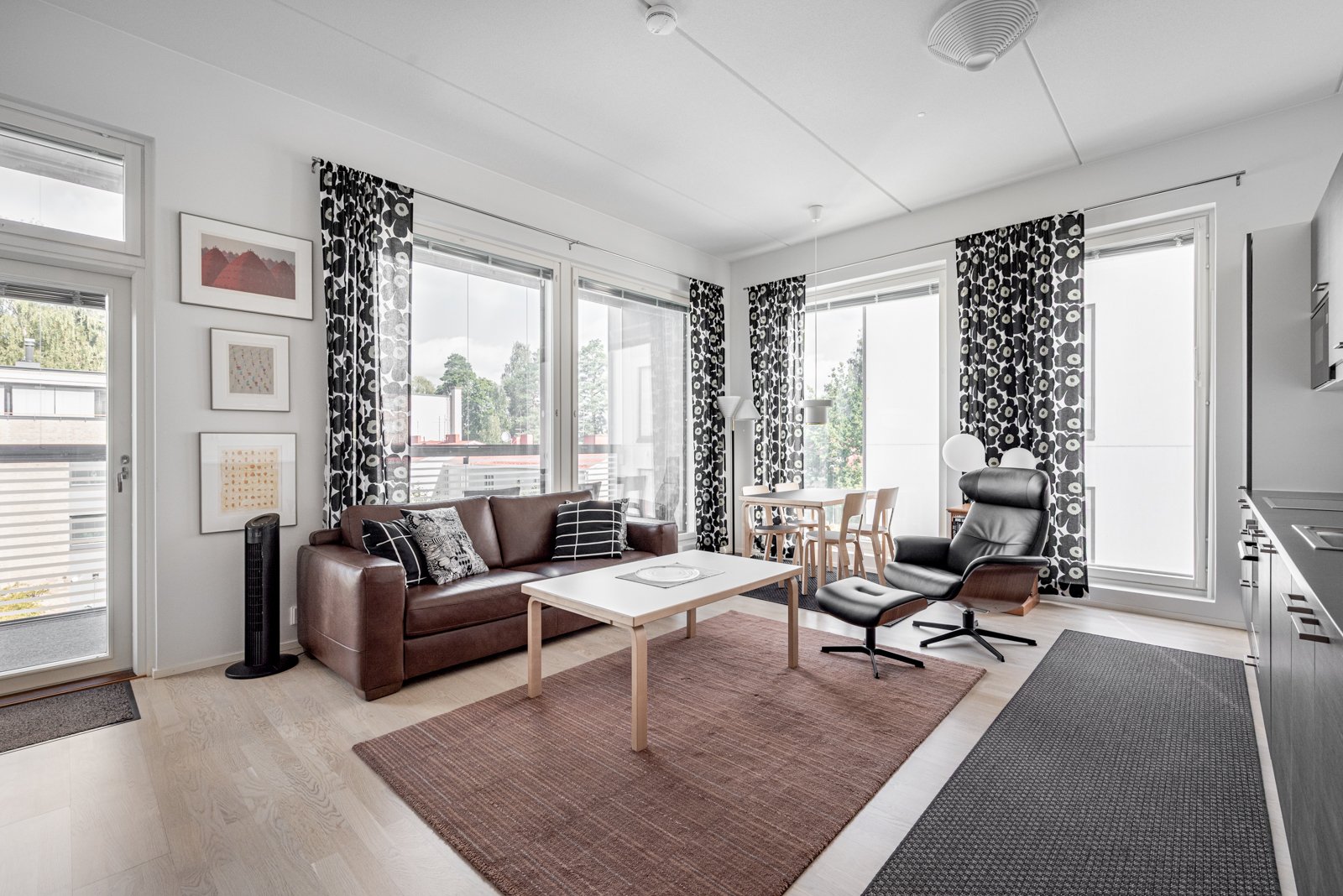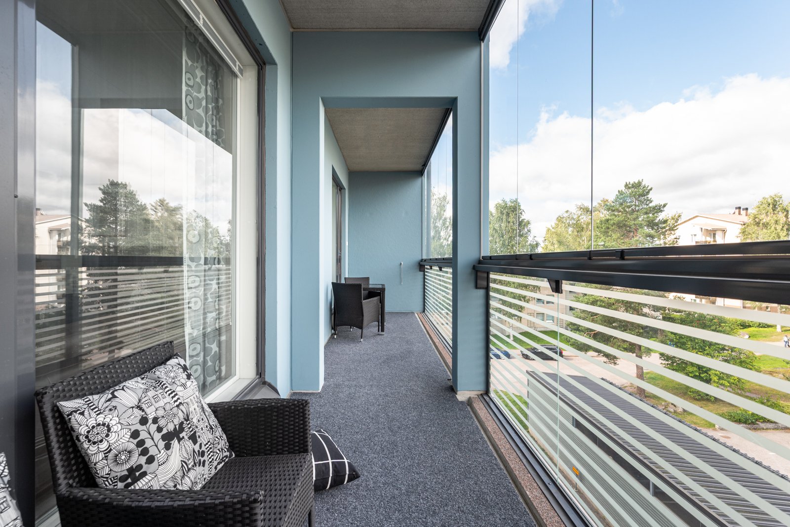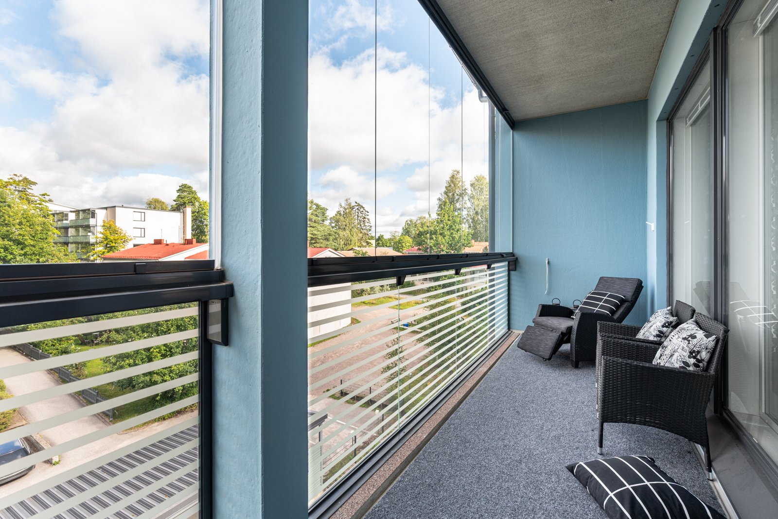 Asunnossa on tilava olohuone, johon mahtuu hyvin niin sohva kuin ruokailuryhmäkin. Avokeittiö on varustettu nykyaikaisilla kodinkoneilla, ja saunan löylyistä nautit oman kodin mukavuudessa. Koko huoneiston levyinen, luoteeseen avautuva lasitettu parveke tuo kotiin lisää tilaa ja toimii viihtyisänä oleskelutilana keväästä pitkälle syksyyn.