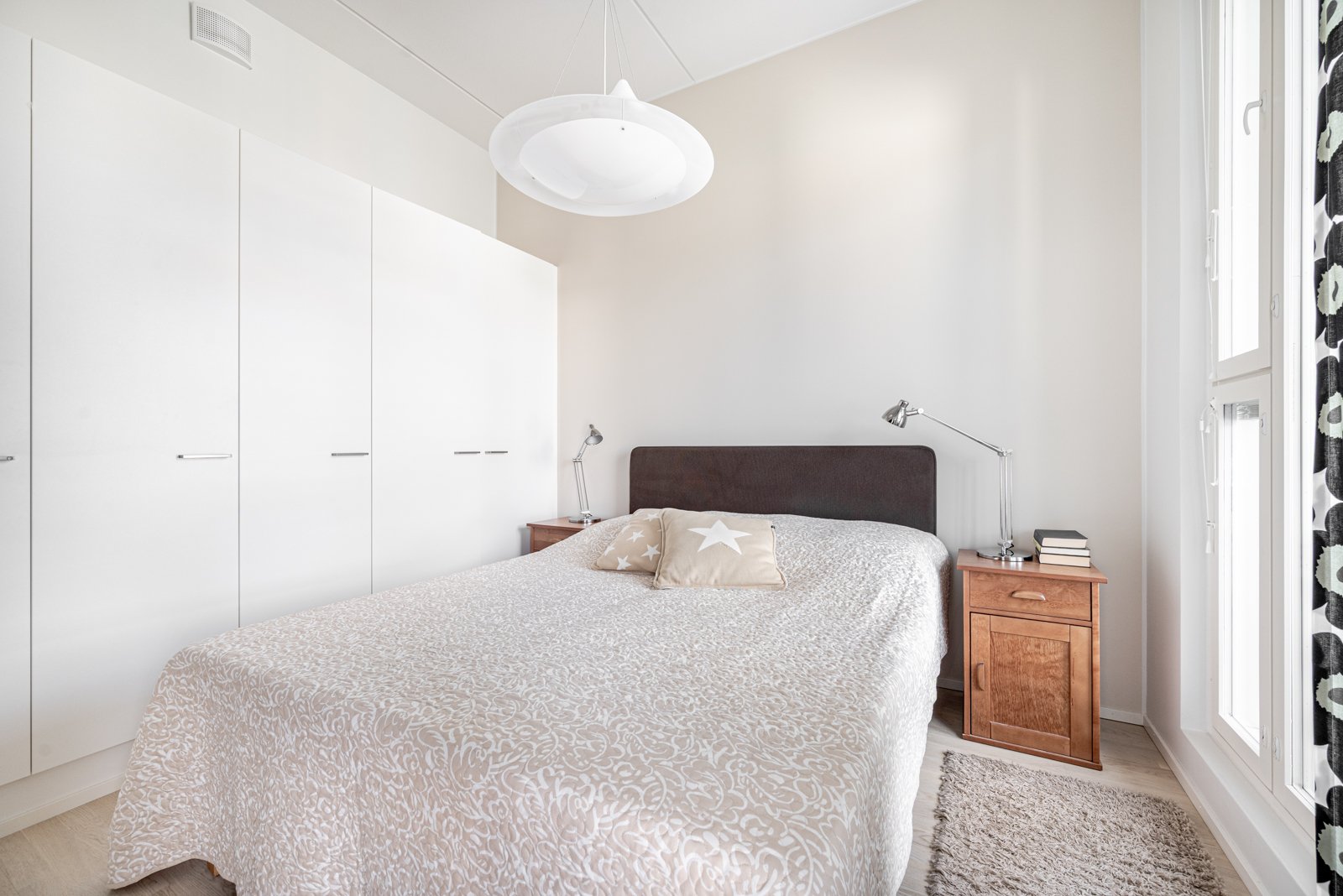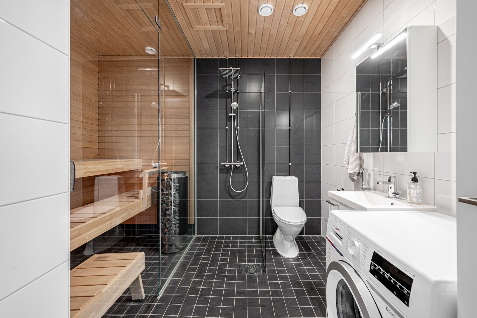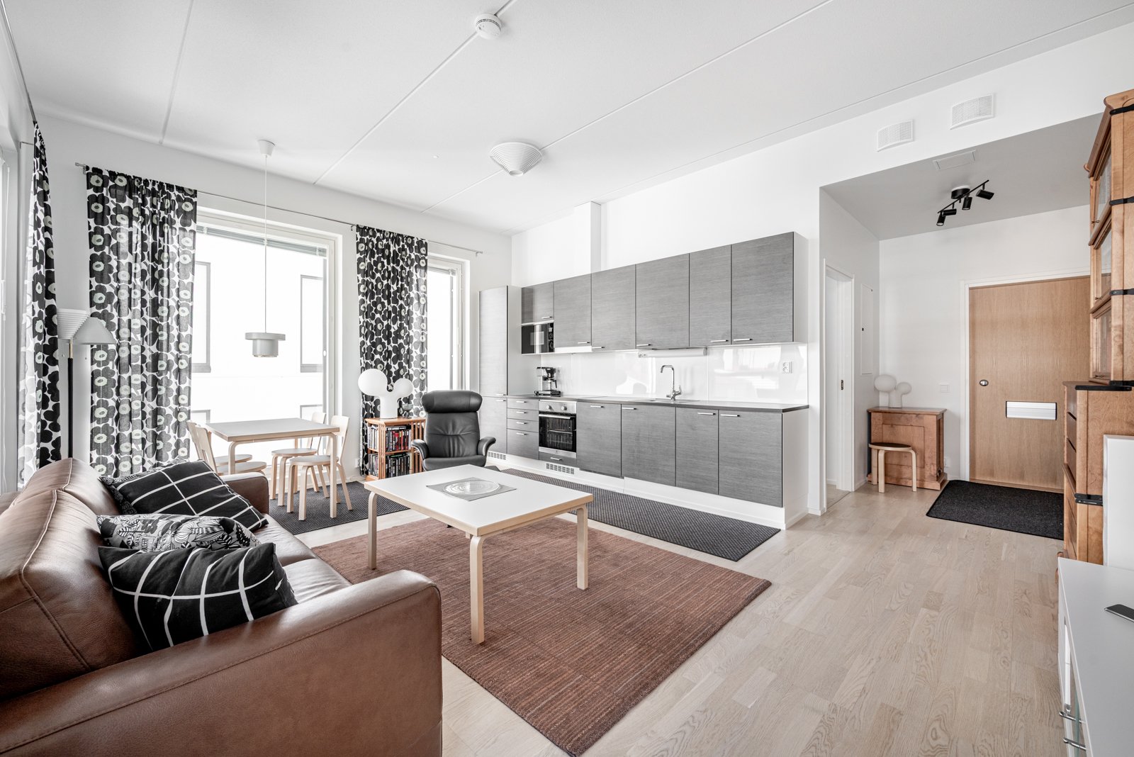 Asunnossa on tilava olohuone, johon mahtuu hyvin niin sohva kuin ruokailuryhmäkin. Avokeittiö on varustettu nykyaikaisilla kodinkoneilla, ja saunan löylyistä nautit oman kodin mukavuudessa. Koko huoneiston levyinen, luoteeseen avautuva lasitettu parveke tuo kotiin lisää tilaa ja toimii viihtyisänä oleskelutilana keväästä pitkälle syksyyn.