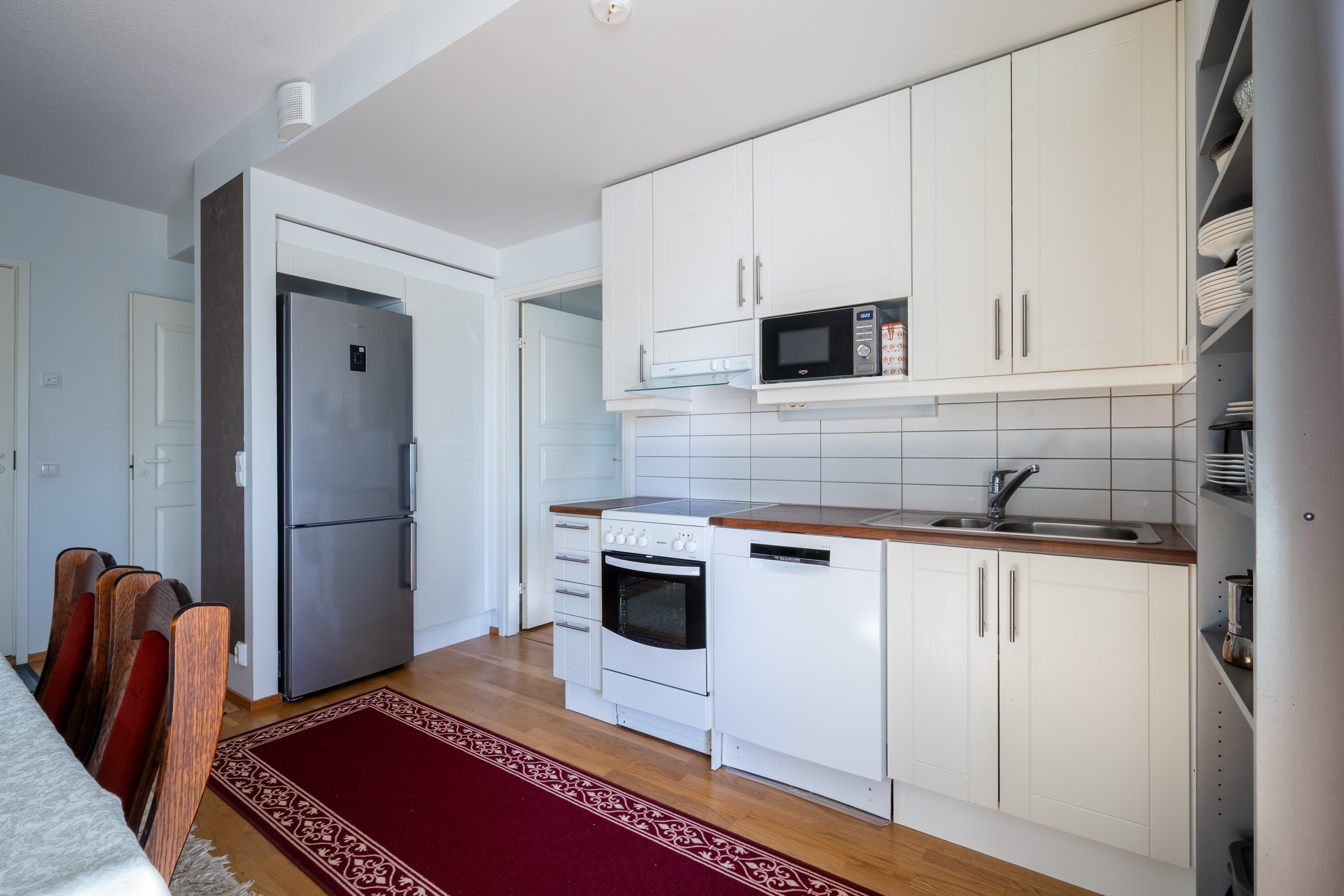 Asunnon avara olohuone yhdistyy saumattomasti keittiöön, jossa on kaikki tarpeelliset kodinkoneet. Kaksi makuuhuonetta tarjoavat tilaa perheelle tai työtilaksi. Kylpyhuoneessa on lattialämmitys, mikä tekee siitä erityisen miellyttävän. Asunnon materiaalit, kuten parkettilattiat ja maalatut seinät, luovat tyylikkään kokonaisuuden.