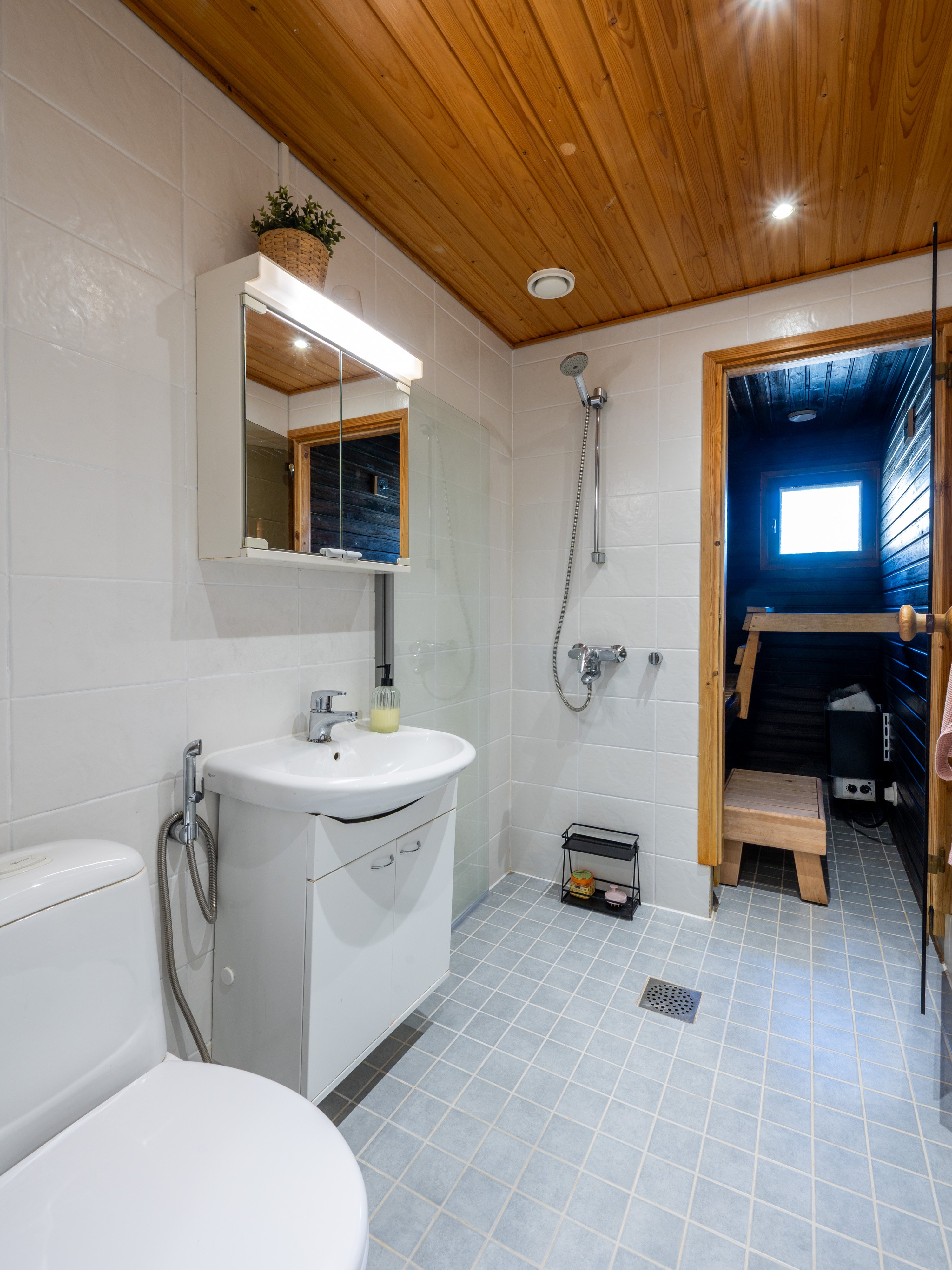 WC-istuin, lattialämmitys, peilikaappi, pesuallas, bidee-suihku ja suihku