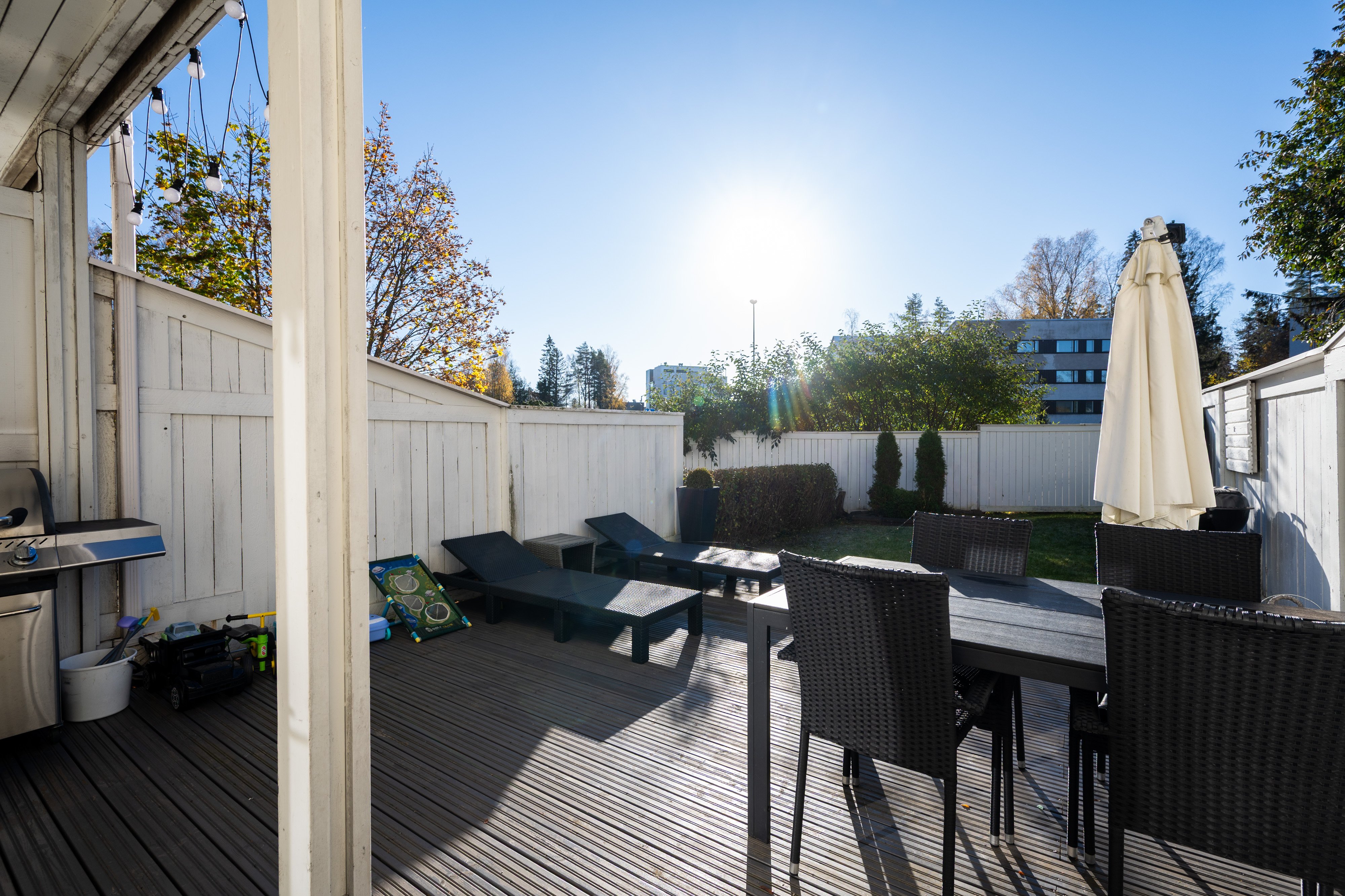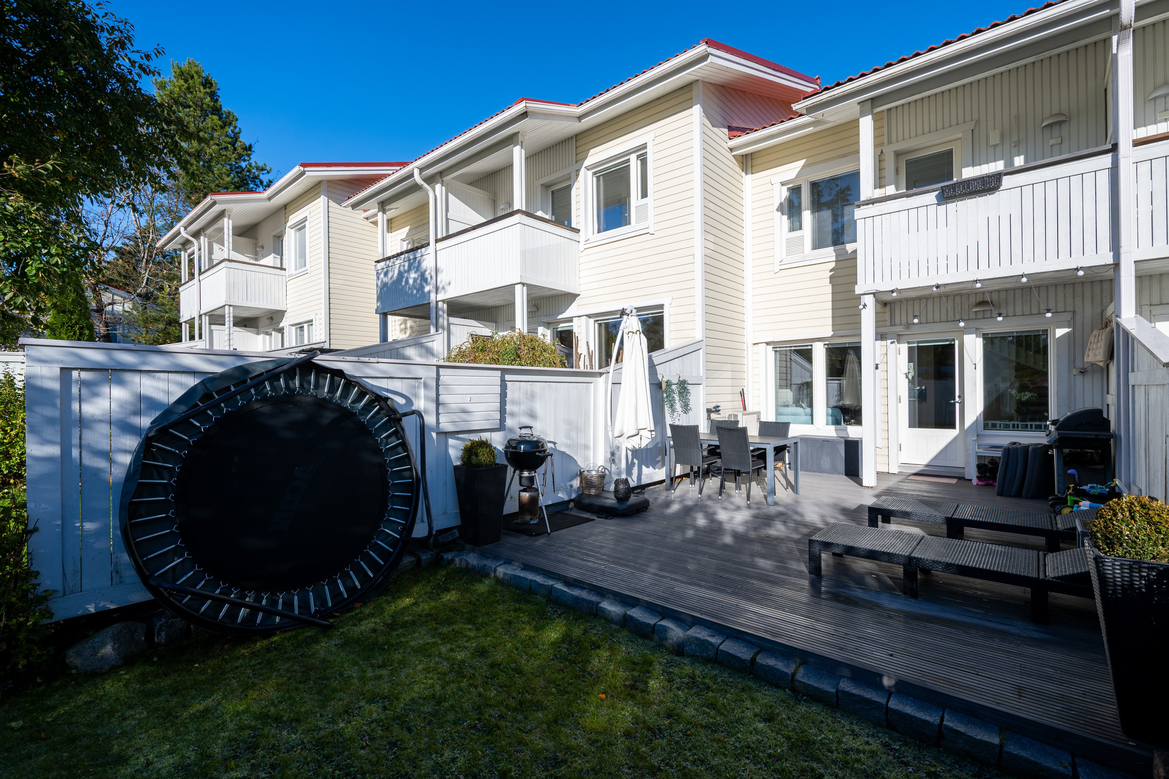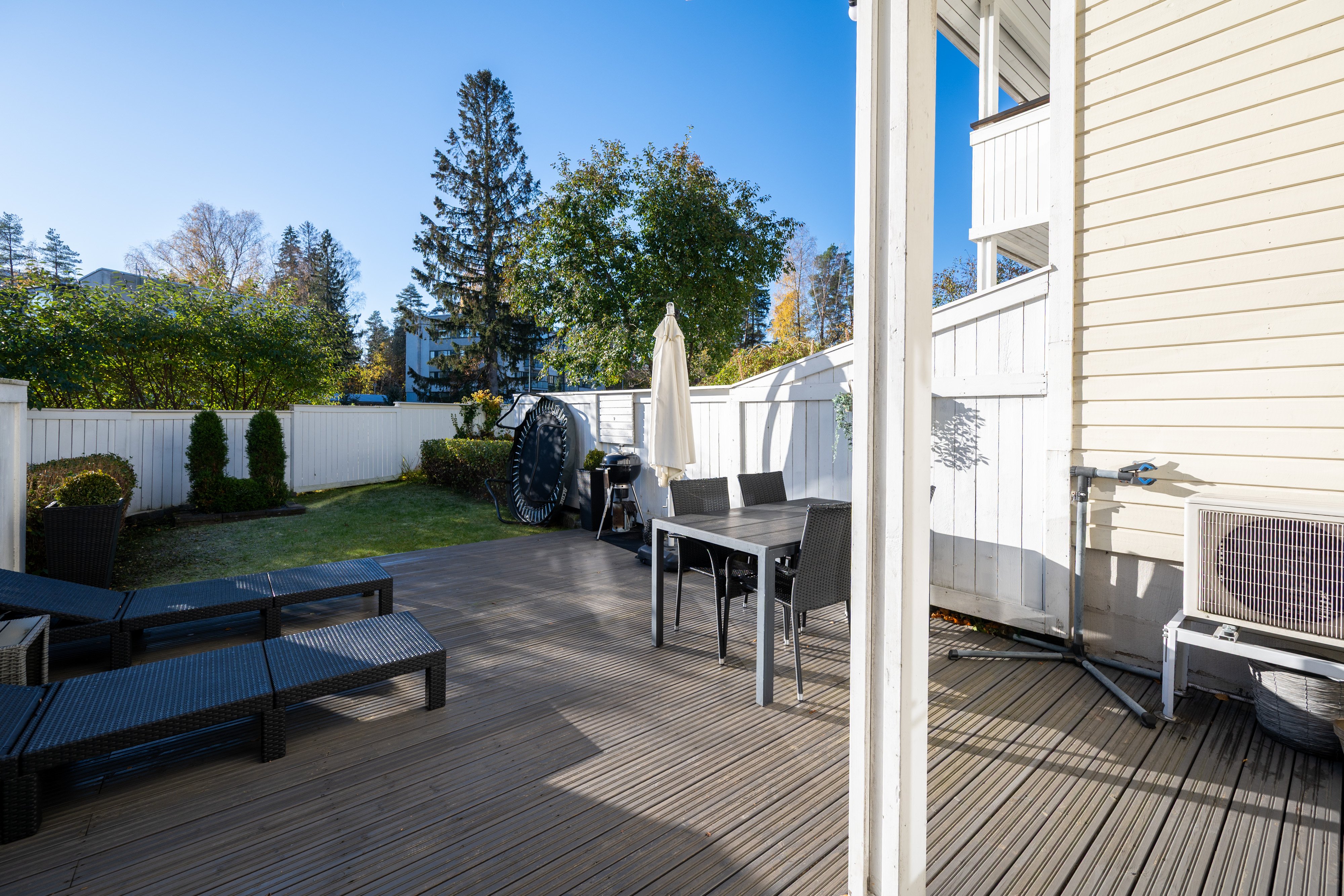 Oma piha-alue ja parveke tarjoavat mukavat ulkotilat, ja autopaikka sähköpistokkeella on käytettävissä. Liikenneyhteydet ovat erinomaiset: lähin bussipysäkki ja juna-asema ovat kävelyetäisyydellä, ja autolla pääsee sujuvasti liikkumaan.