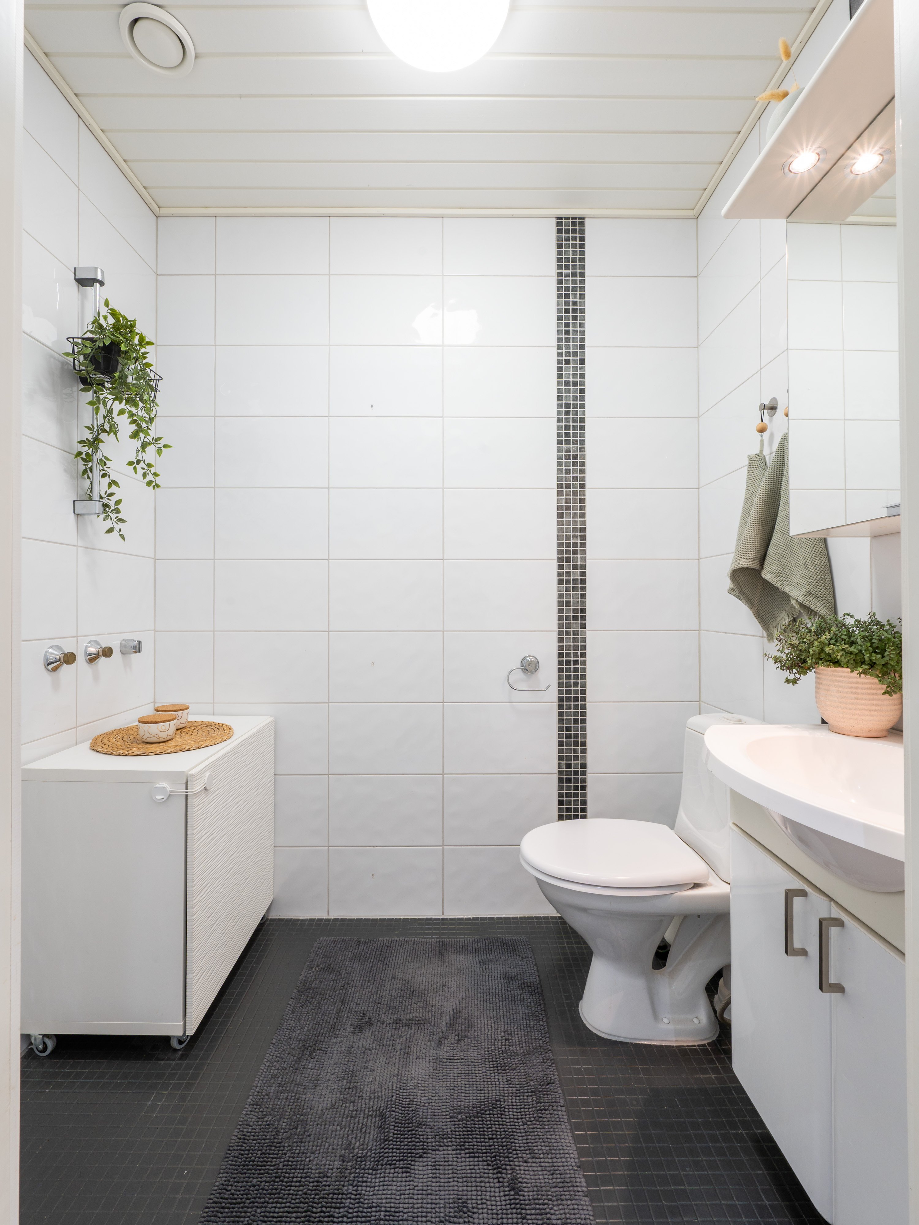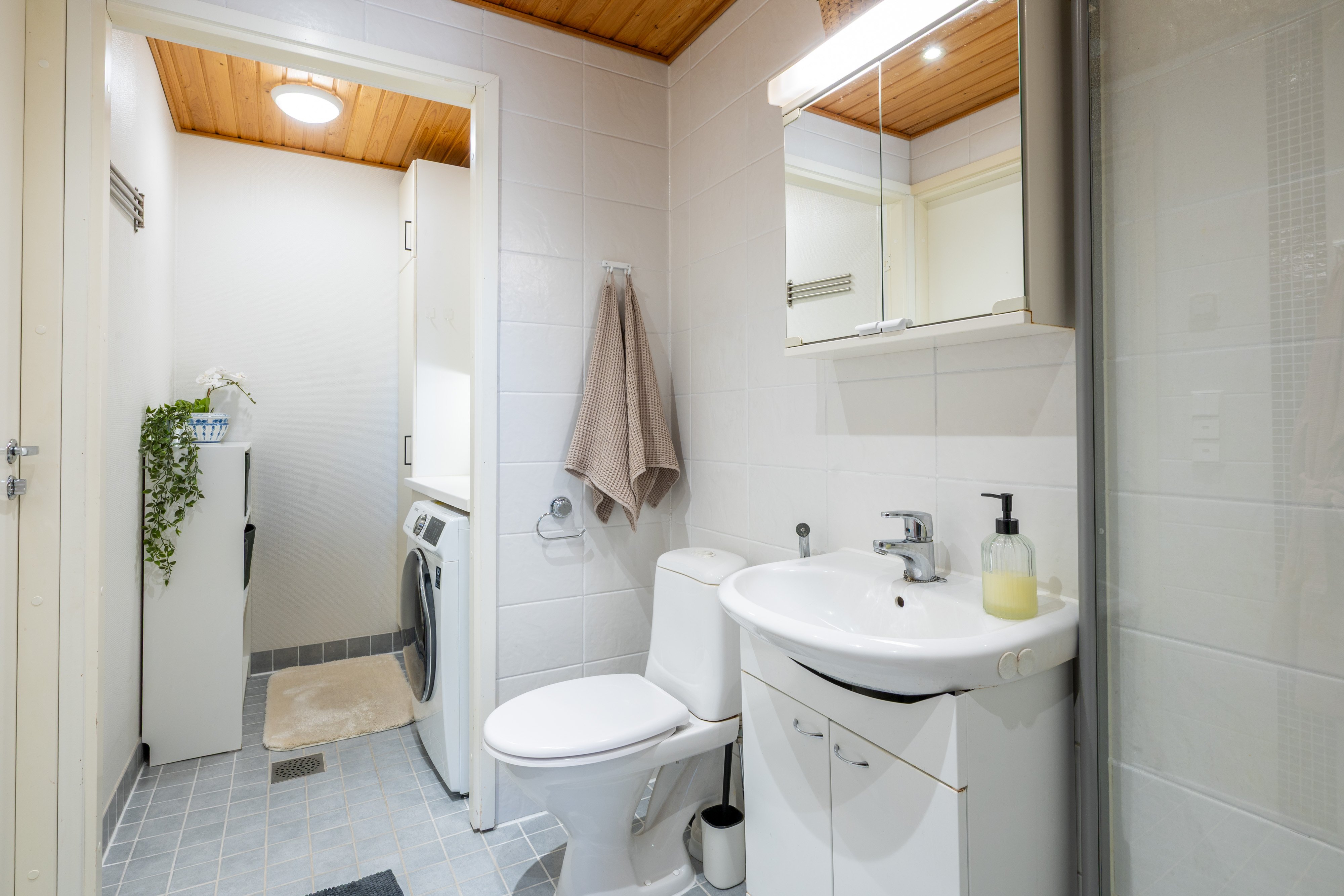 Lattialämmitys, pesukoneliitäntä, wc-istuin ja suihku