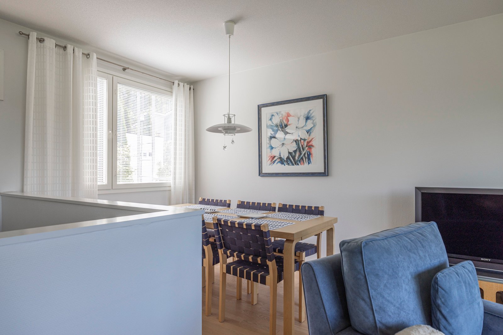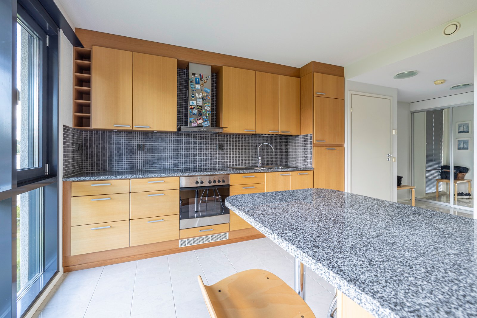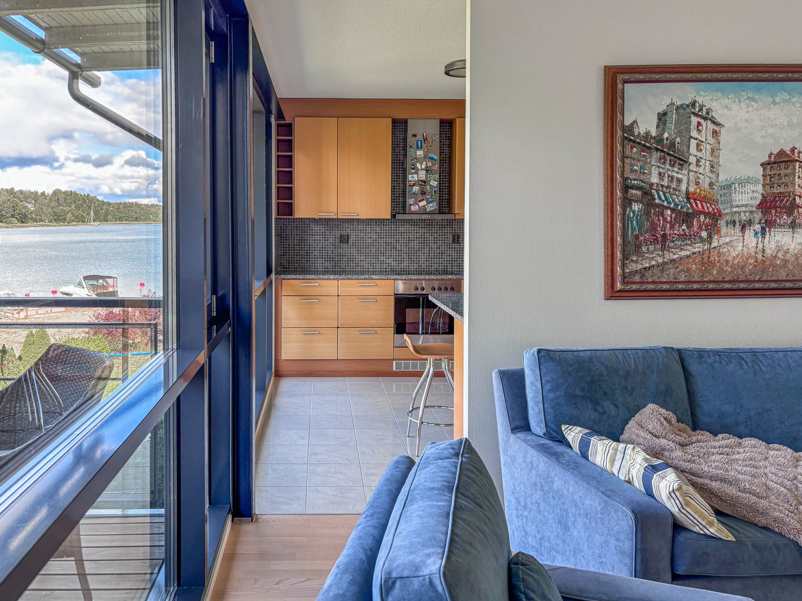Asunnon sydän on ehdottomasti takka ja avara olohuone, johon tulvii luonnonvaloa suurista ikkunoista, ja josta on käynti suoraan parvekkeelle ja merinäköalalle.