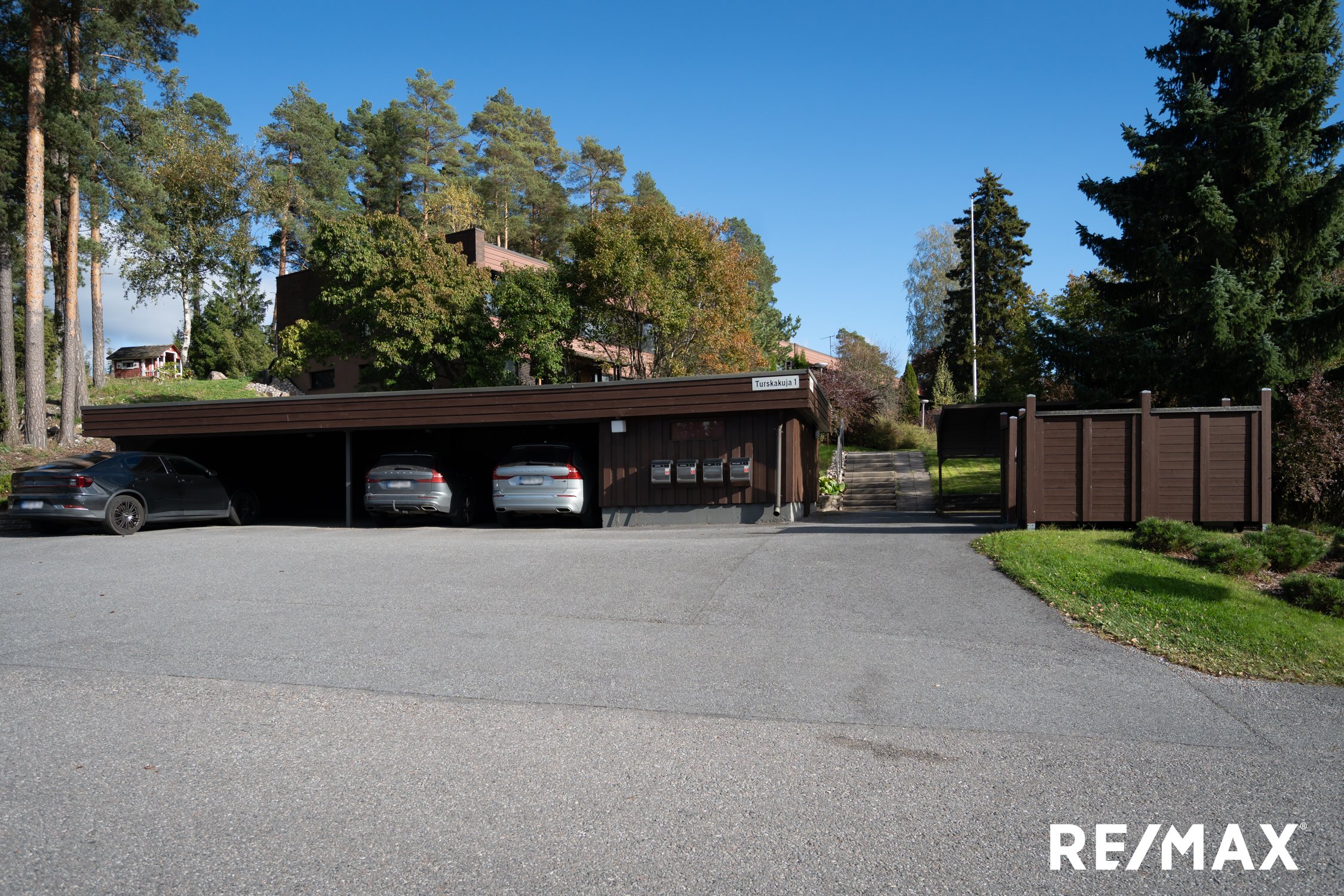 Asuntoon kuuluu yksi autokatos paikka sekä yksi piha paikka. Tuulikaapin vieressä on omalla sisäänkäynnillä tekninen tila/varasto. Yhtiöllä pihassa varasto, jossa jokainen voi säilyttää tavaroita joita ei voi sisälle viedä.