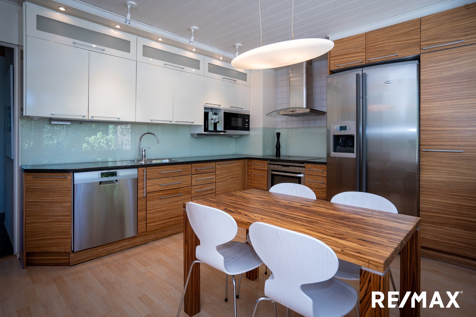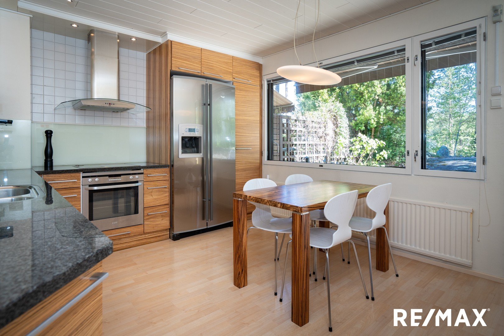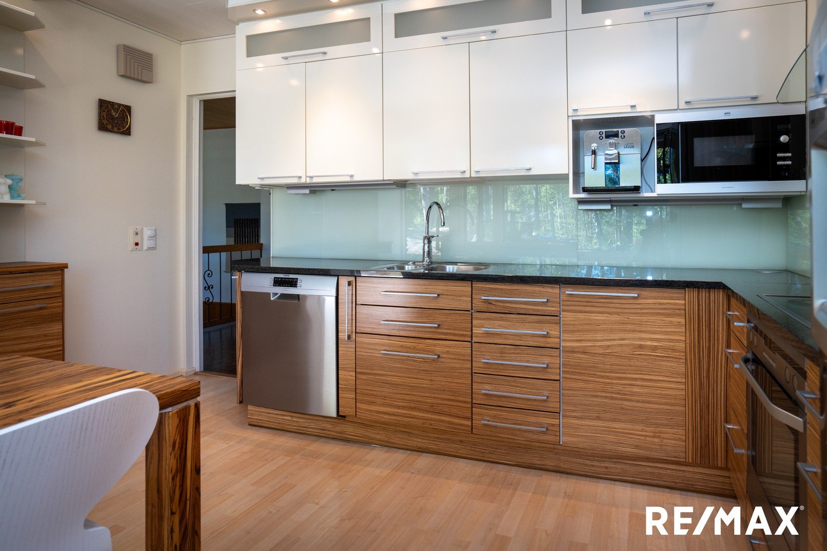 Kodin keittiössä on laadukkaat kodinkoneet sekä käytännöllinen kivitaso. Pakastimessa on jääpalakone ja vesi. Ikkuna avautuu metsään päin ja ovi takapihan patiolle. Keittiössä on kaappitilaa paljon.