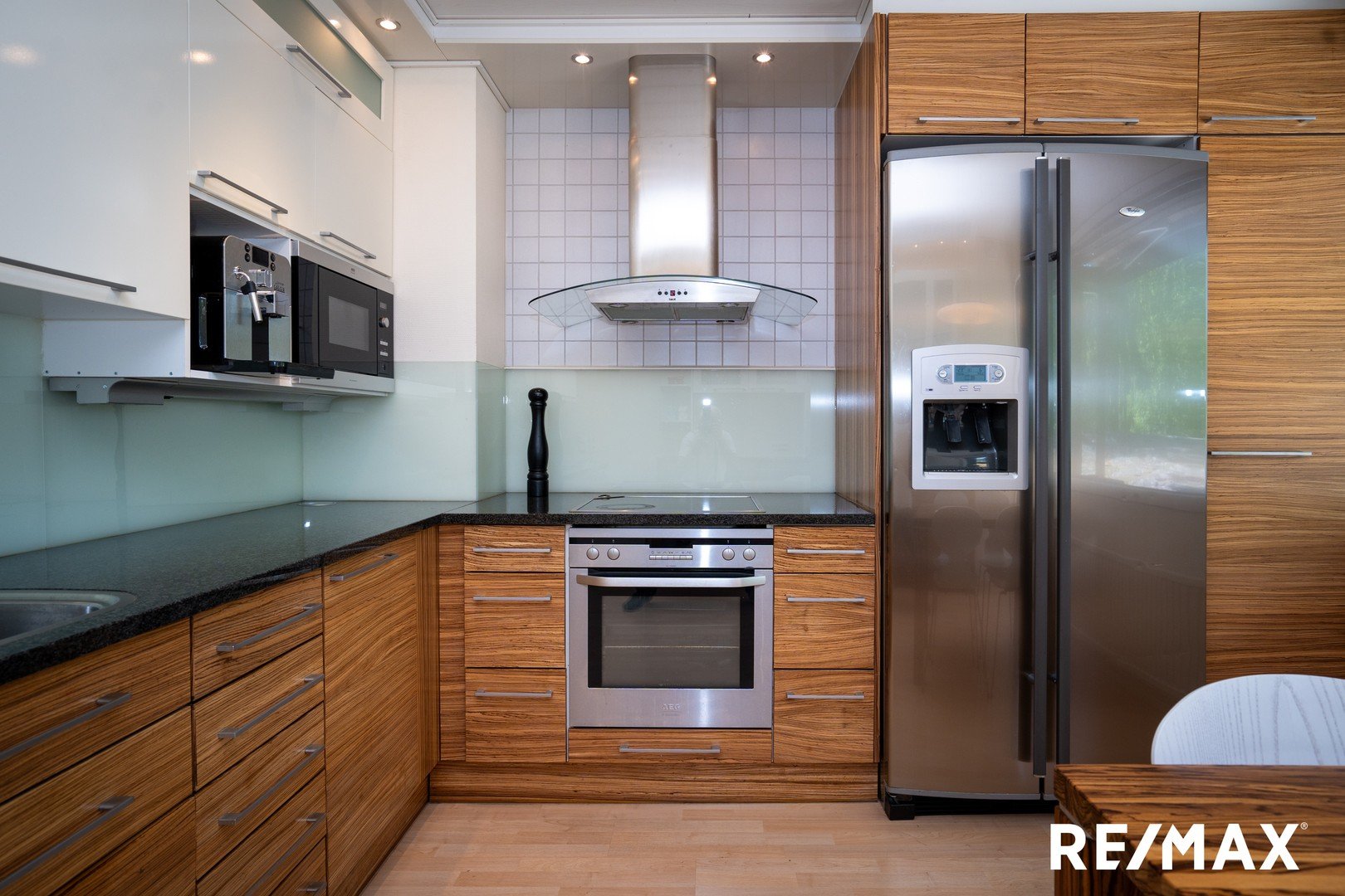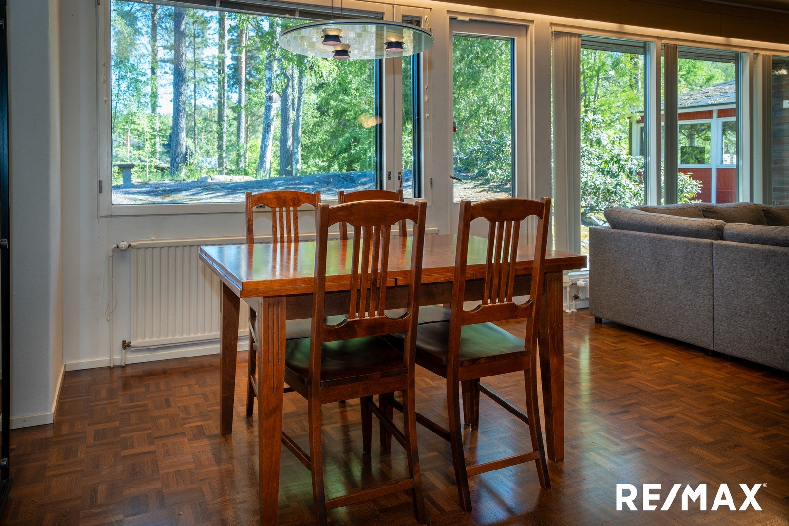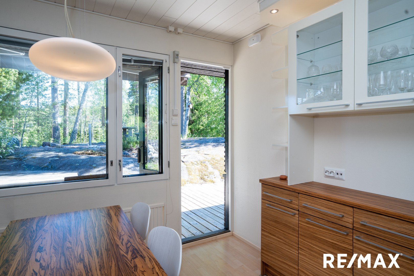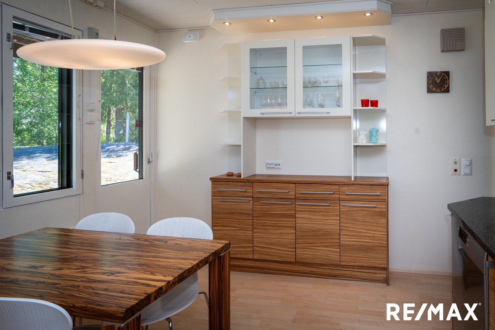Kodin keittiössä on laadukkaat kodinkoneet sekä käytännöllinen kivitaso. Pakastimessa on jääpalakone ja vesi. Ikkuna avautuu metsään päin ja ovi takapihan patiolle. Keittiössä on kaappitilaa paljon.