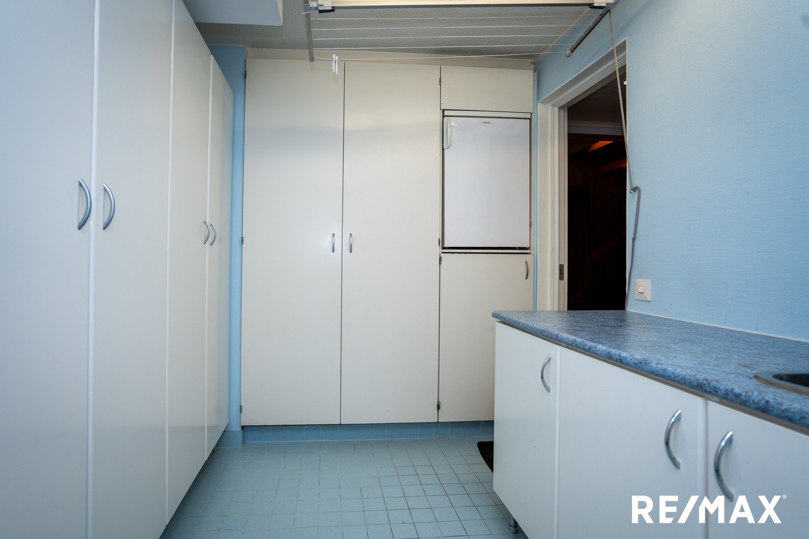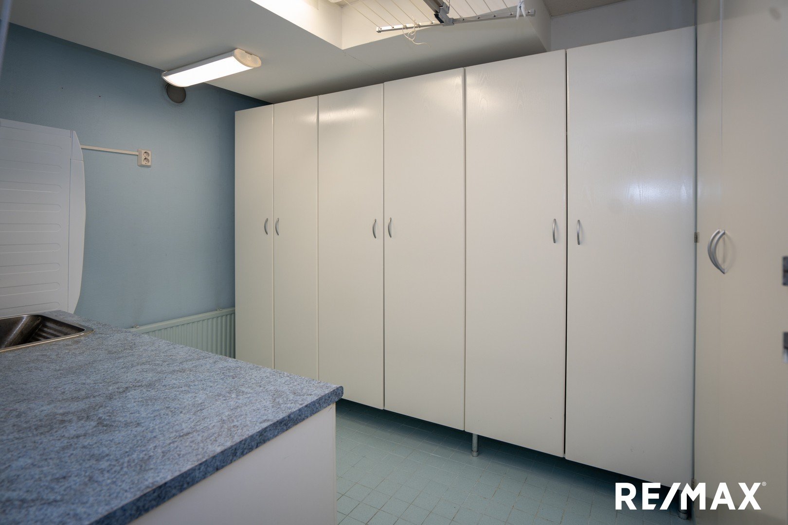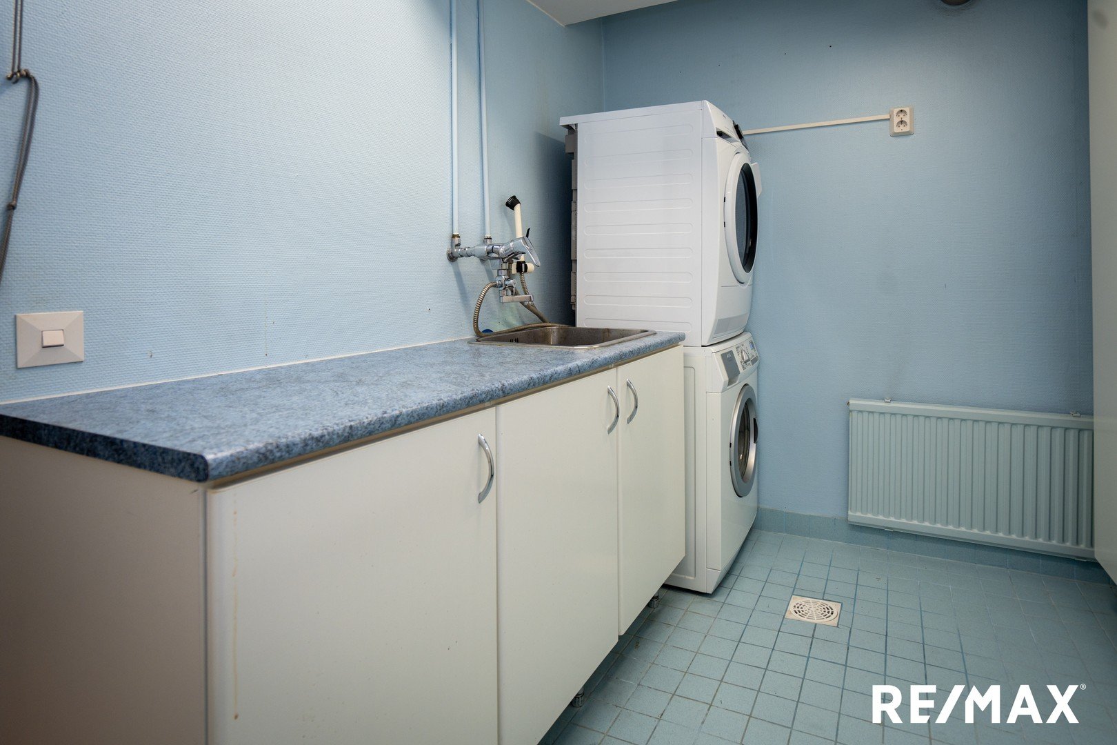 Tilavassa kodinhoitohuoneessa mahtuu selvittelemään isommankin porukan pyykkejä. Kodinhoitohuoneeseen mahtuu pesutorni ja siellä on jääkaappi saunajuomia varten.