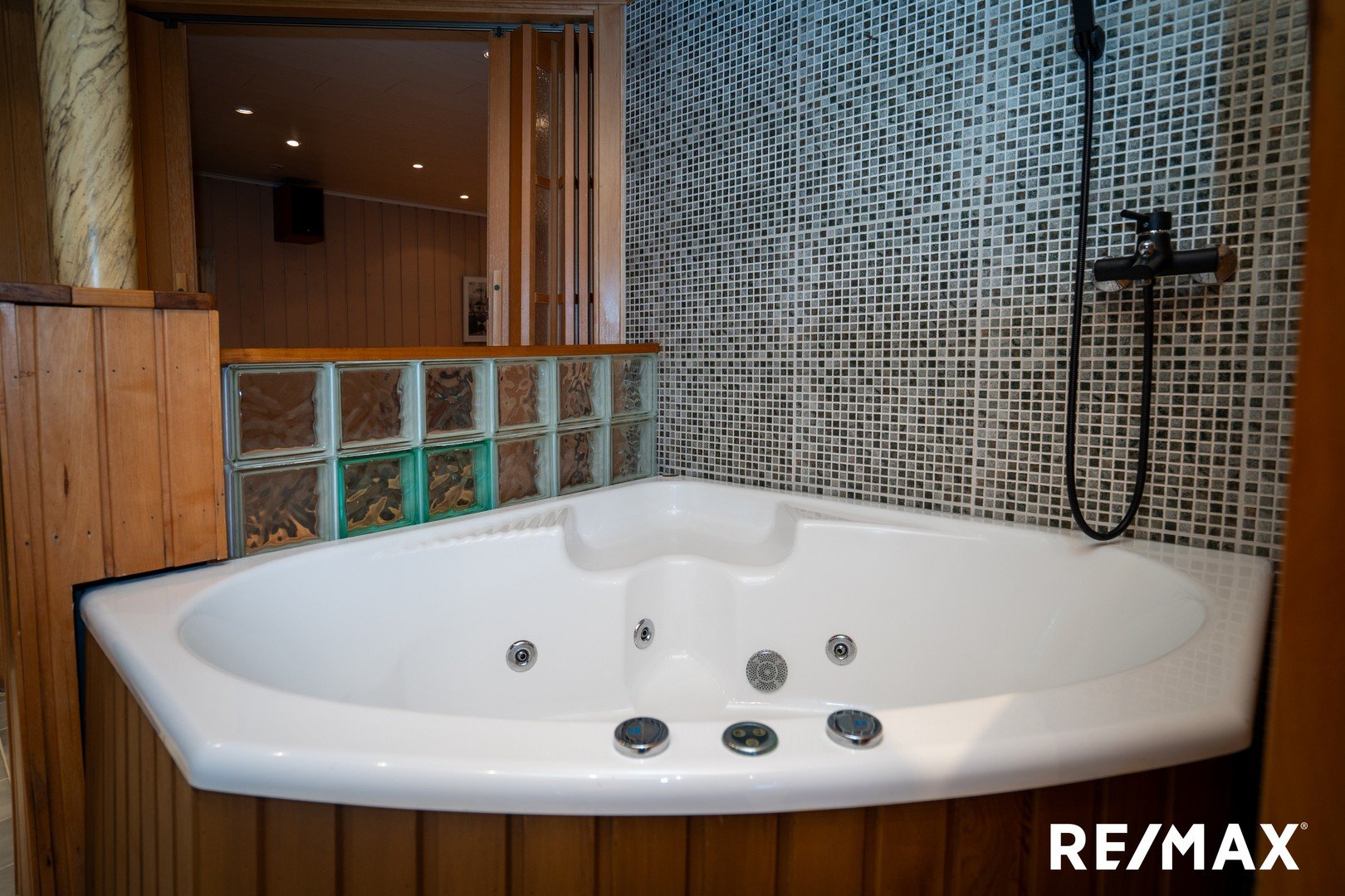 Saunassa voit nauttia musiikista, sillä siellä kaiuttimet. Voit käydä poreammeessa ja välillä altaassa uimassa ja altaaseen voi vaihtaa veden väriä, jos sininen kyllästyttää. Pesutilassa on kaksi suihkua ja katossa kauniit ledivalot.