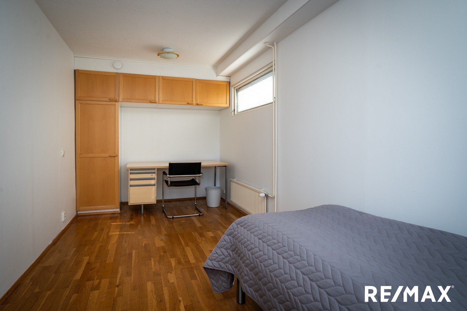 Yläkerrassa on kaksi makuuhuonetta ja toisessa makuuhuoneessa on pesuhuone ja erillinen wc tila ihan vieressä. Yksi makuuhuone sijaitsee alakerrassa. Asunto on kauniilla tavalla retro ja yläkertaan johtavat rappuset tuovat avaraan olohuoneeseen jossa on parkettilattia. Olohuoneeseen mahtuu iso ruokailuryhmä ja olohuoneessa pääsee ulos takapihalle.