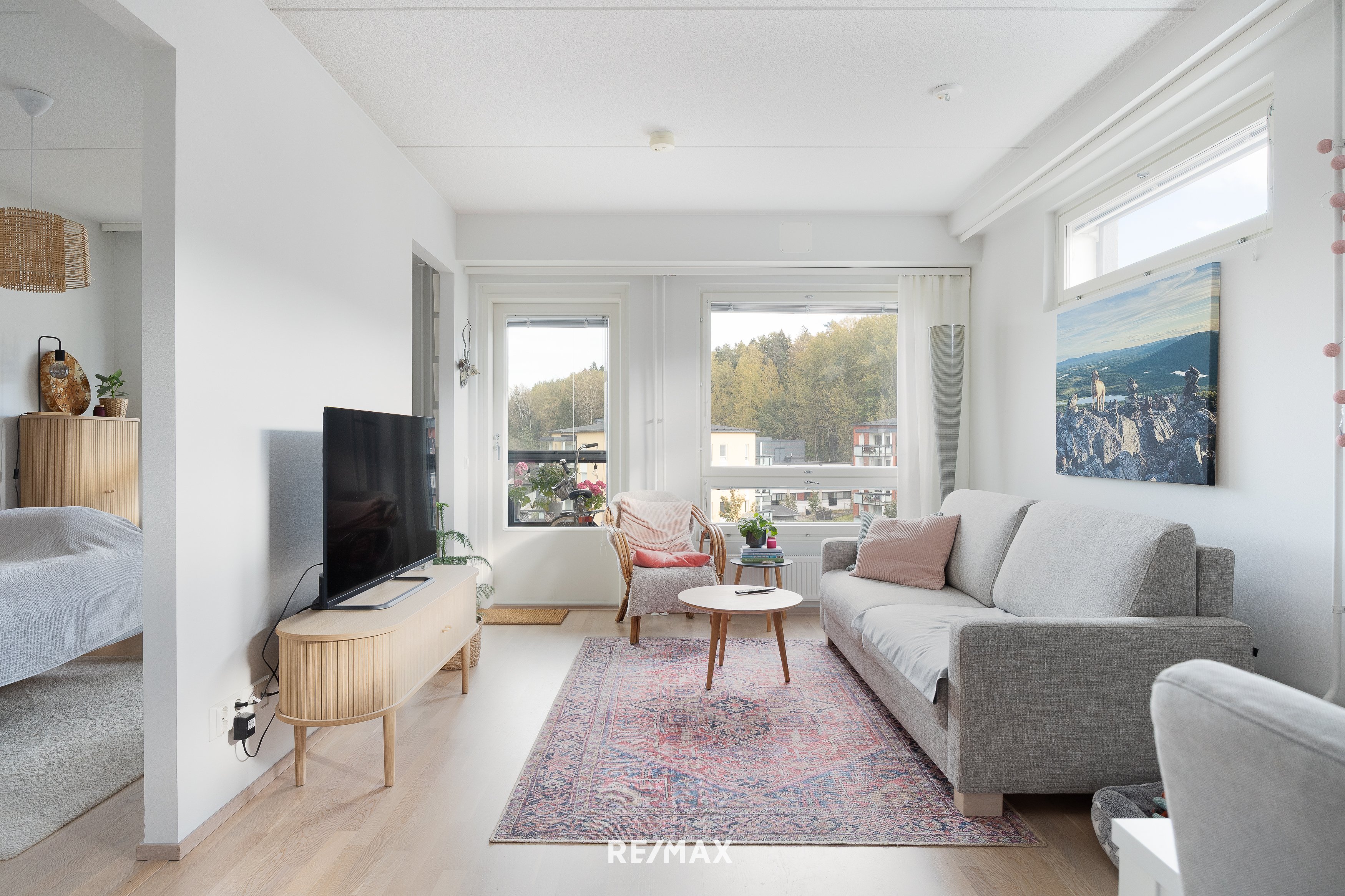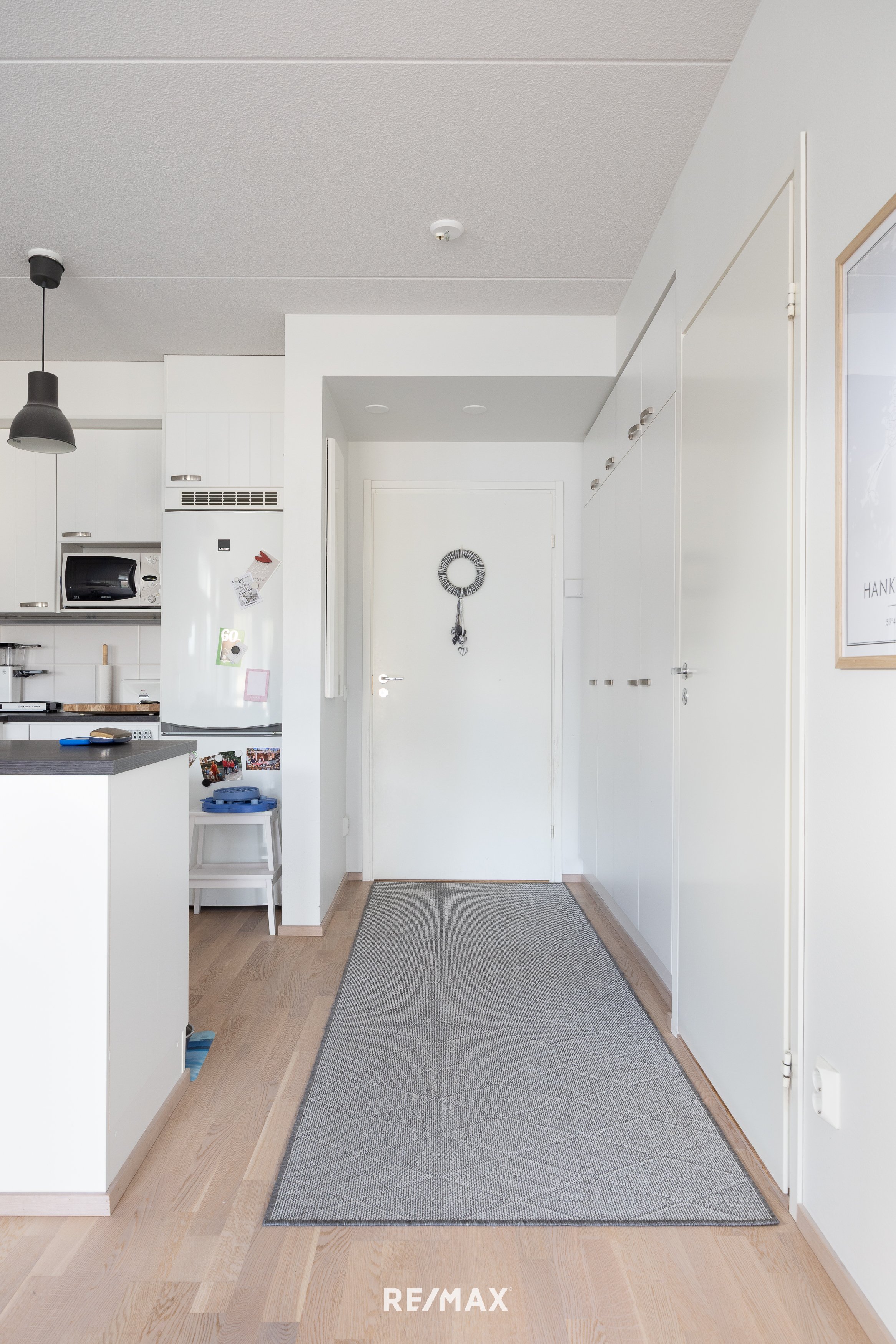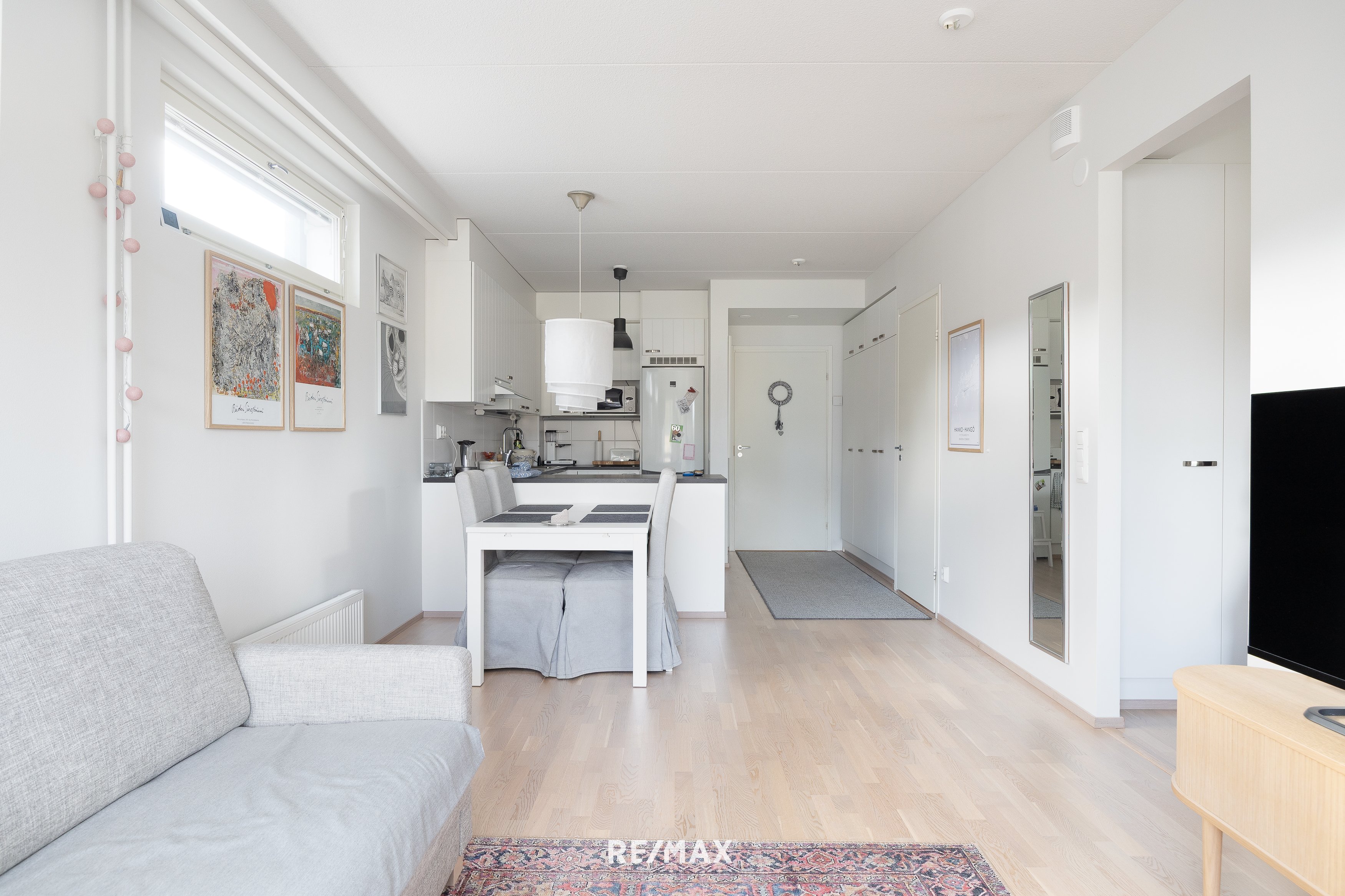 Pohjaratkaisu on toimiva ja kodikas: Makuuhuone on yhteydessä olohuoneeseen kahdella oviaukolla, tuoden asuntoon mukavasti lisää valoisuutta. Avara olohuone yhdistyy saumattomasti keittiötilaan, luoden kutsuvan tilan yhdessäoloon ja rentoutumiseen. Parveke toimii loistavasti lisäoleskelutilana keväästä syksyyn.
