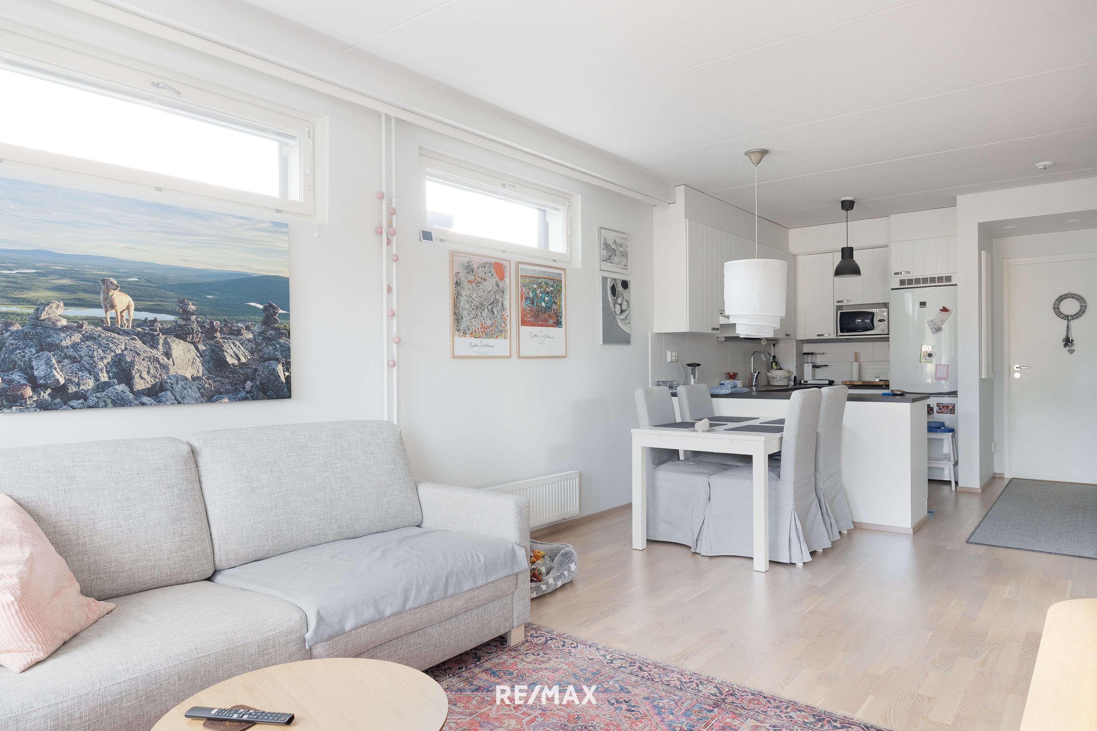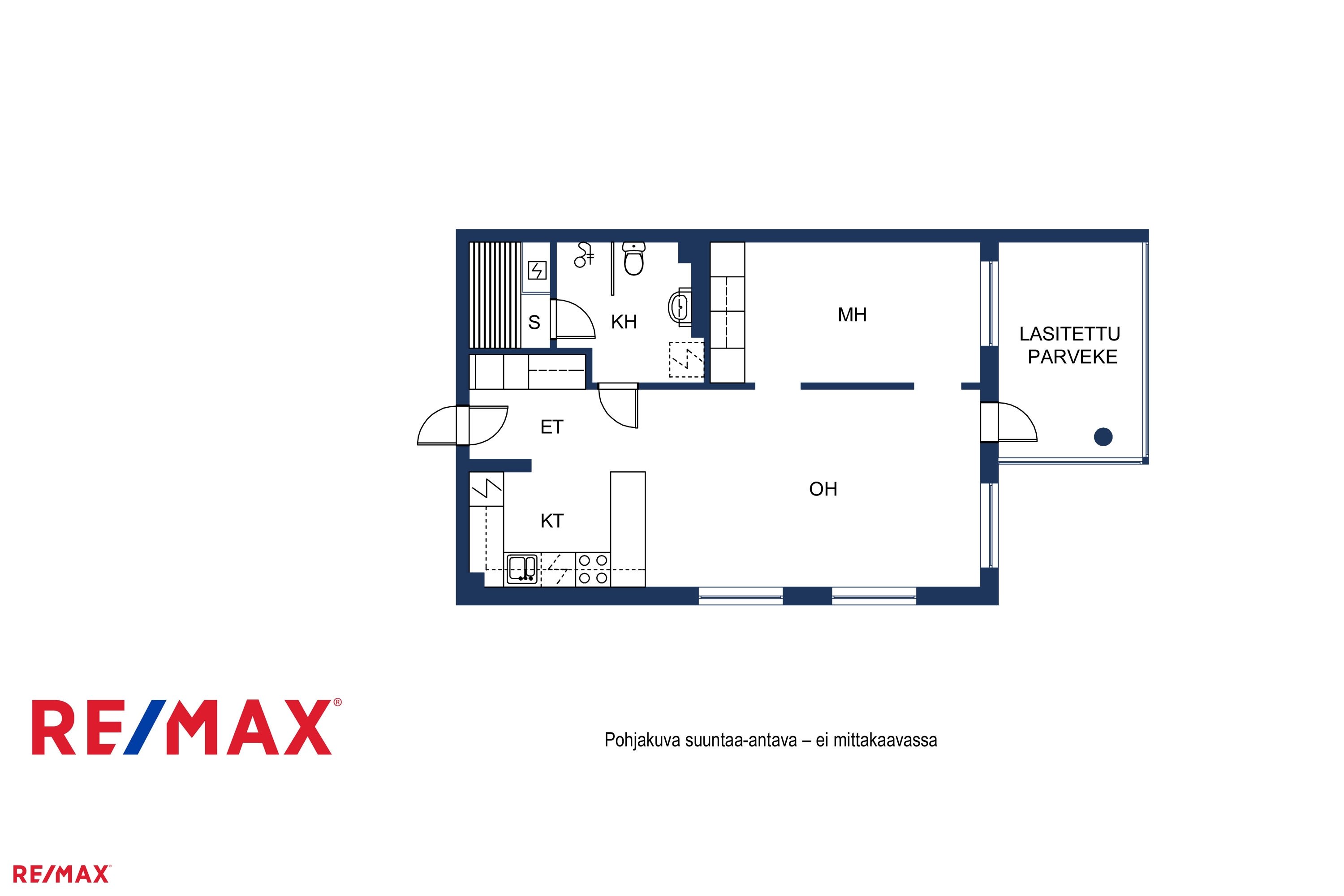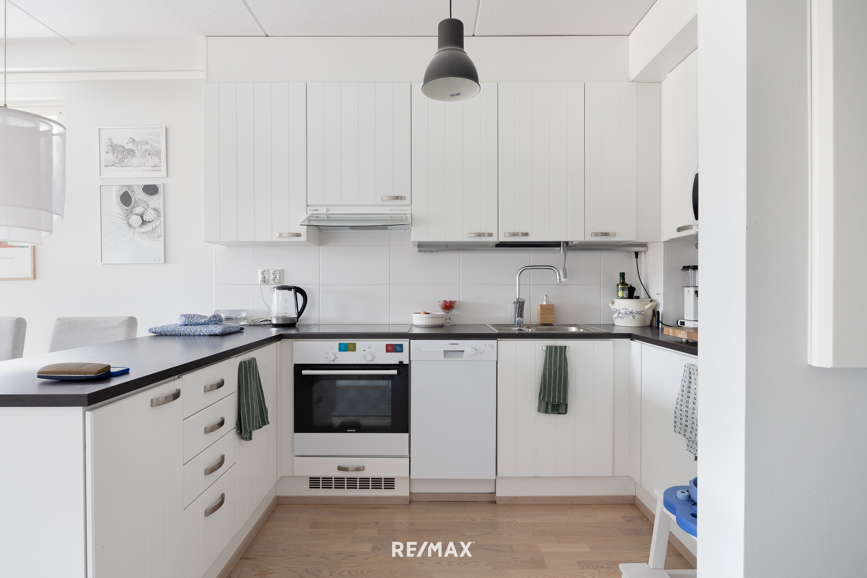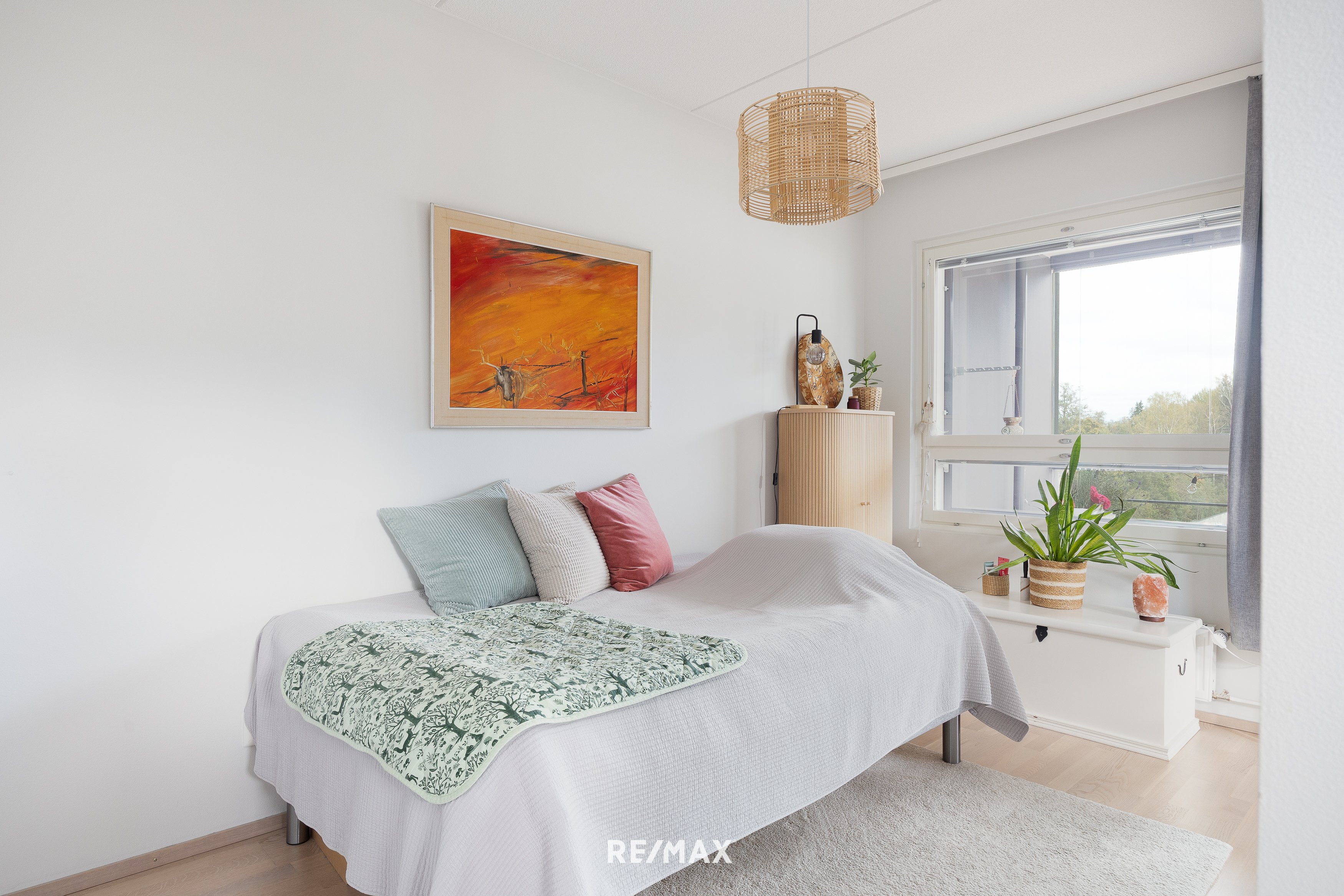 Pohjaratkaisu on toimiva ja kodikas: Makuuhuone on yhteydessä olohuoneeseen kahdella oviaukolla, tuoden asuntoon mukavasti lisää valoisuutta. Avara olohuone yhdistyy saumattomasti keittiötilaan, luoden kutsuvan tilan yhdessäoloon ja rentoutumiseen. Parveke toimii loistavasti lisäoleskelutilana keväästä syksyyn.