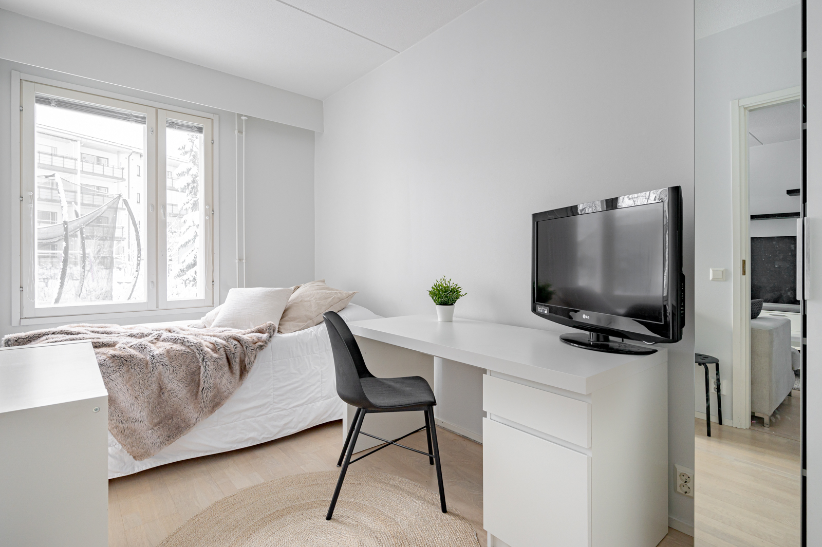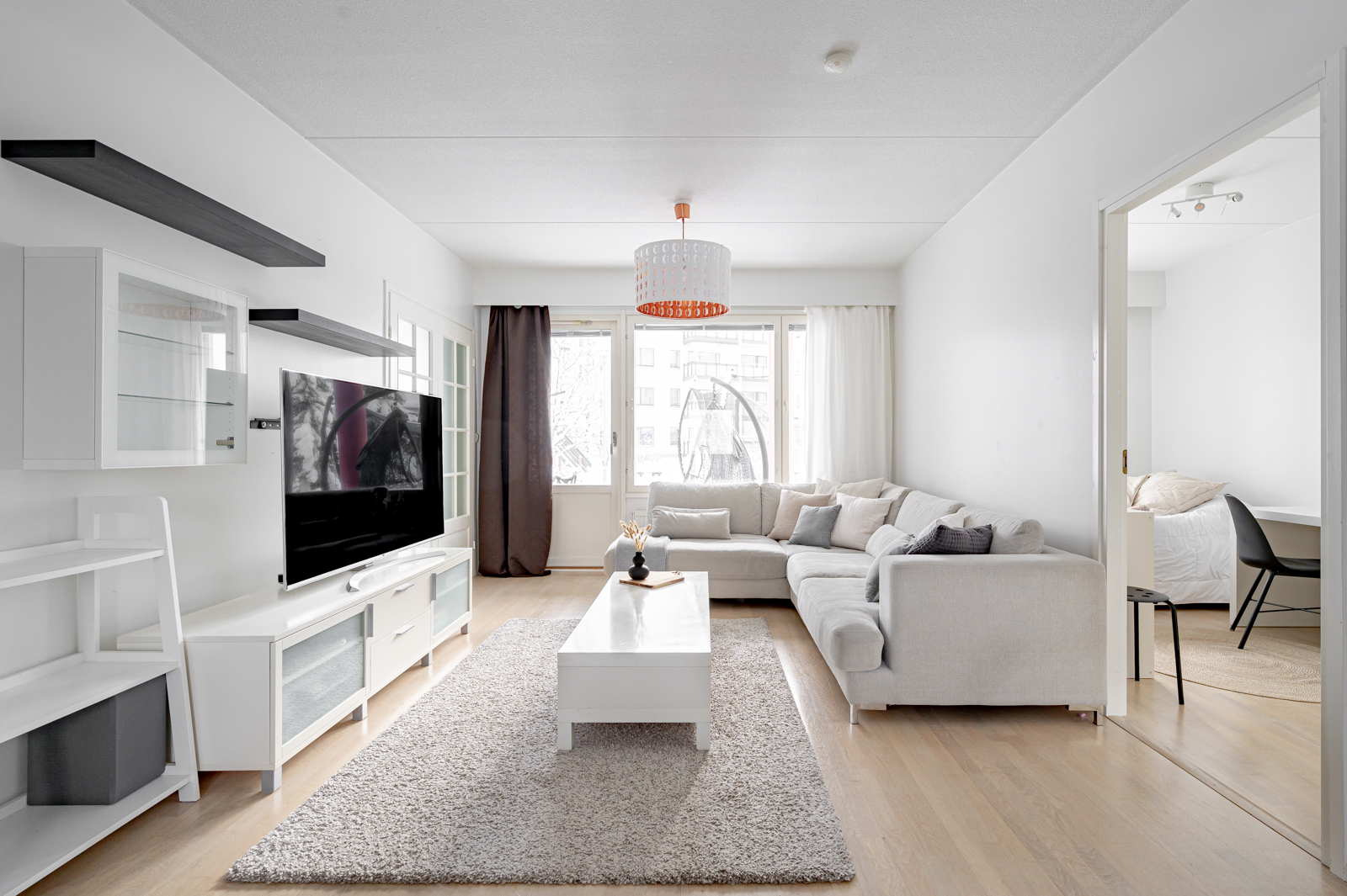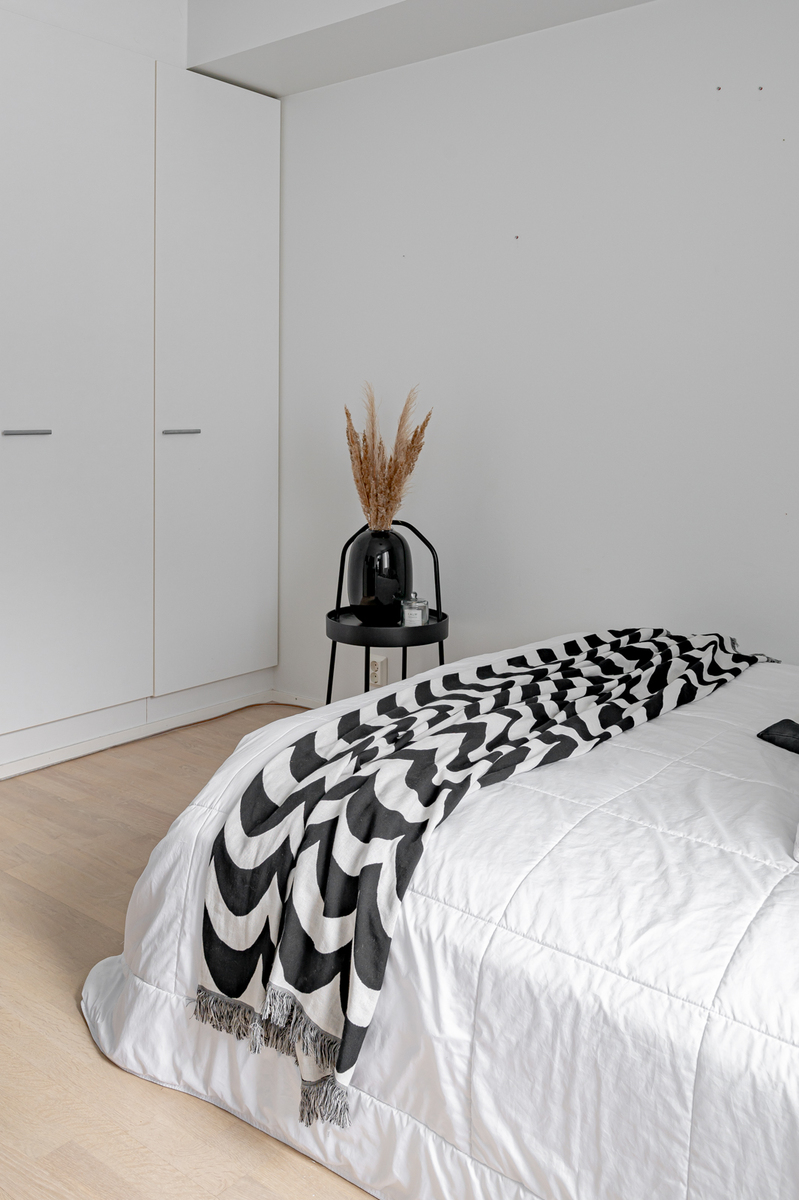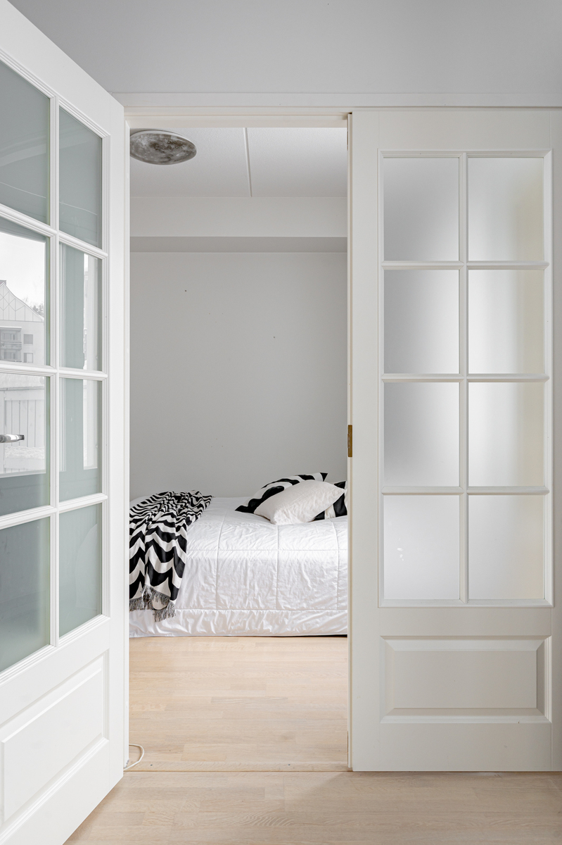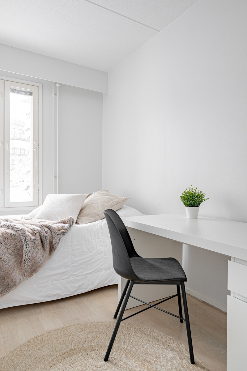Pohja on erittäin käytännöllinen ilman hukkaneliöitä. Kahteen makuuhuoneeseen on suunniteltu sopivasti säilytystilaa ja isoista ikkunoista virtaa mukavasti valoa.