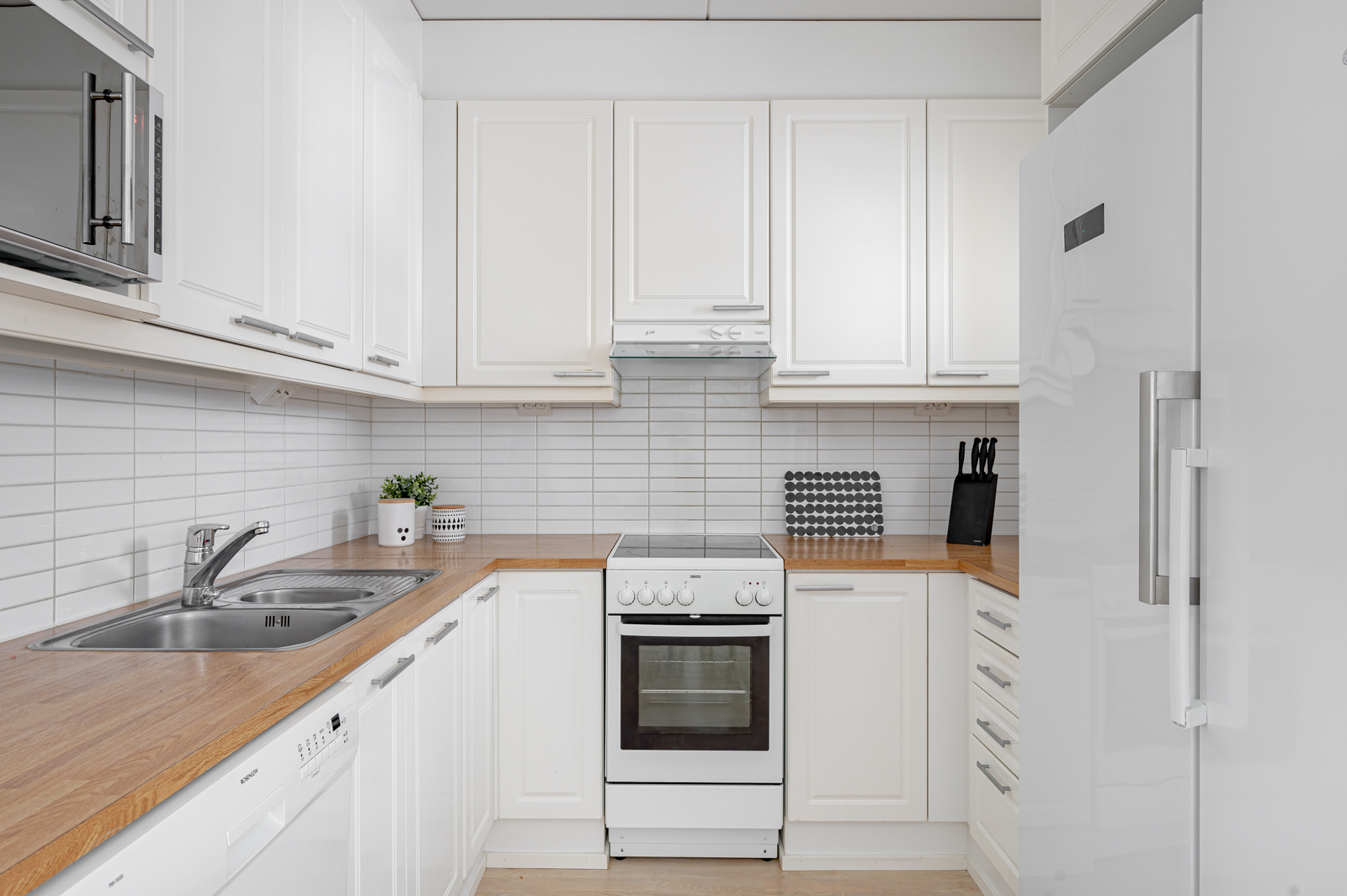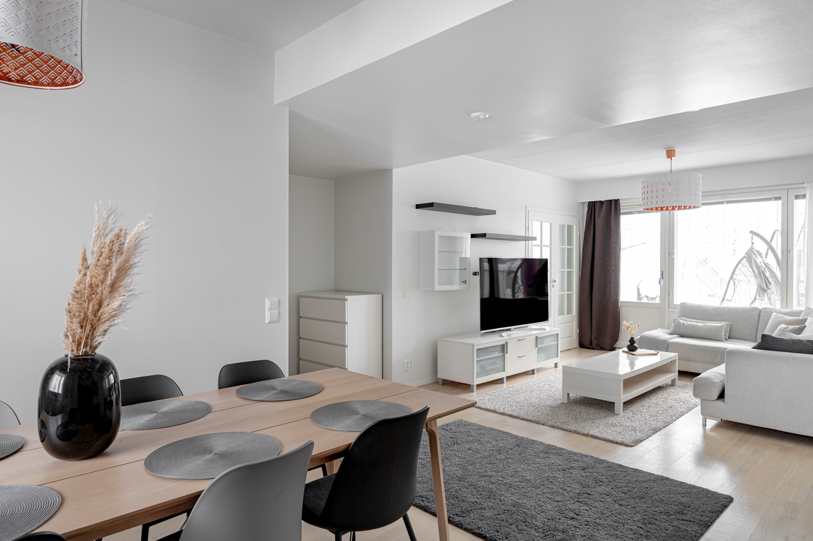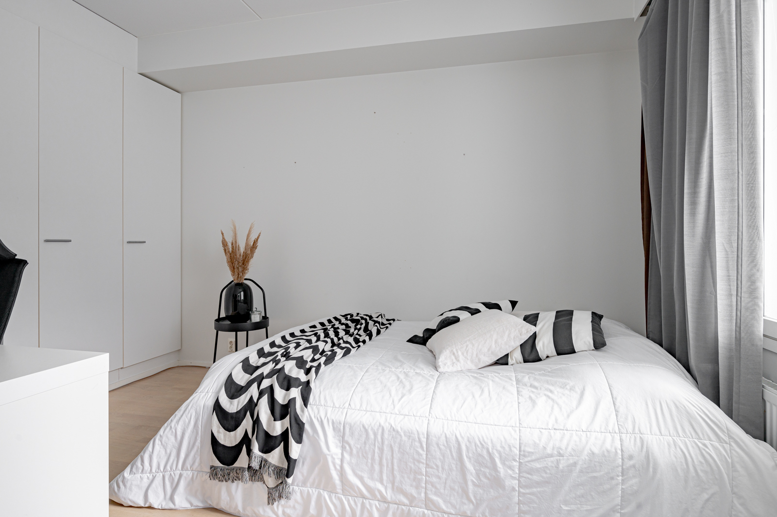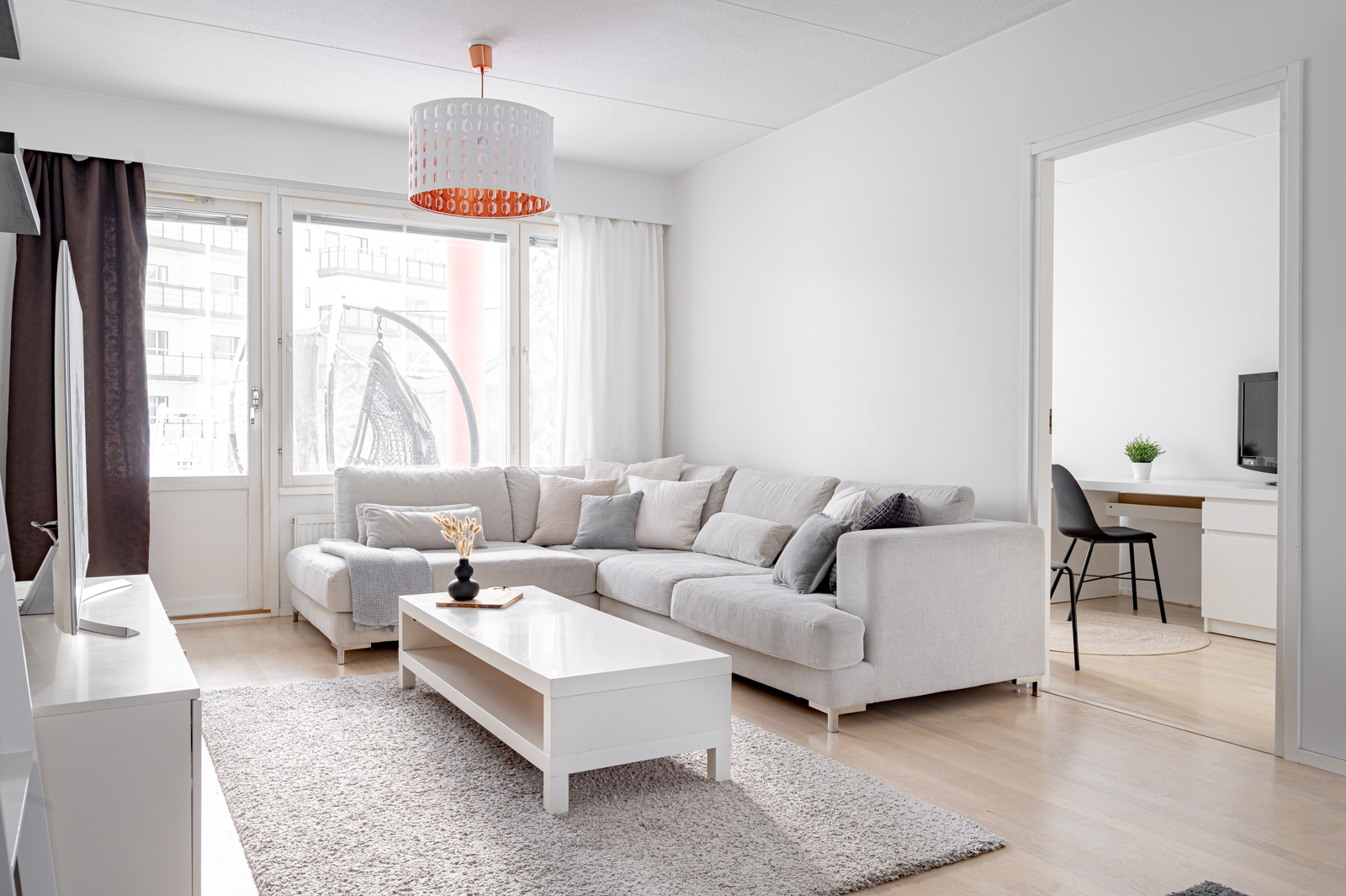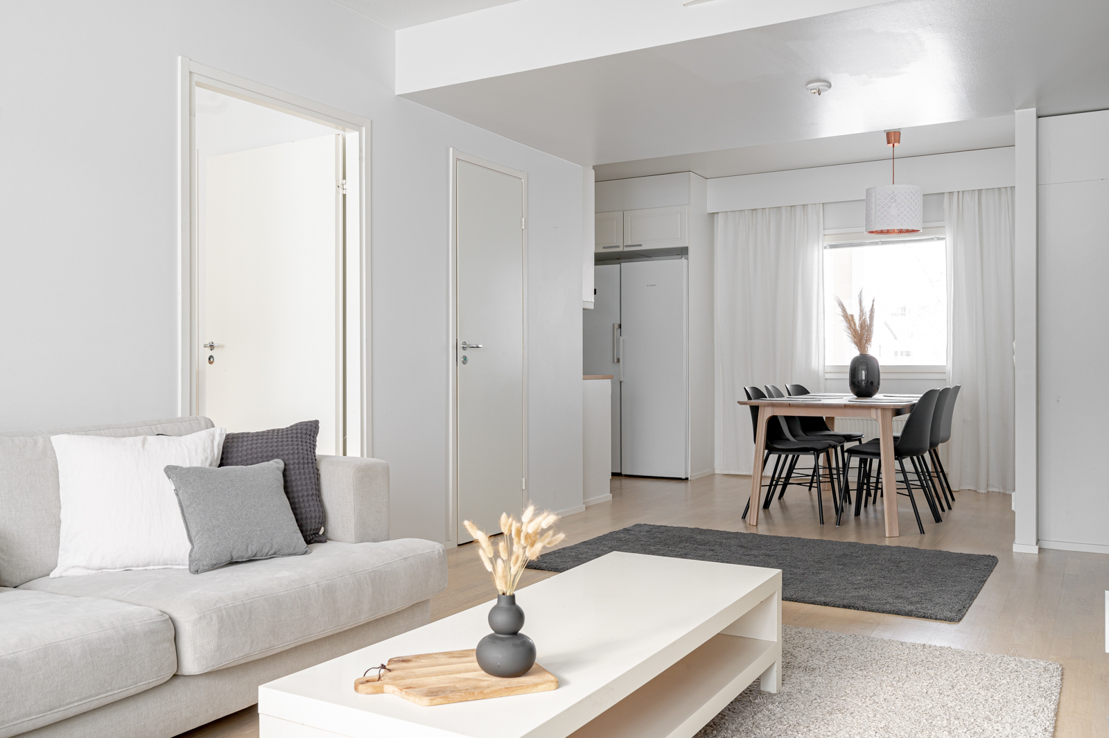 Pohja on erittäin käytännöllinen ilman hukkaneliöitä. Kahteen makuuhuoneeseen on suunniteltu sopivasti säilytystilaa ja isoista ikkunoista virtaa mukavasti valoa.