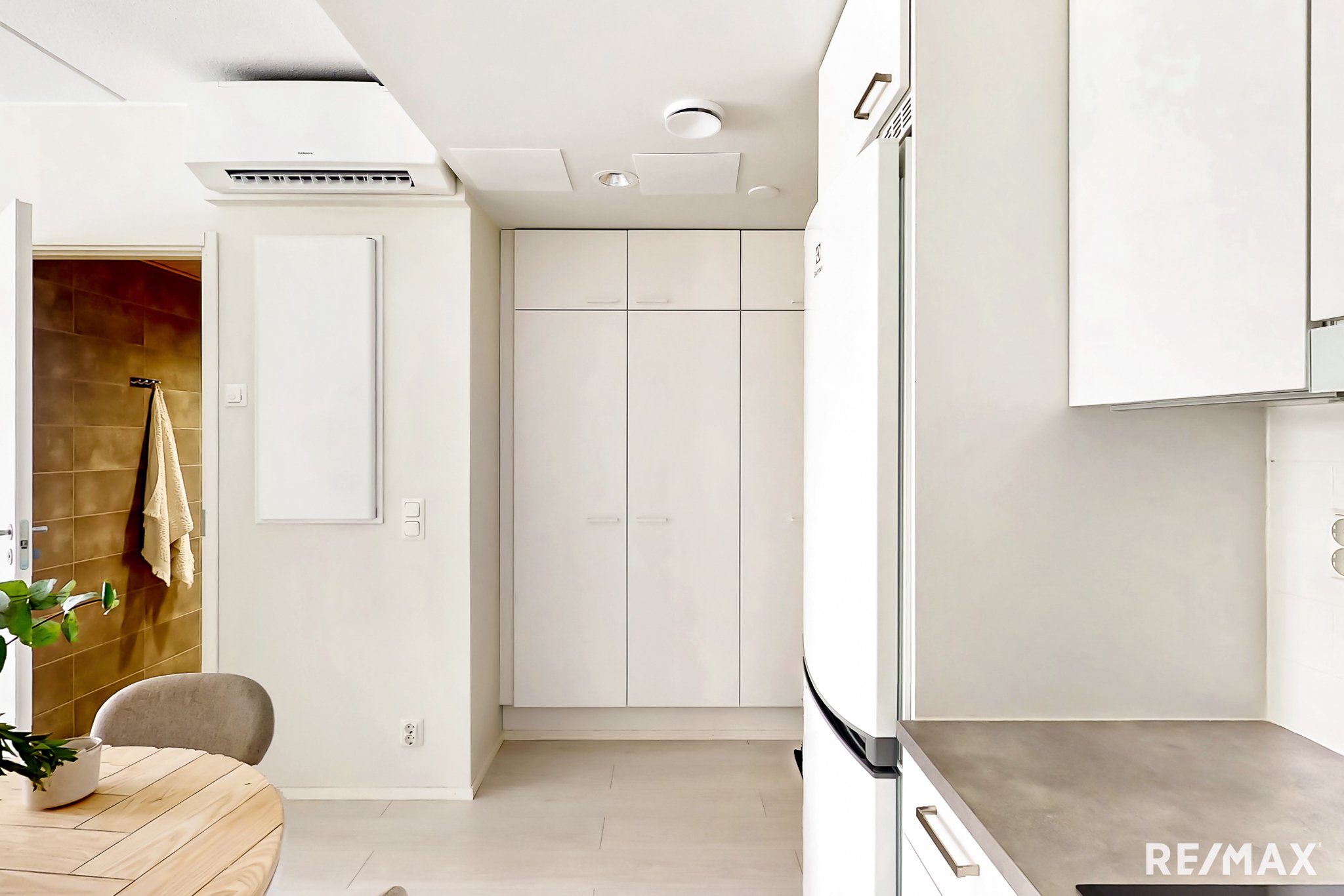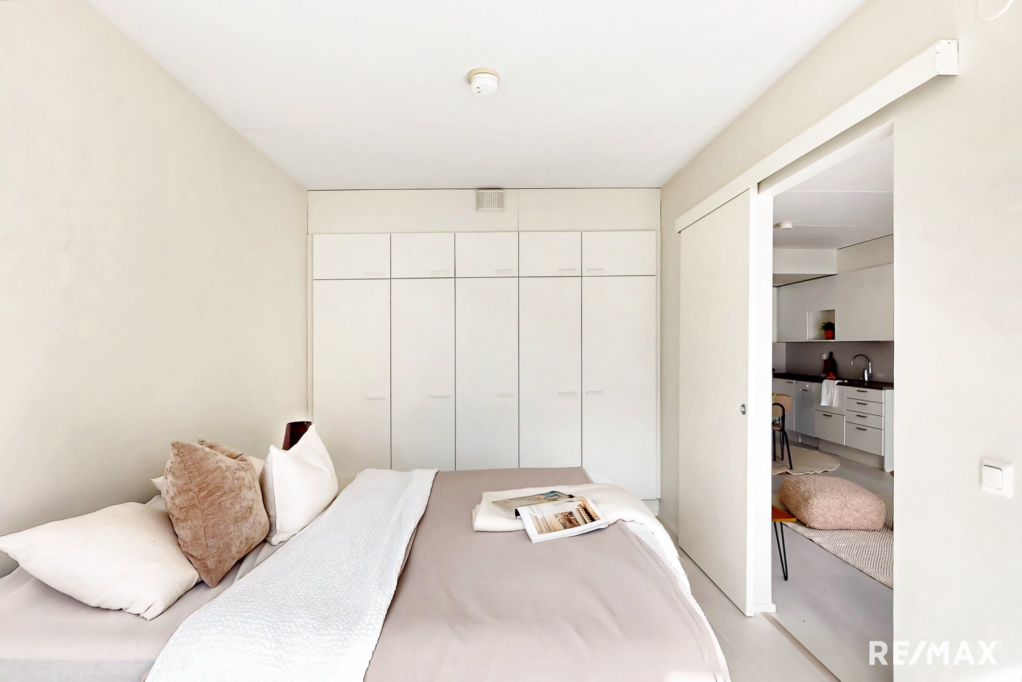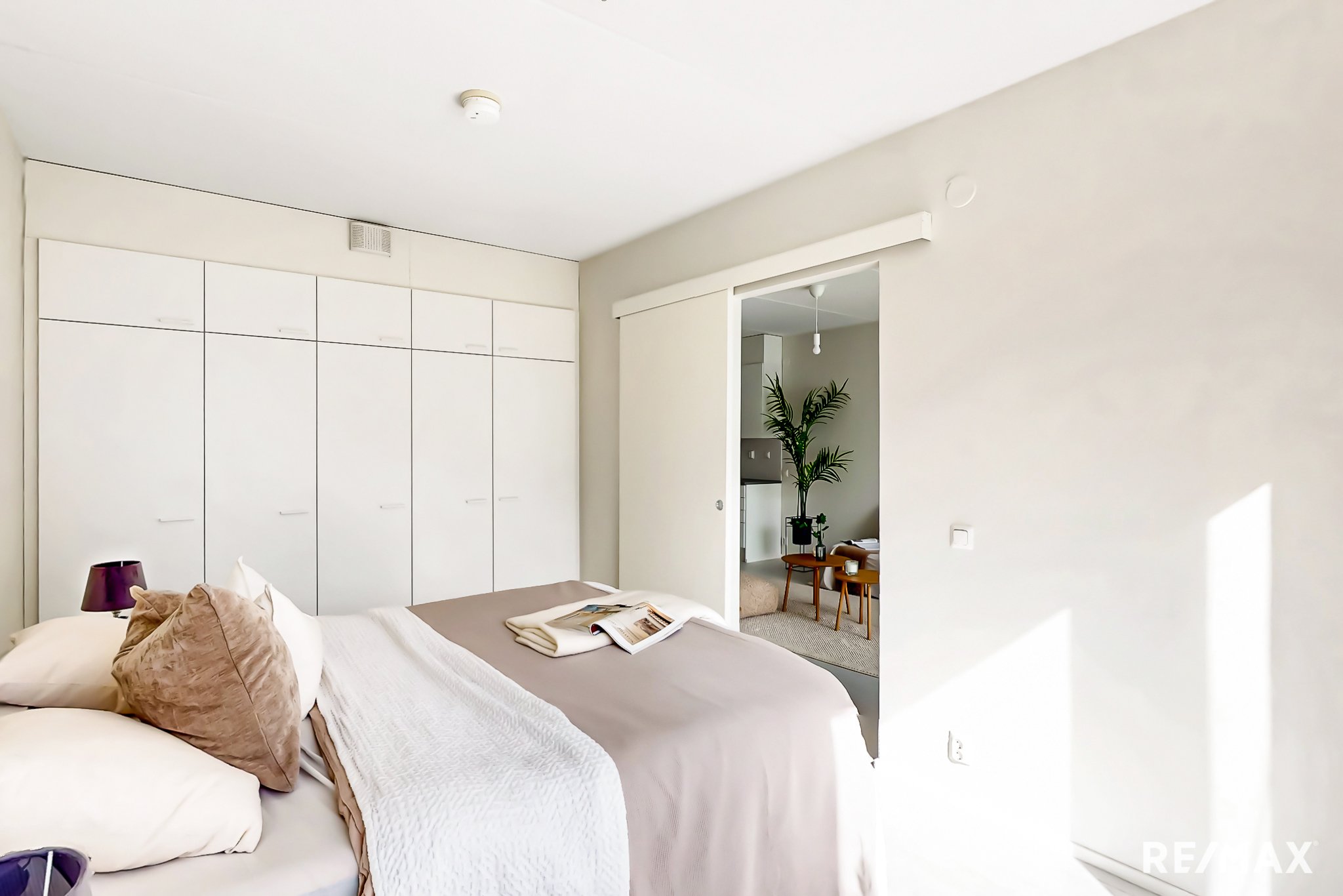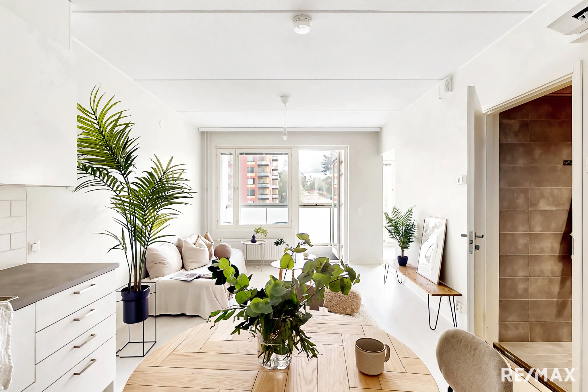 Edessäsi avautuu olohuoneen ja avokeittiön muodostama kokonaisuus, joka on kodin sydän. Suuret ikkunat tuovat valoa ja avaruutta. Olohuoneesta on käynti tilavalle lasitetulle parvekkeelle. Parvekkeella on ihana rentoutua aamukahvin ja auringon äärellä, katsellen puistomaista maisemaa. Myös makuuhuone on hyvin suunniteltu. Tilaa on leveämmällekin parivuoteelle ja saat tarvittaessa mahtumaan myös työpisteen makuuhuoneeseen. Makuuhuoneen lukuisat kaapit tarjoavat kaivattua säilytystilaa. Kirsikkana kakussa on asunnon tilava ja tyylikäs kylpyhuone.