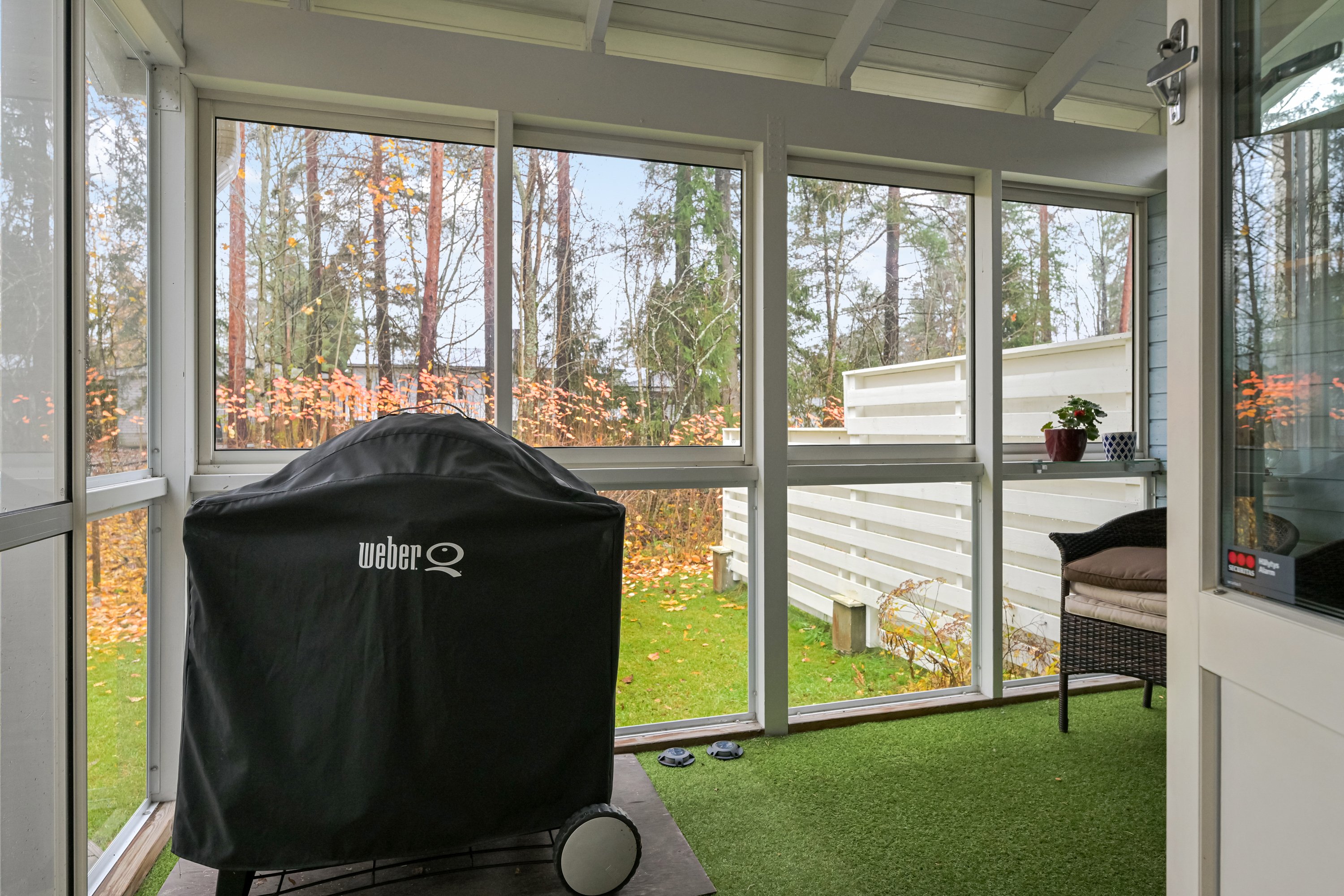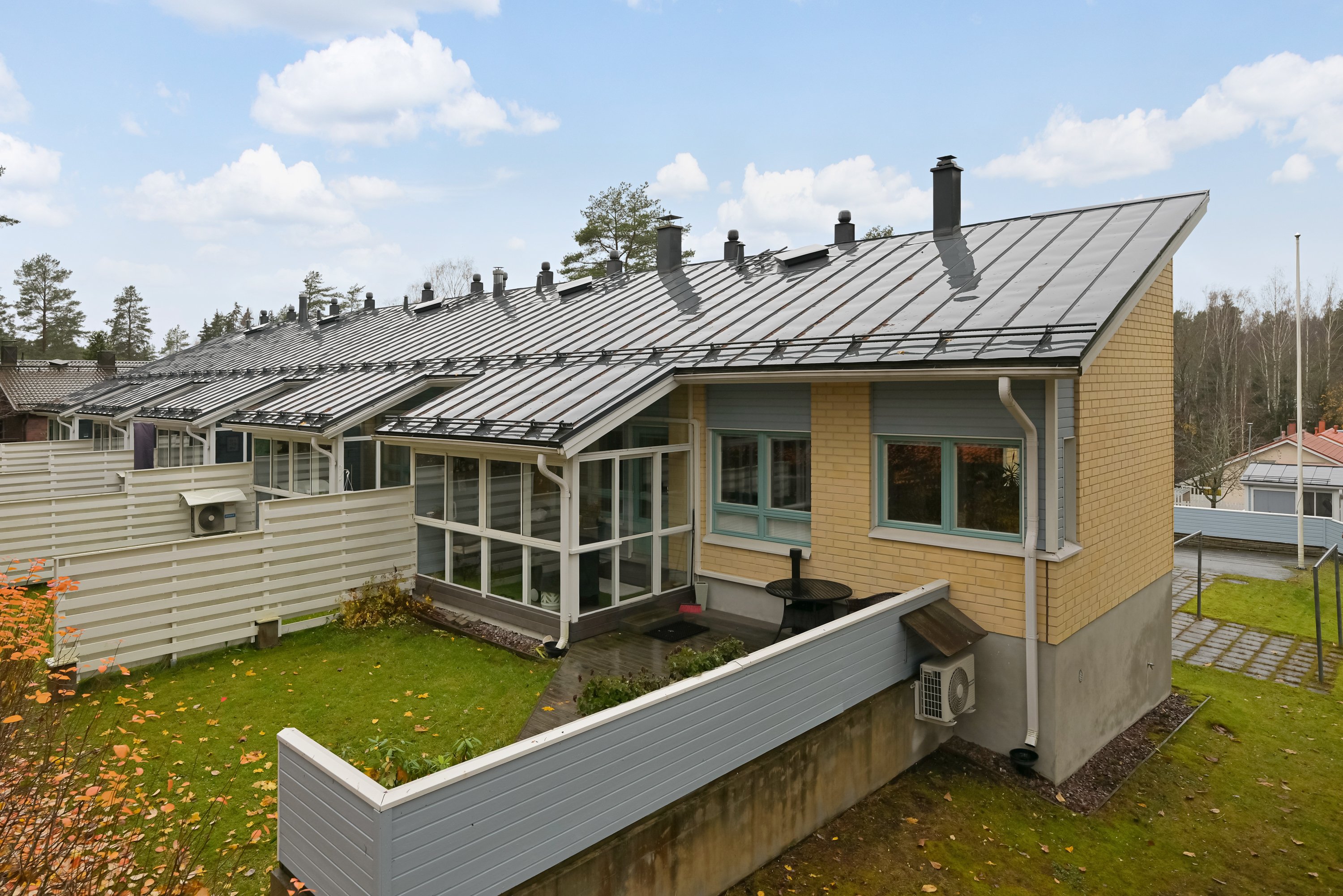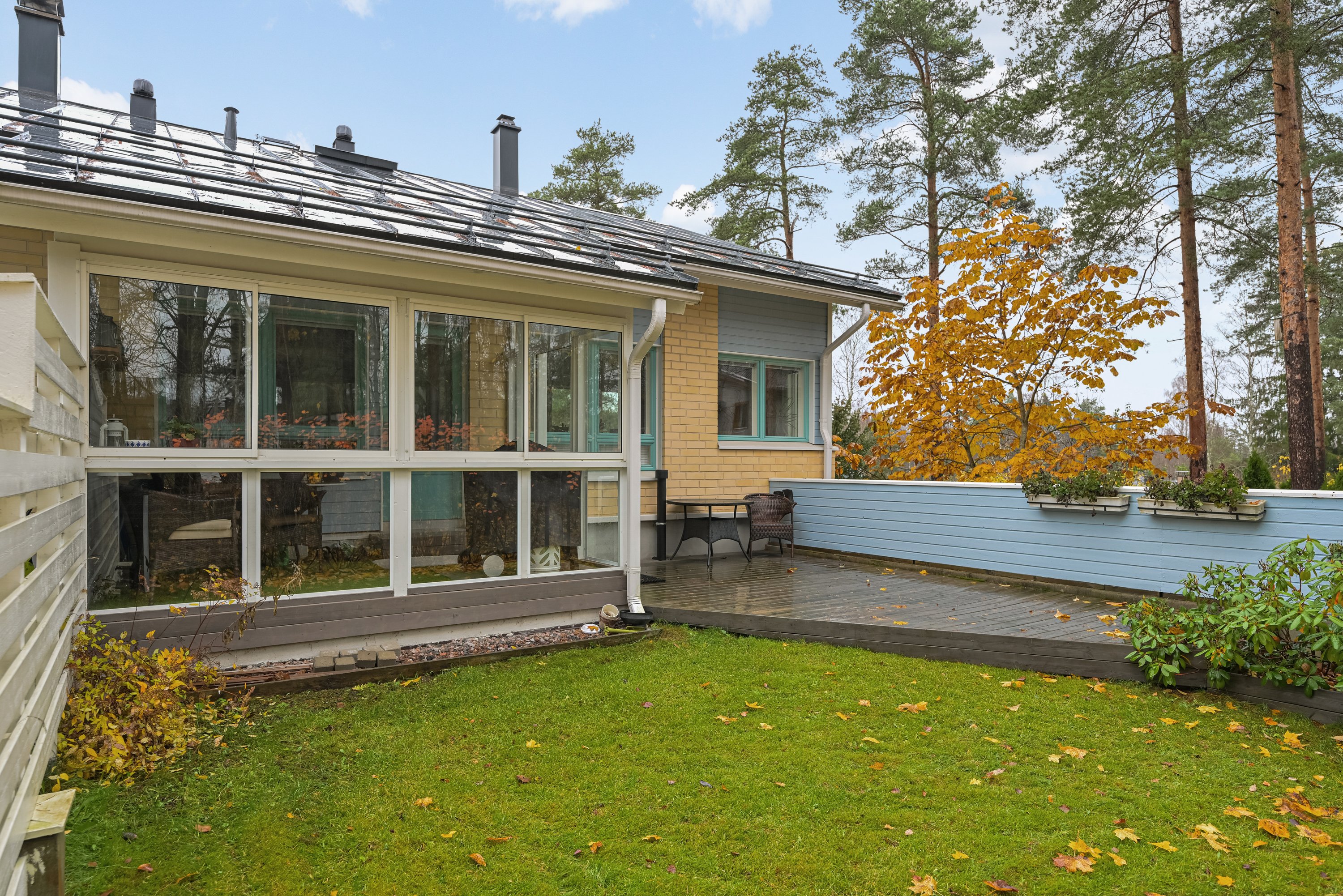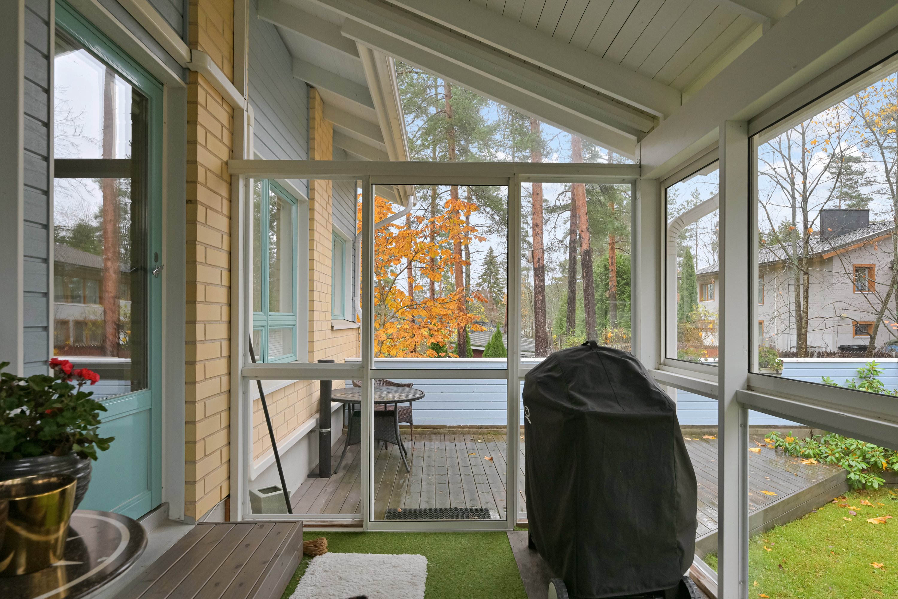 Olohuoneesta on käynti lasitetulle terassille, joka jatkuu kattamattomalle terassille ja omalle suojaisalle piha-alueelle – täydellinen paikka rentoutua, viettää kesäiltoja ja nauttia rauhasta.