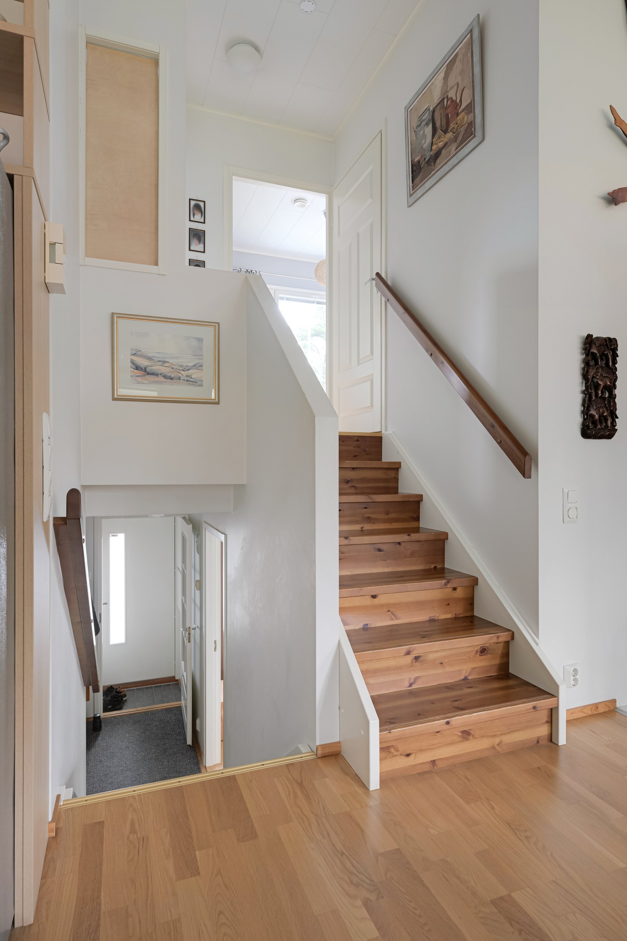Vuonna 2009 valmistunut koti hurmaa toimivalla ja avaralla pohjaratkaisullaan. Sisääntulokerroksessa sijaitsee monikäyttöinen makuuhuone, joka soveltuu erinomaisesti esimerkiksi työhuoneeksi tai vaikkapa teinin omaksi tilaksi. Samasta kerroksesta löytyvät myös sauna, pesuhuone wc:llä sekä käytännöllinen kodinhoitotila, jotka tekevät arjesta sujuvaa ja mukavaa. Molemmat pesuhuoneet ja sauna ovat uusittu vuonna 2019, joten märkätilat ovat modernit ja hyväkuntoiset.