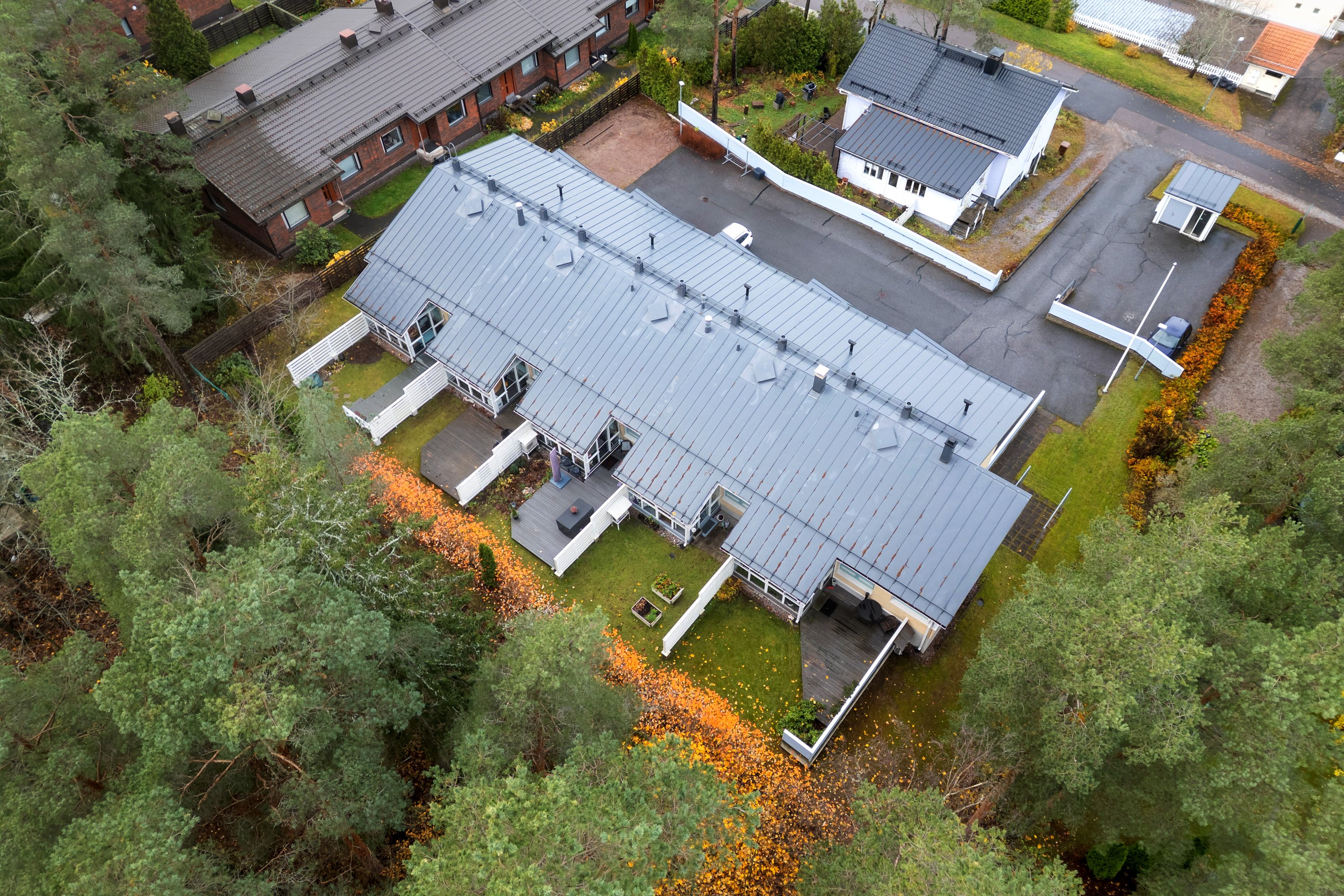 -Lasiterassien katoille asennettu lumiesteet 2016. Täydennetty oleskelupihan puolen lappeen lumieste yhtenäiseksi Ulko-ovien yläpuolelle asennettu räystäsesteet.