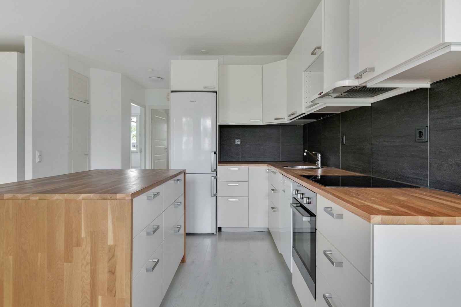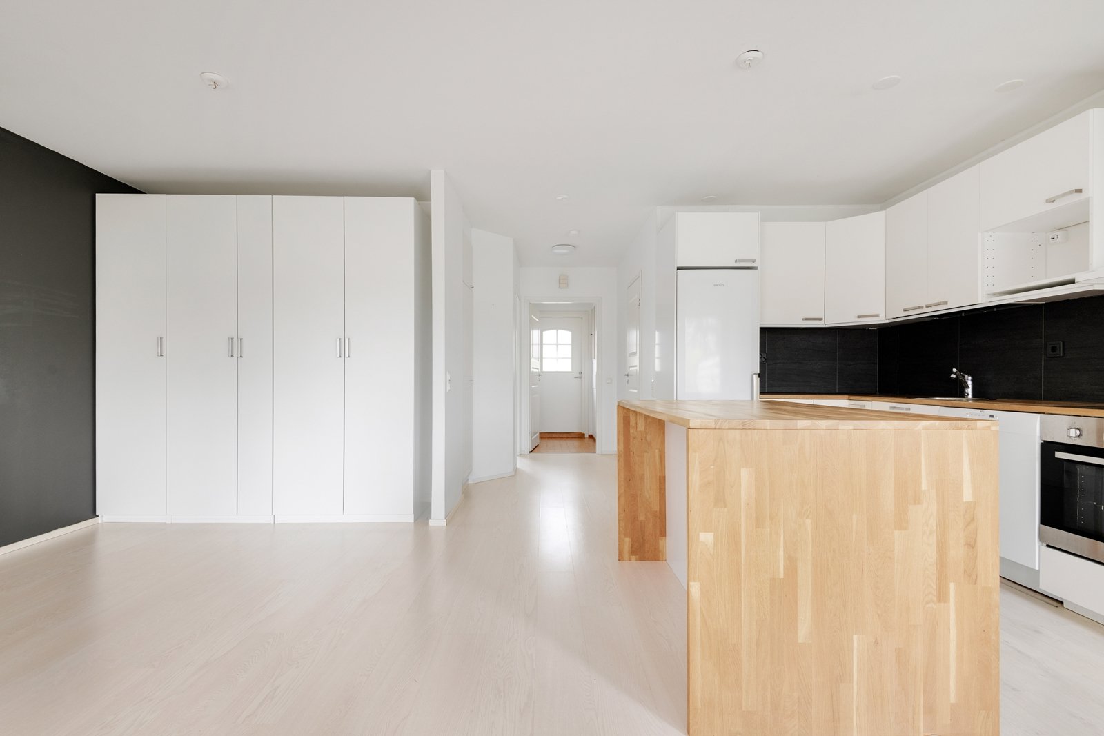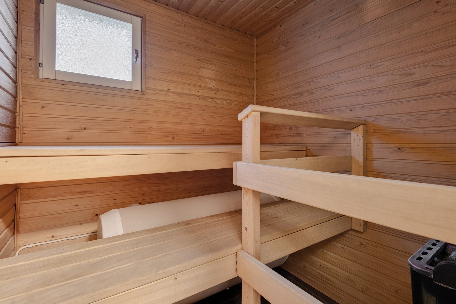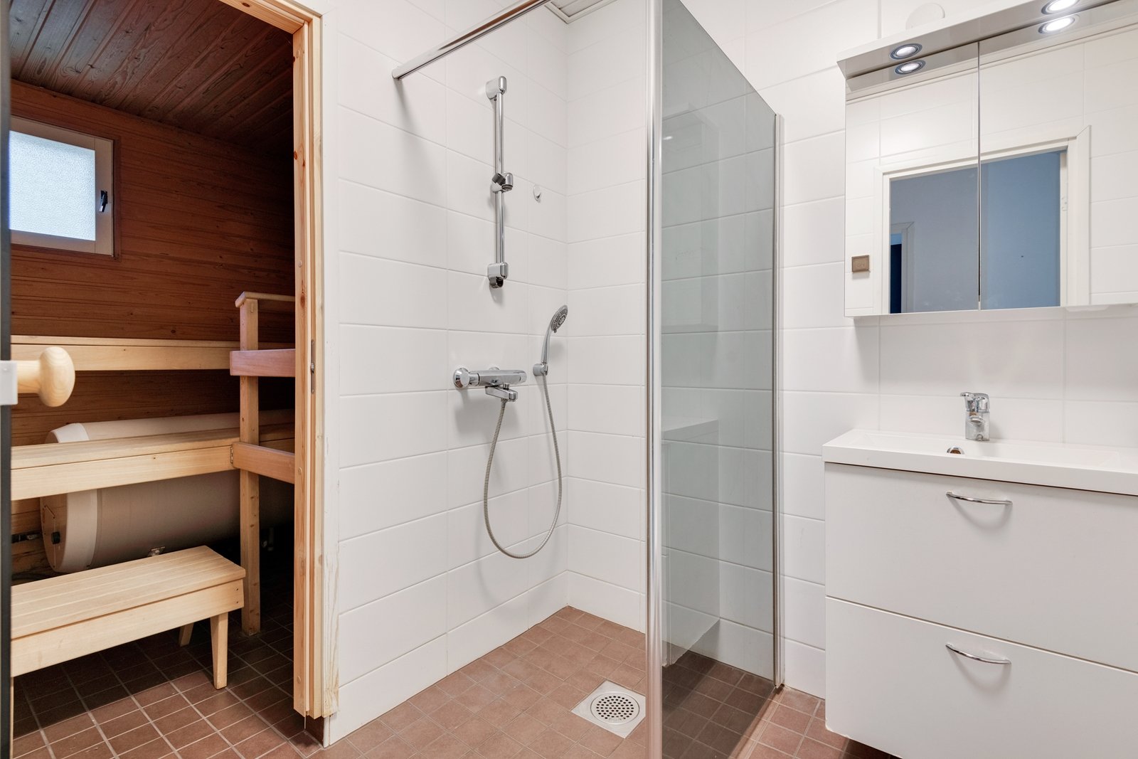 Säilytystilaa runsaasti vaatehuoneessa, kaapistoissa ja lämmitettävässä reilun kokoisessa ulkovarastossa.