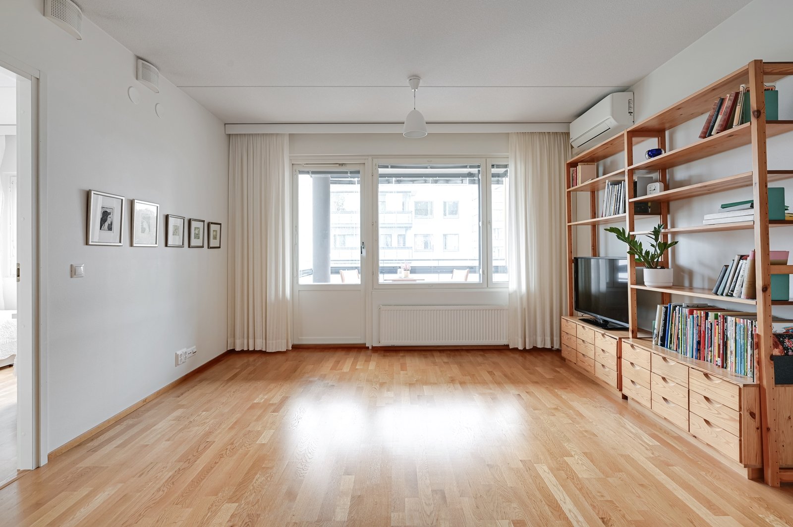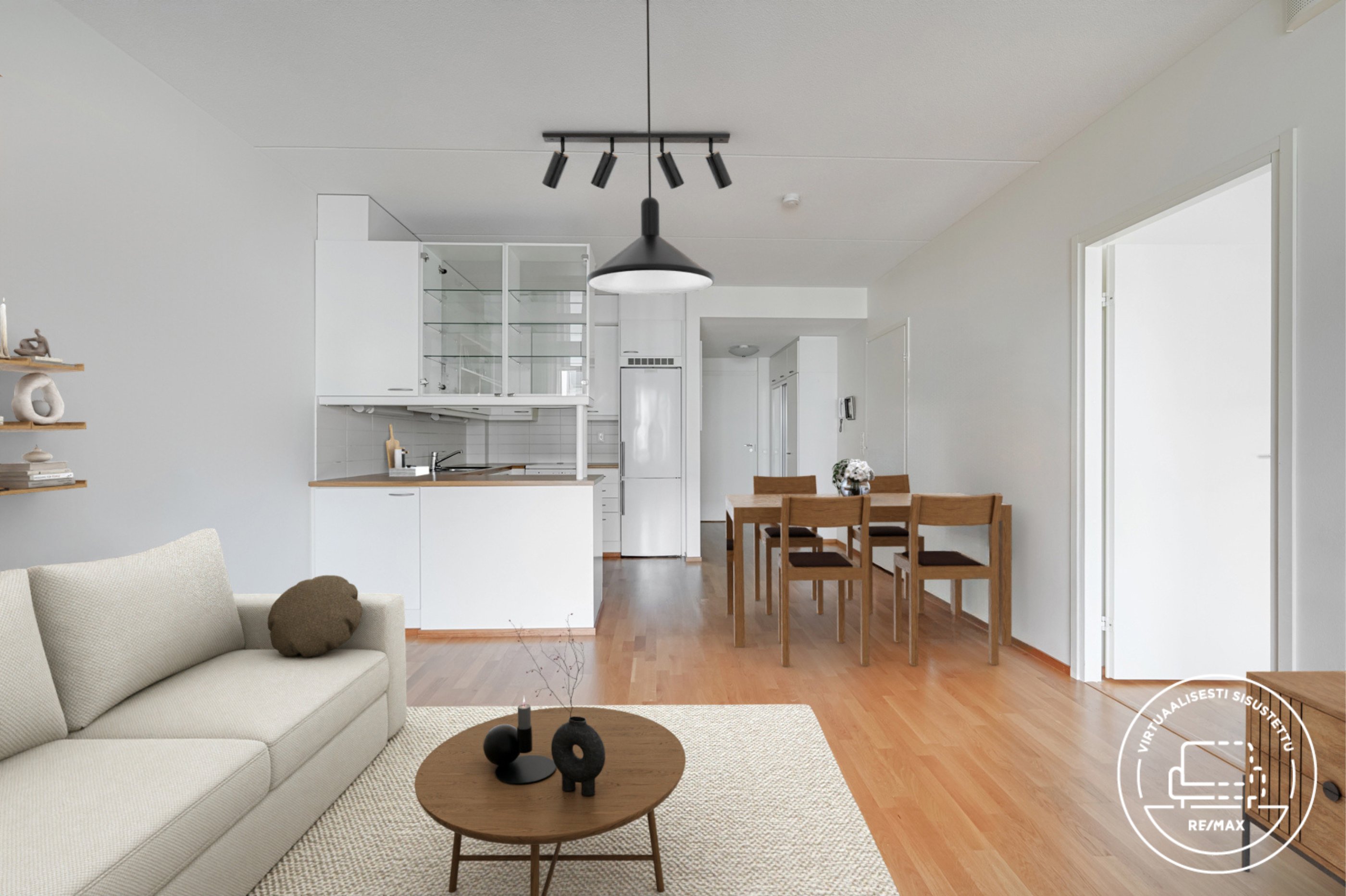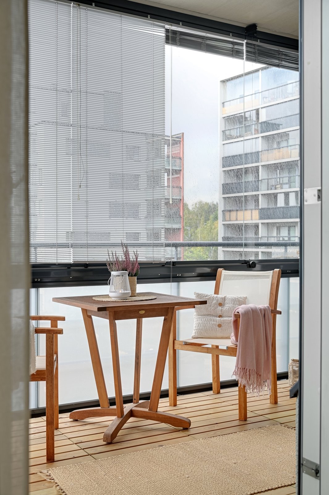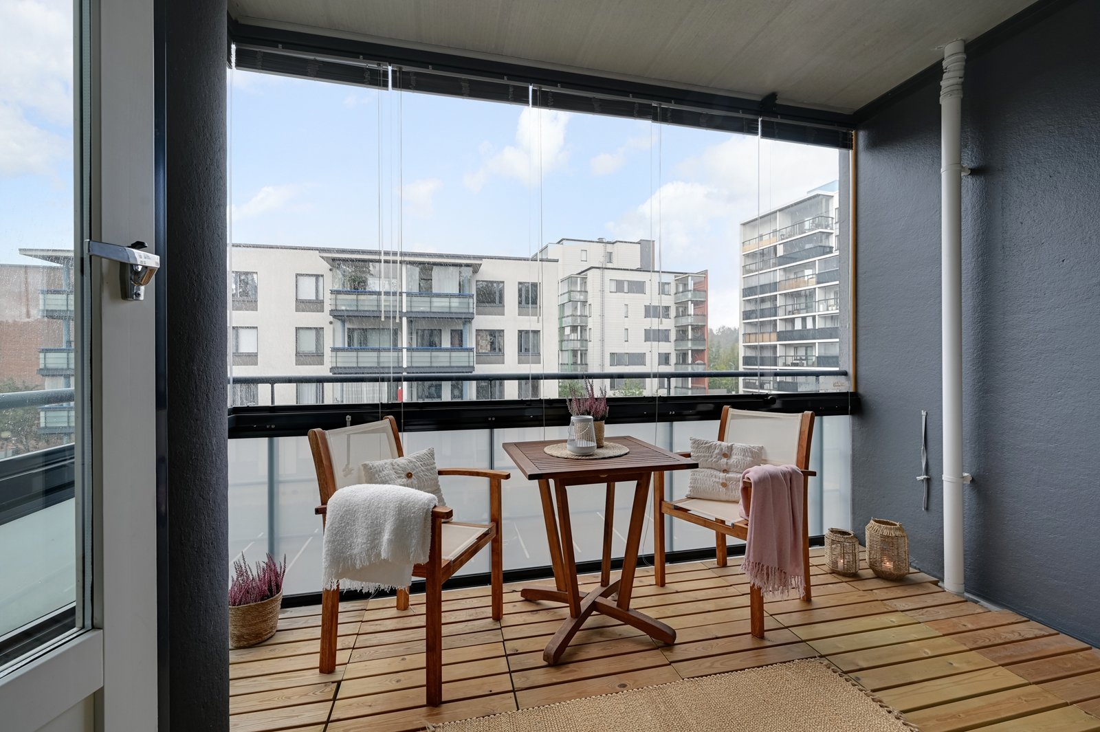 Hissitalon 3. kerroksen kodin olohuoneen jatkeena toimii tilava lasitettu parveke. Aurinkoinen parveke on viimeistelty sälekaihtimilla sekä puisilla lattialaatoilla. Olohuoneen ja koko asunnon viilennyksestä huolehtii vuonna 2022 asennettu ilmalämpöpumppu.