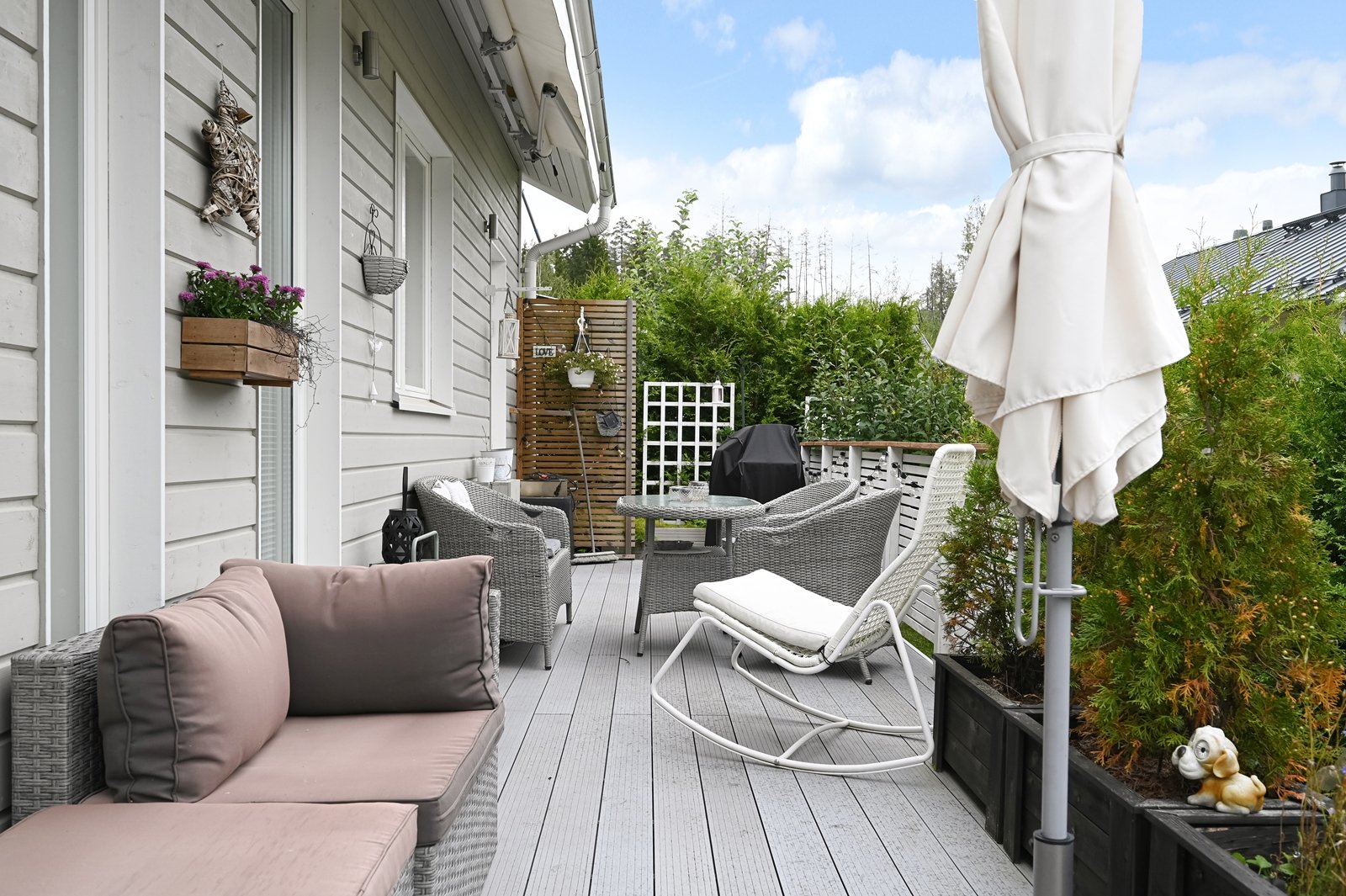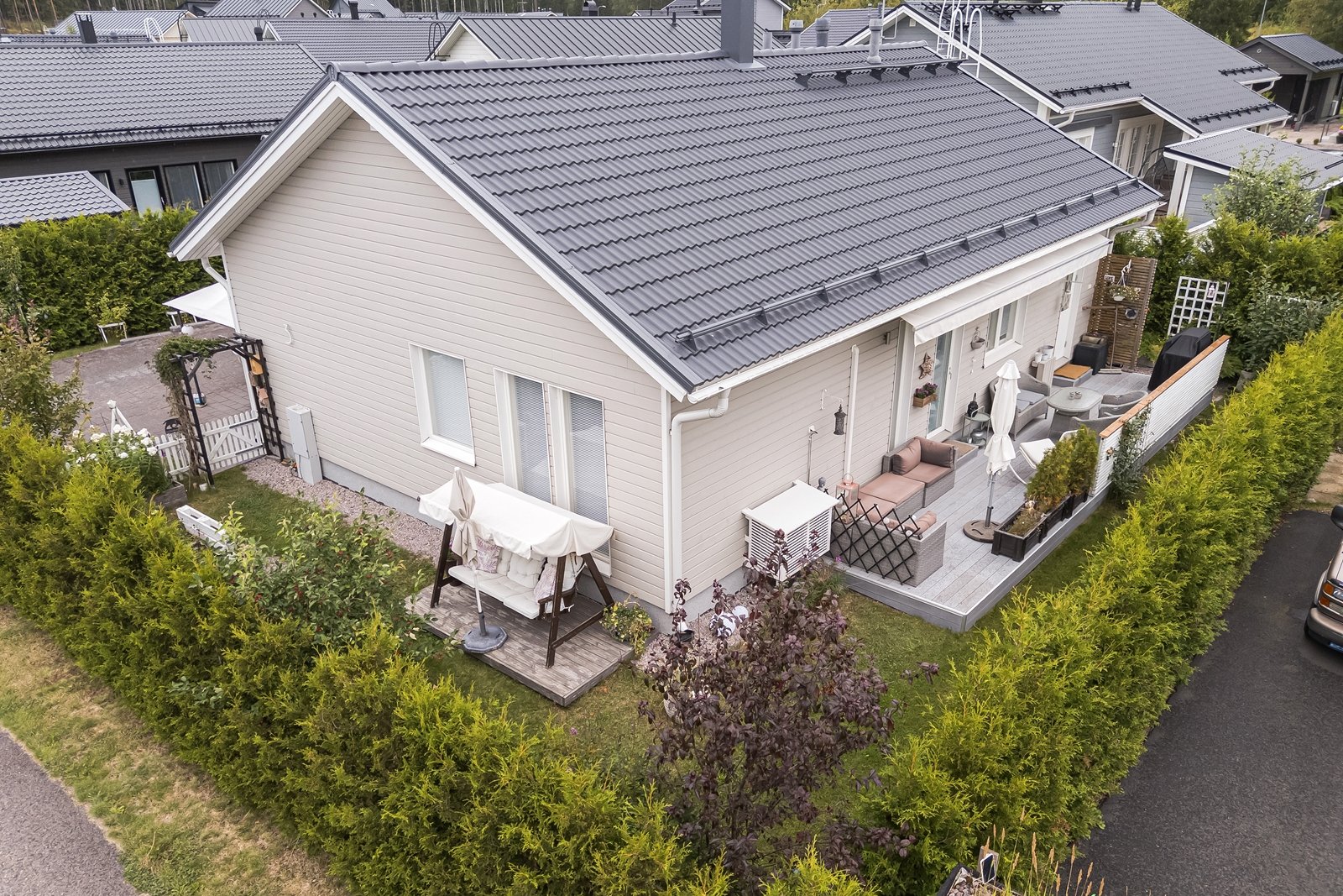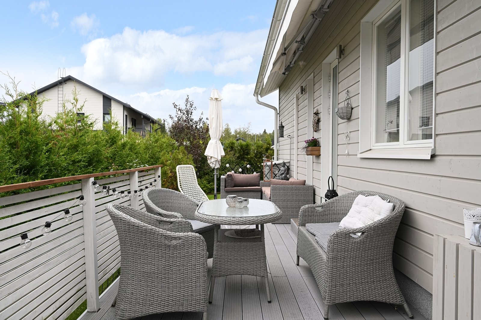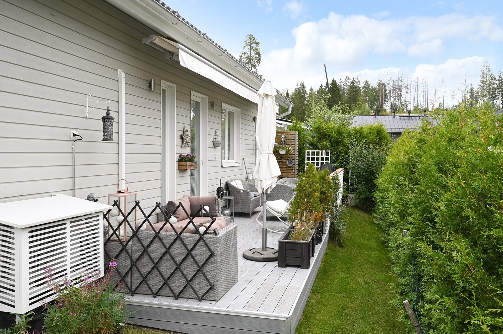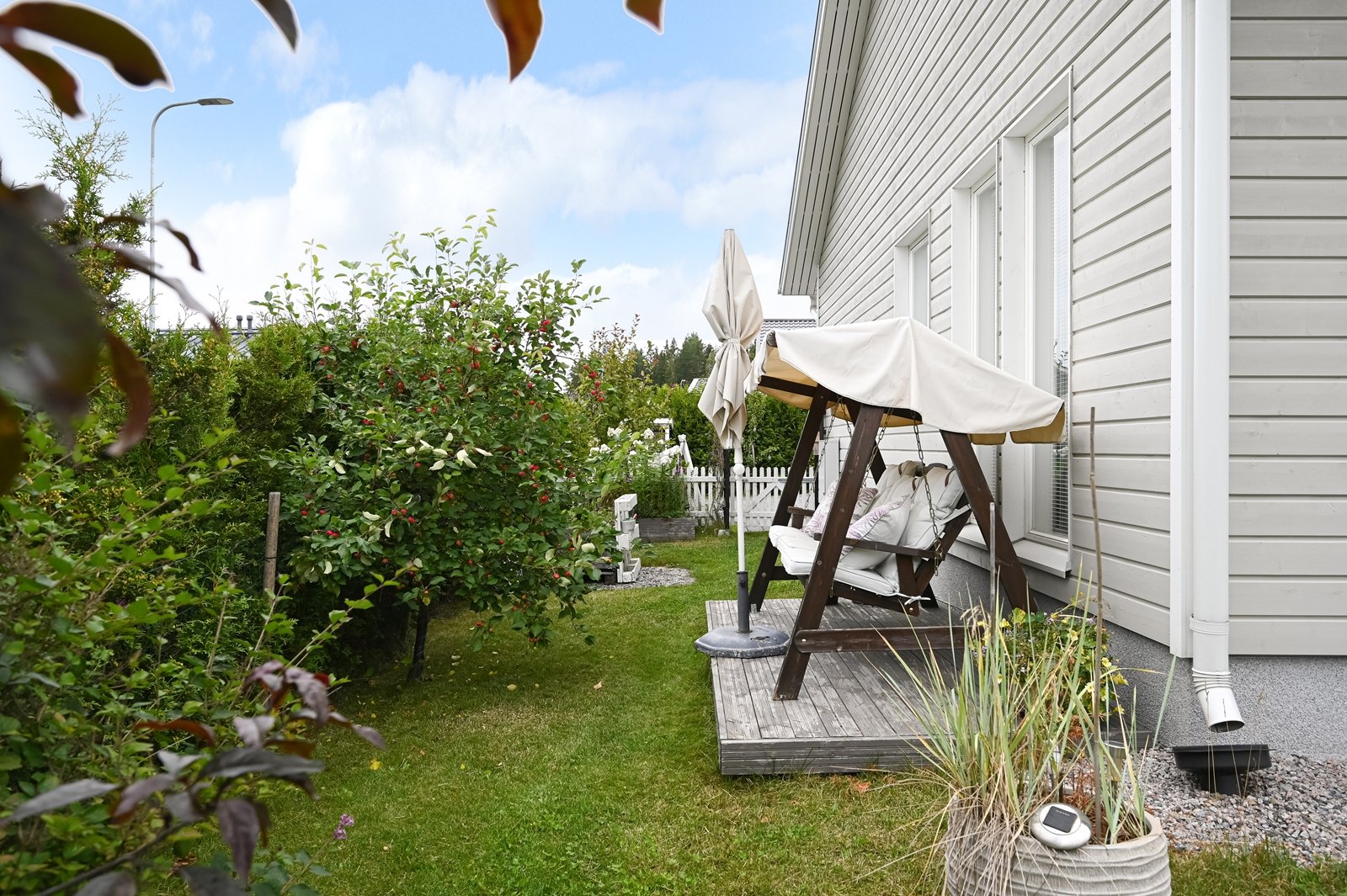 Olohuoneesta on käynti tilavalle eteläkaakkoon suuntautuvalle terassille, jonka voi tarvittaessa suojata liialta auringonpaisteelta 7 metriä leveällä markiisilla. Tasamaatonttia reunustaa ja samalla mukavaa yksityisyyttä tuovat tuija-aidat. Pääoven ja autotallin edusta on päällystetty helppohoitoisella kivetyksellä. Erillisessä lämpimässä autotallissa ja varastossa on mukavasti säilytystilaa harrastus- ja puutarhavälineille.