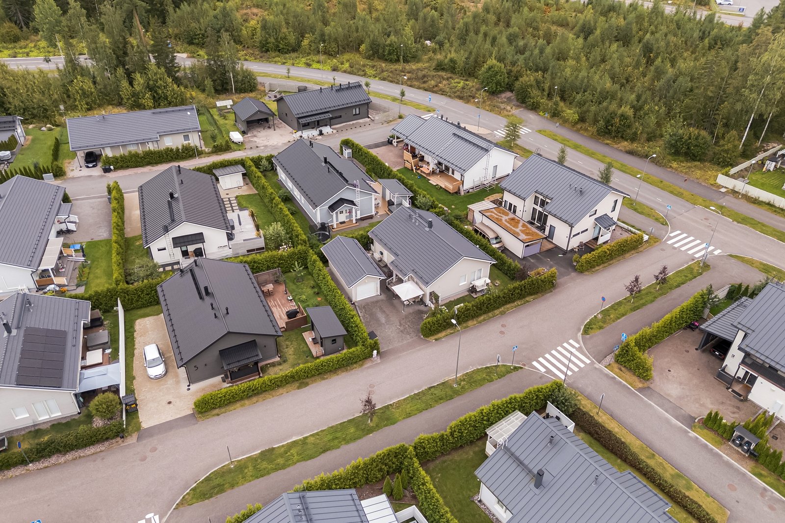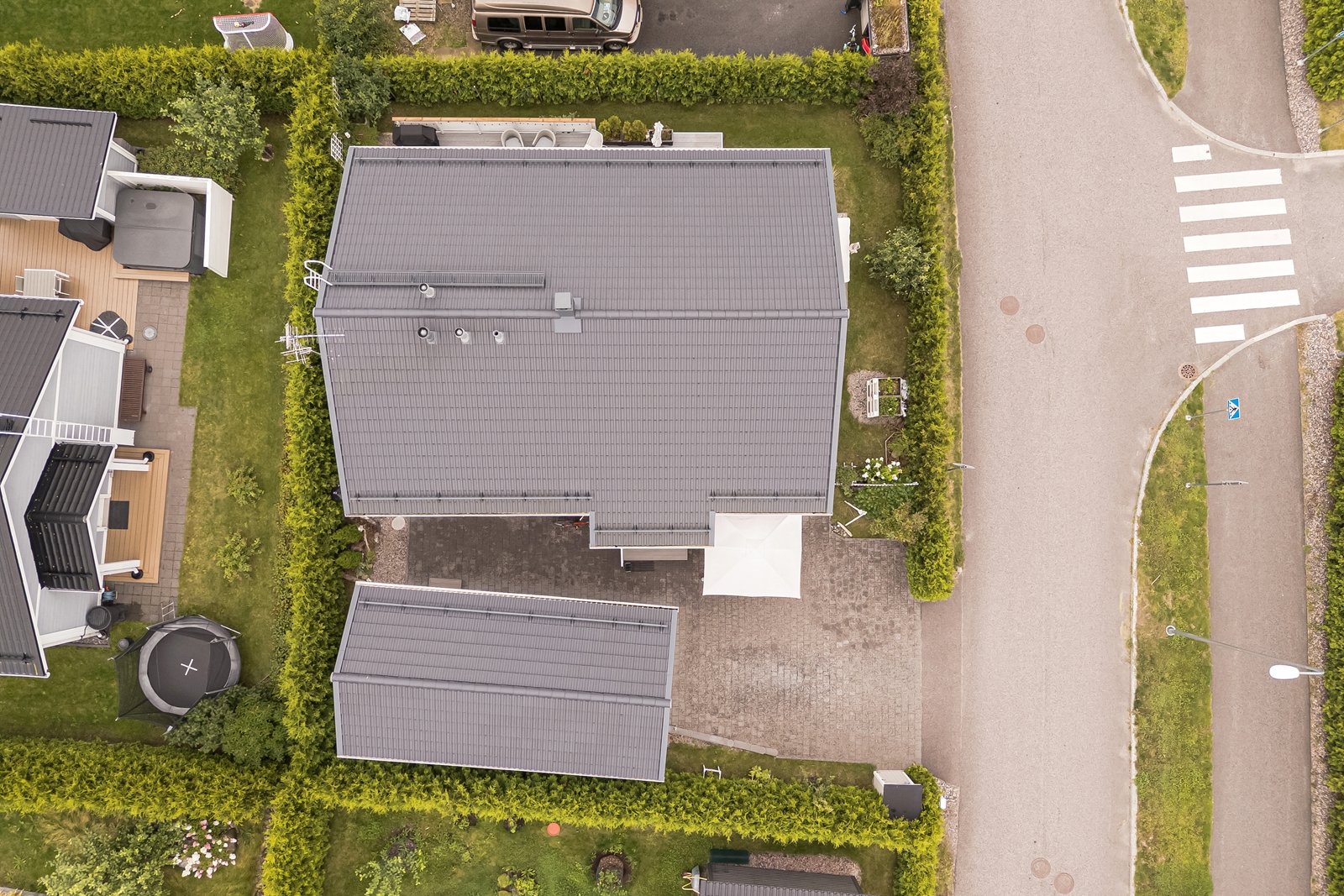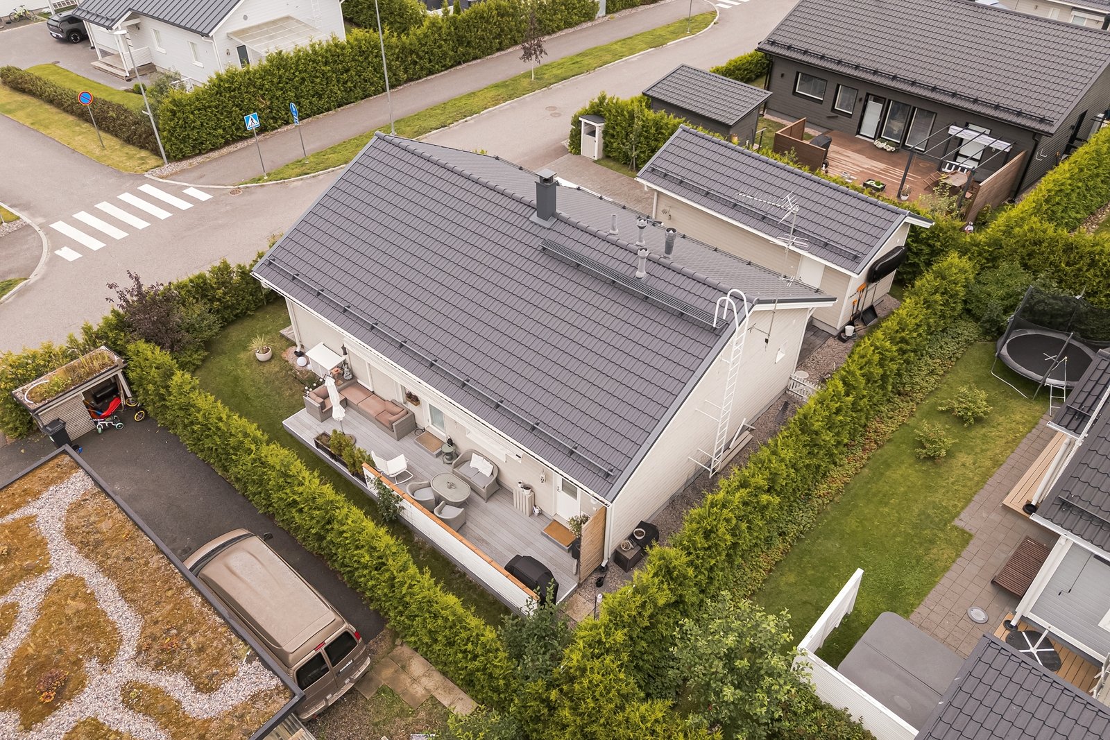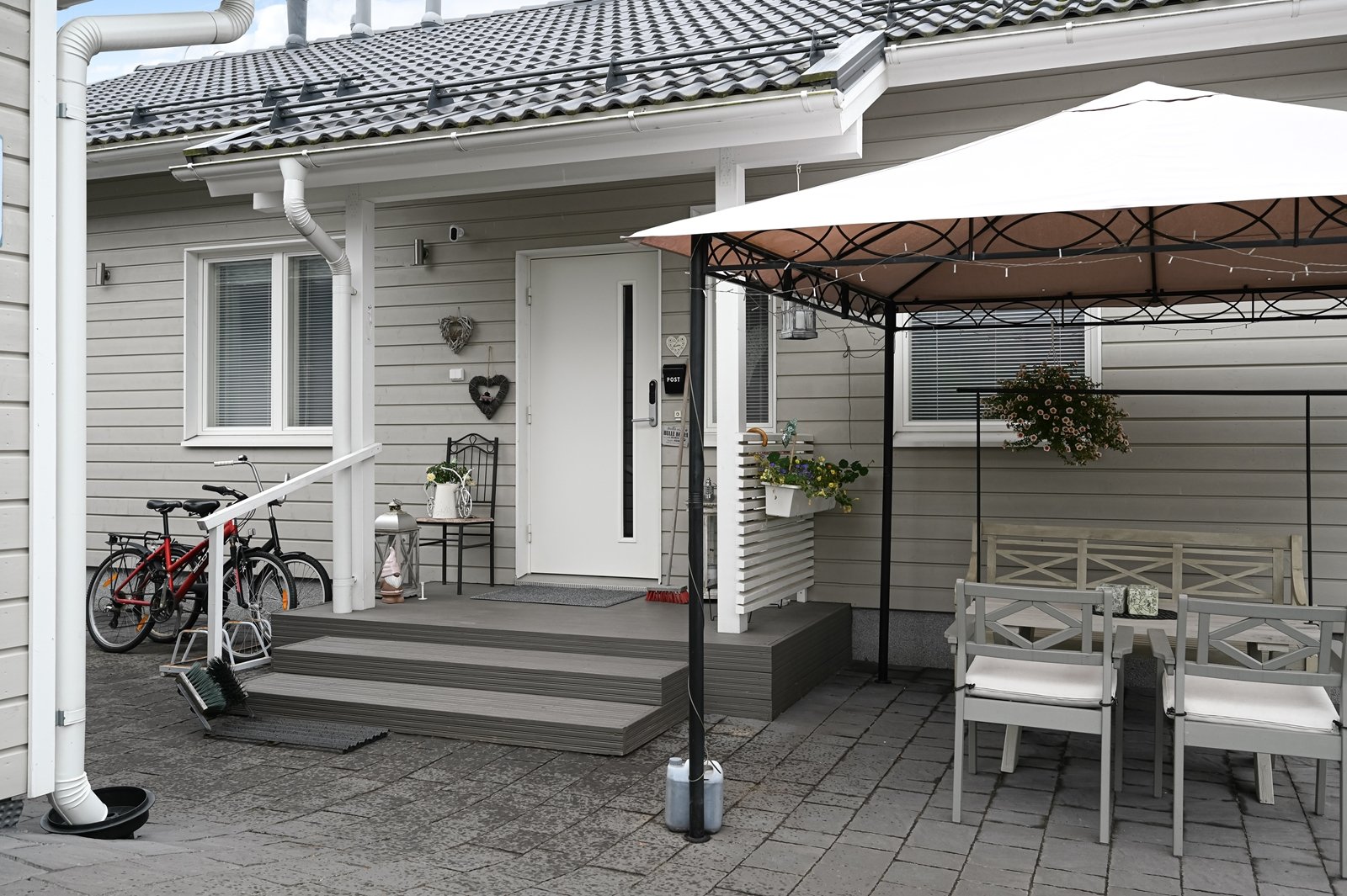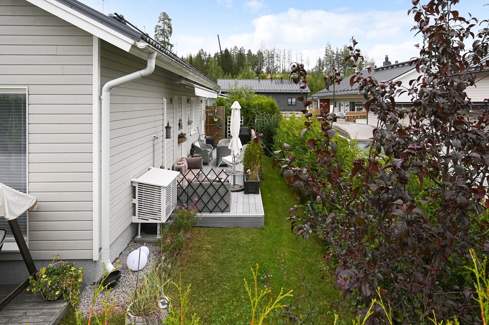 Olohuoneesta on käynti tilavalle eteläkaakkoon suuntautuvalle terassille, jonka voi tarvittaessa suojata liialta auringonpaisteelta 7 metriä leveällä markiisilla. Tasamaatonttia reunustaa ja samalla mukavaa yksityisyyttä tuovat tuija-aidat. Pääoven ja autotallin edusta on päällystetty helppohoitoisella kivetyksellä. Erillisessä lämpimässä autotallissa ja varastossa on mukavasti säilytystilaa harrastus- ja puutarhavälineille.