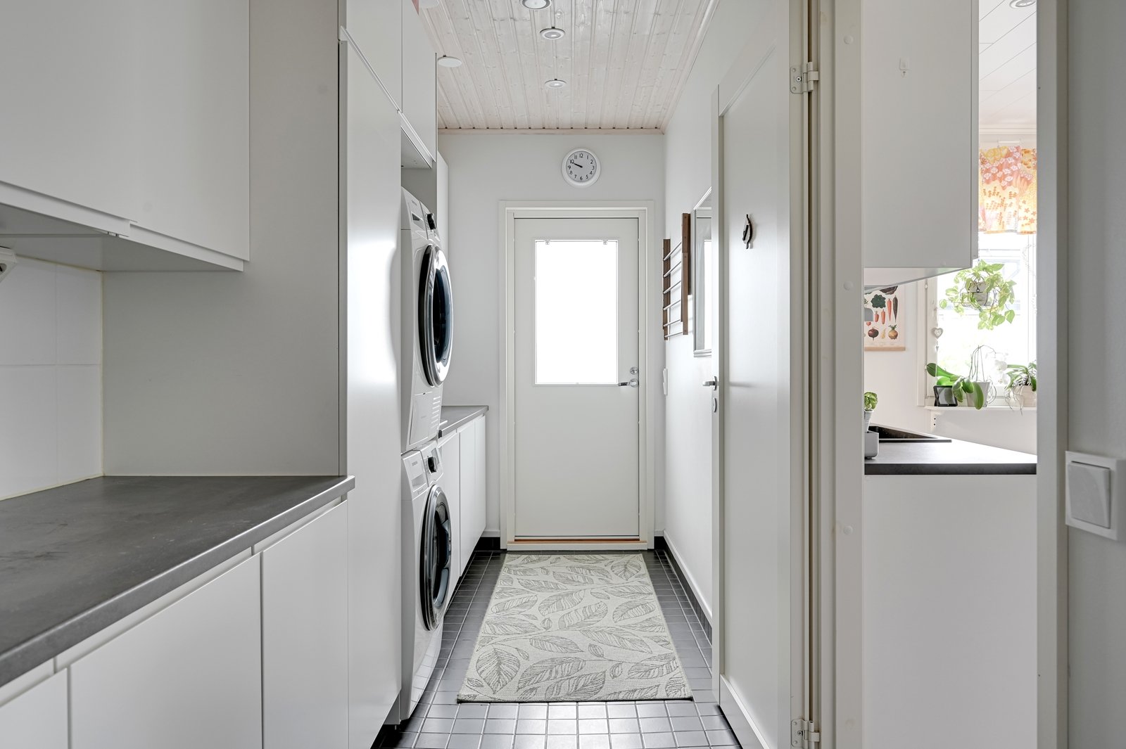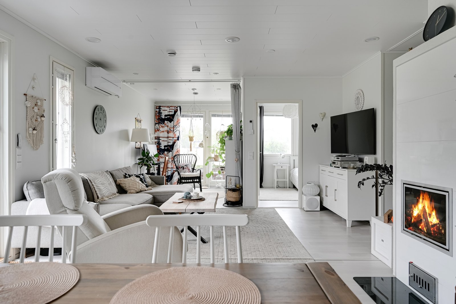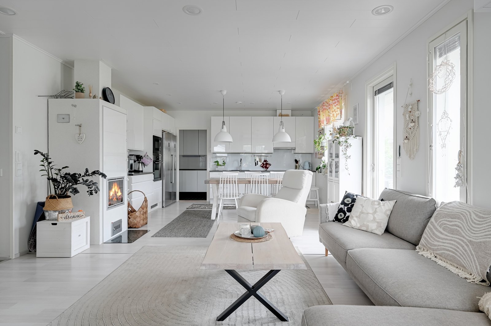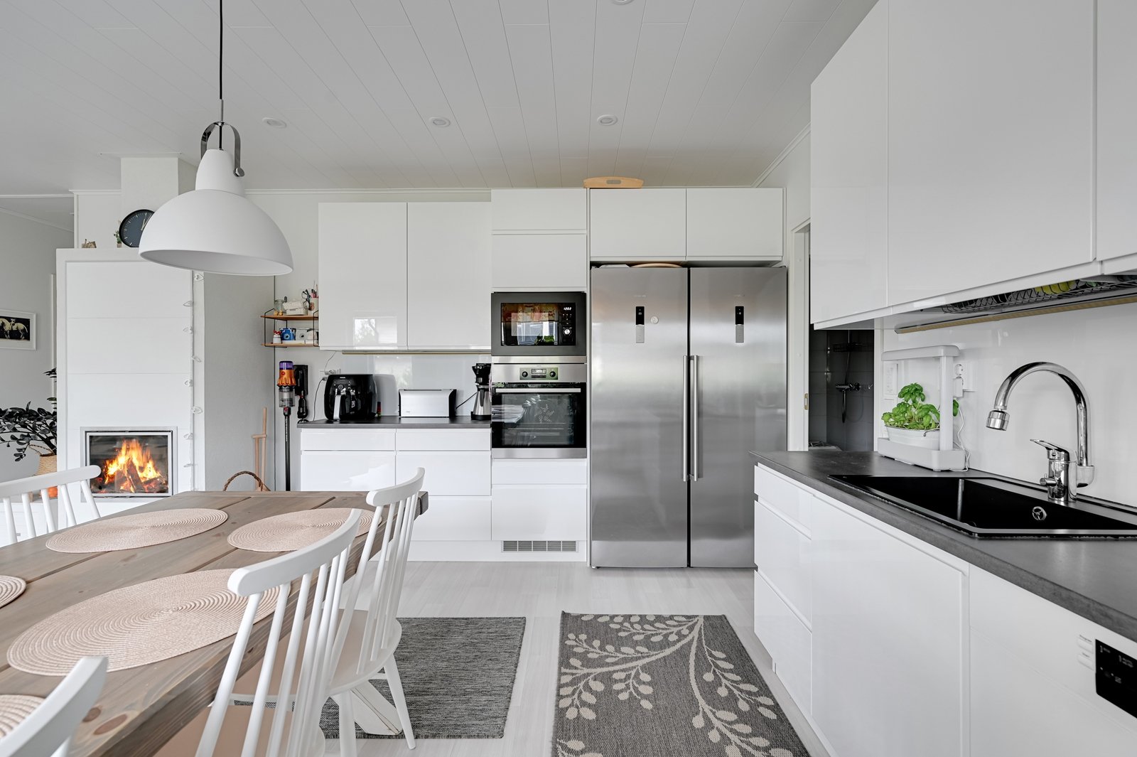 Tämän kodin ehdoton etu on hyvin suunniteltu toimiva pohjaratkaisu. Kodin sydämenä toimii avara kauniilla valkoisella varaavalla takalla varustettu olohuoneen ja modernin kiiltovalkoisin kalustein sisustetun avokeittiön yhtenäinen tila. Keittiöstä pääsee kätevästi suoraan kodinhoitotilaan, jossa on runsaasti kaappi- ja laskutilaa sekä oma uloskäynti. Kahdella suihkulla varustettu pesutila ja tyylikäs sauna tuovat pientä luksusta arkeen. Asunnon nykyisten kolmen makuuhuoneen lisäksi olohuoneesta voi helposti erottaa neljännen makuuhuoneen tai tarvittaessa erillisen työtilan.