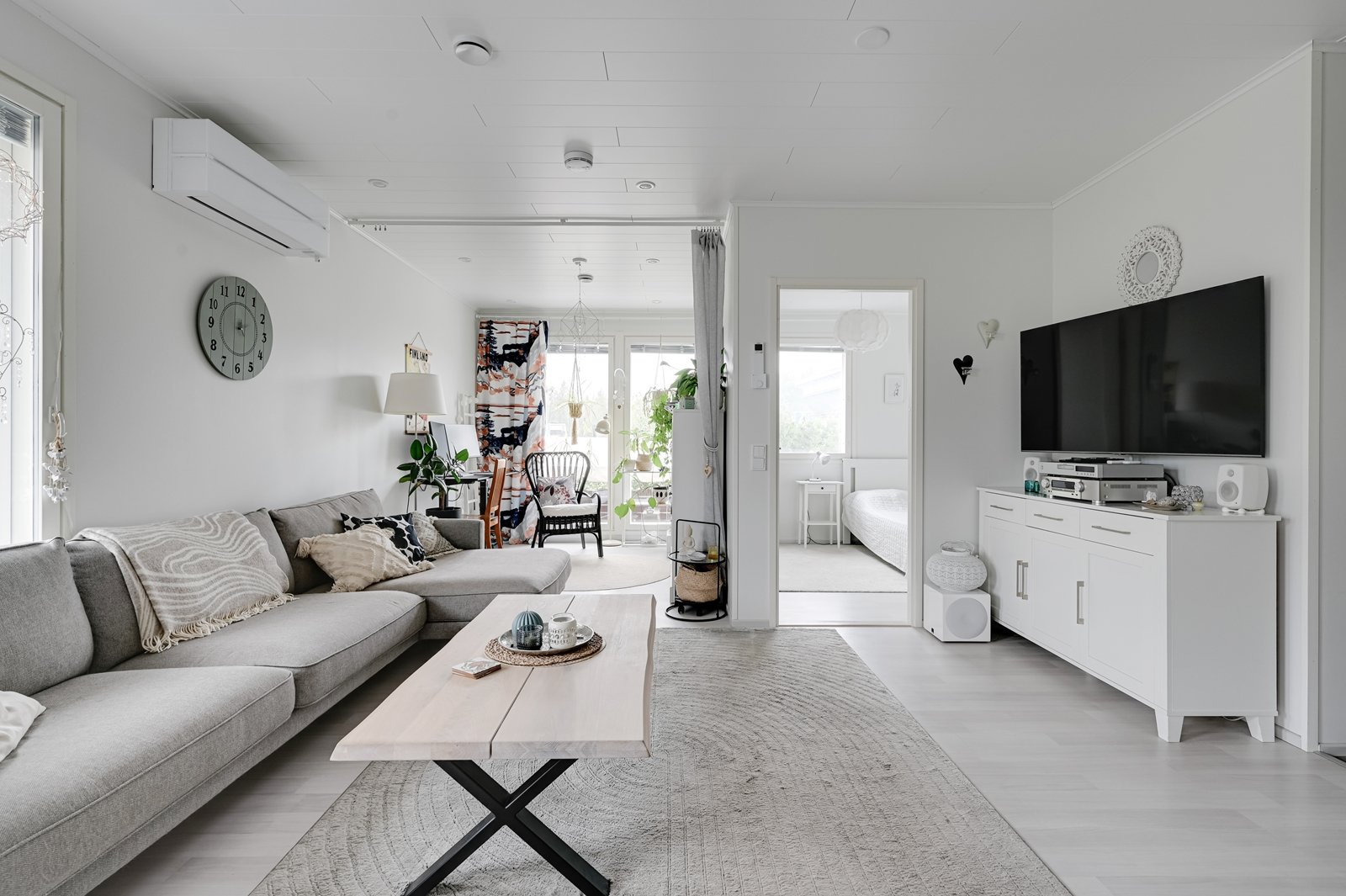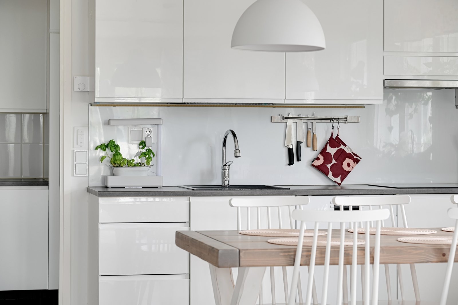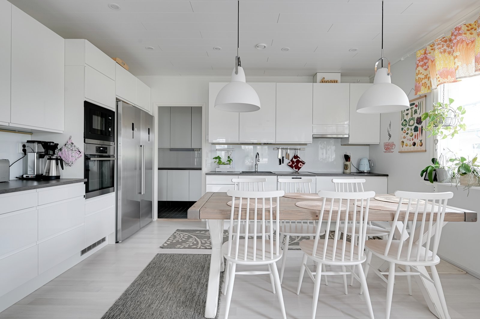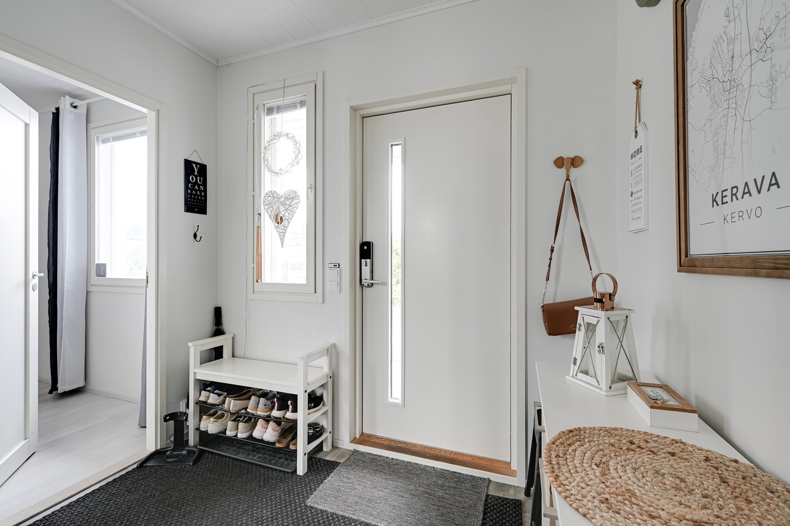 Tämän kodin ehdoton etu on hyvin suunniteltu toimiva pohjaratkaisu. Kodin sydämenä toimii avara kauniilla valkoisella varaavalla takalla varustettu olohuoneen ja modernin kiiltovalkoisin kalustein sisustetun avokeittiön yhtenäinen tila. Keittiöstä pääsee kätevästi suoraan kodinhoitotilaan, jossa on runsaasti kaappi- ja laskutilaa sekä oma uloskäynti. Kahdella suihkulla varustettu pesutila ja tyylikäs sauna tuovat pientä luksusta arkeen. Asunnon nykyisten kolmen makuuhuoneen lisäksi olohuoneesta voi helposti erottaa neljännen makuuhuoneen tai tarvittaessa erillisen työtilan.