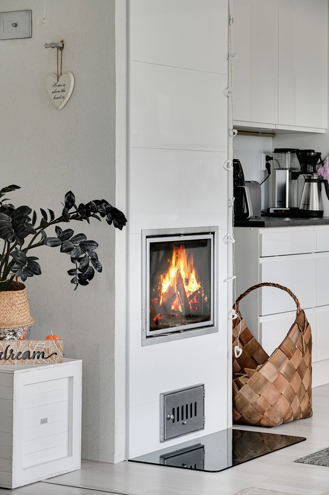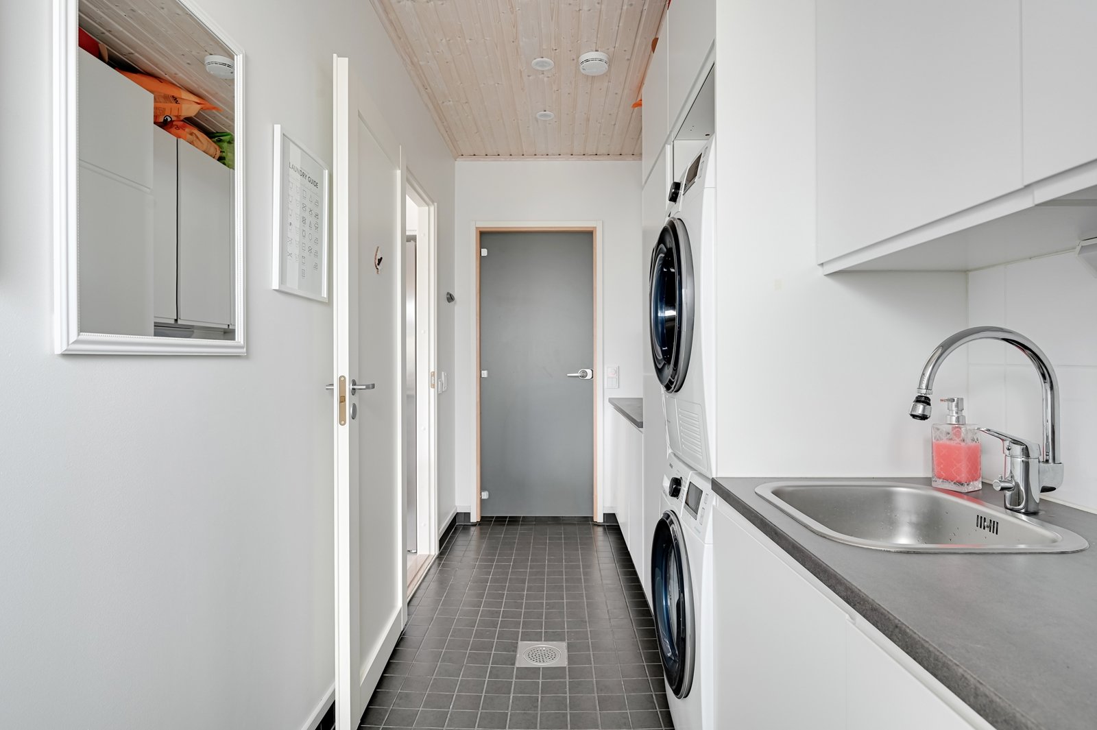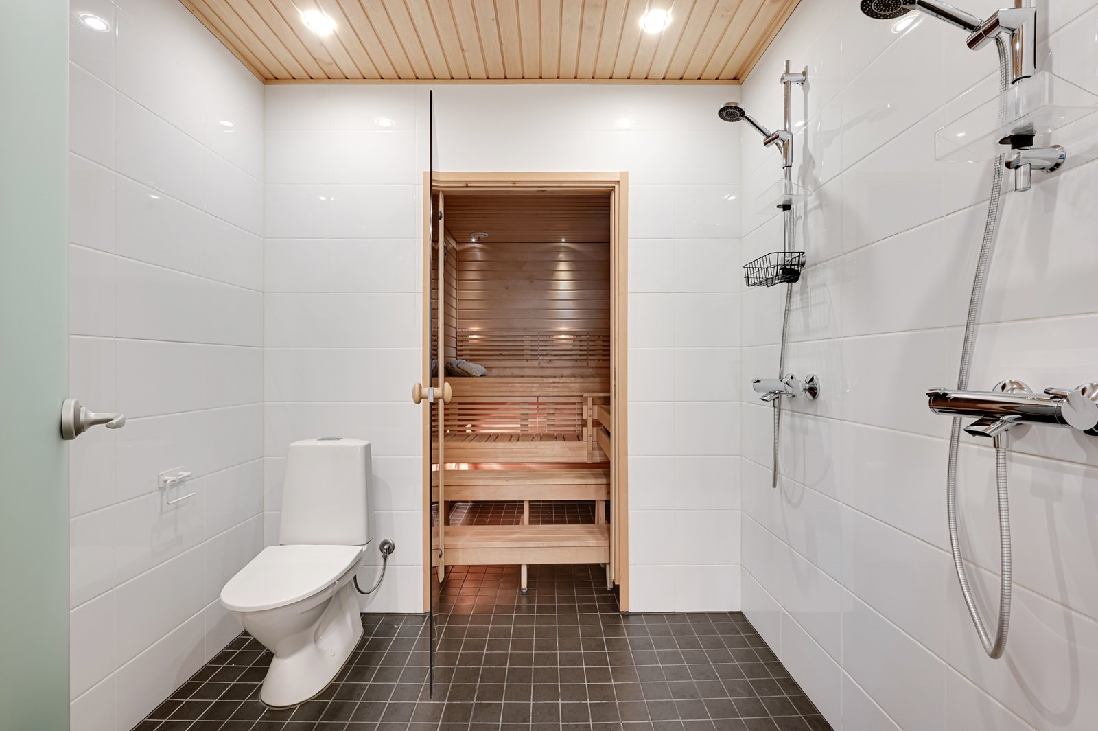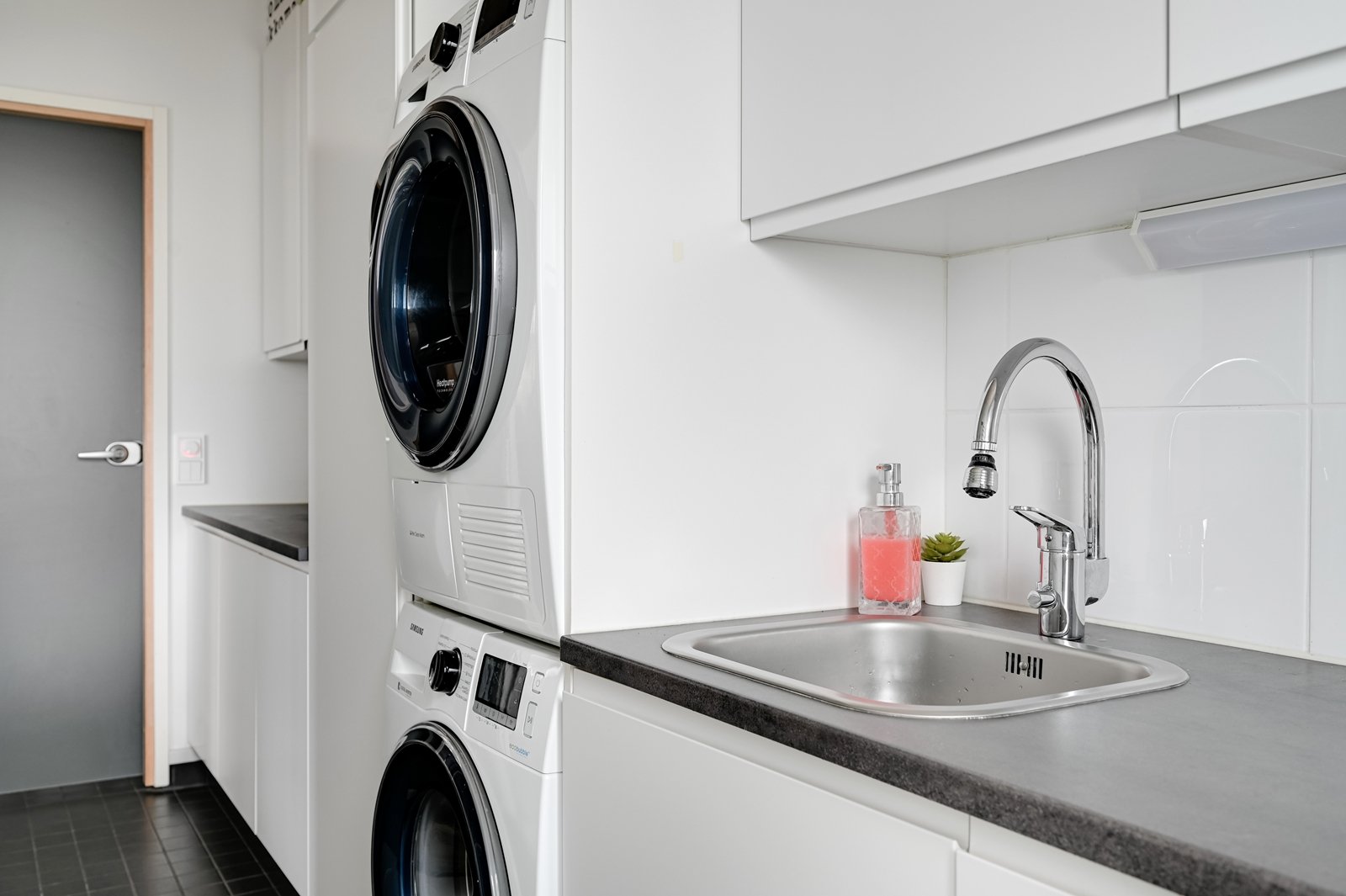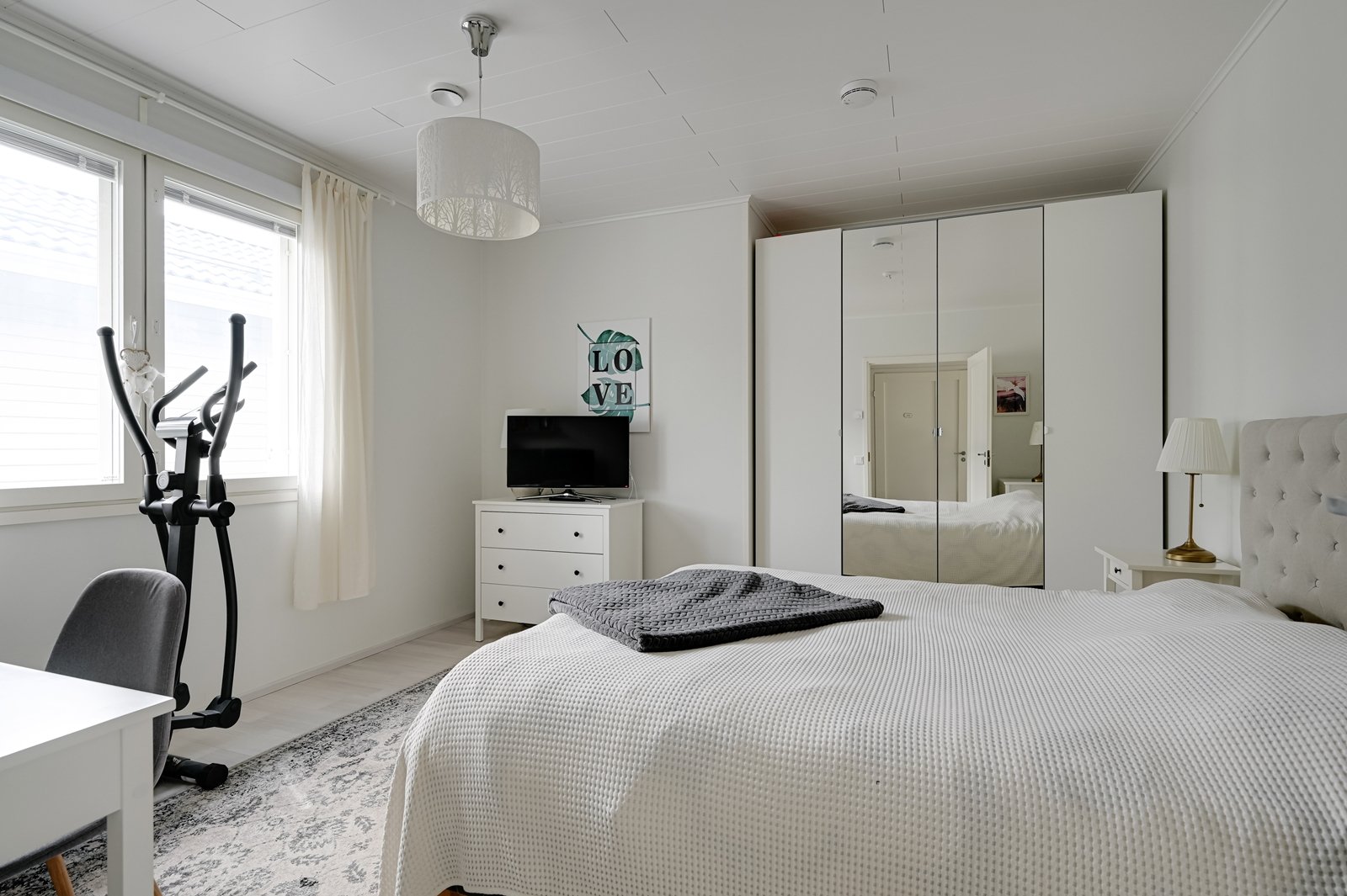 Tämän kodin ehdoton etu on hyvin suunniteltu toimiva pohjaratkaisu. Kodin sydämenä toimii avara kauniilla valkoisella varaavalla takalla varustettu olohuoneen ja modernin kiiltovalkoisin kalustein sisustetun avokeittiön yhtenäinen tila. Keittiöstä pääsee kätevästi suoraan kodinhoitotilaan, jossa on runsaasti kaappi- ja laskutilaa sekä oma uloskäynti. Kahdella suihkulla varustettu pesutila ja tyylikäs sauna tuovat pientä luksusta arkeen. Asunnon nykyisten kolmen makuuhuoneen lisäksi olohuoneesta voi helposti erottaa neljännen makuuhuoneen tai tarvittaessa erillisen työtilan.