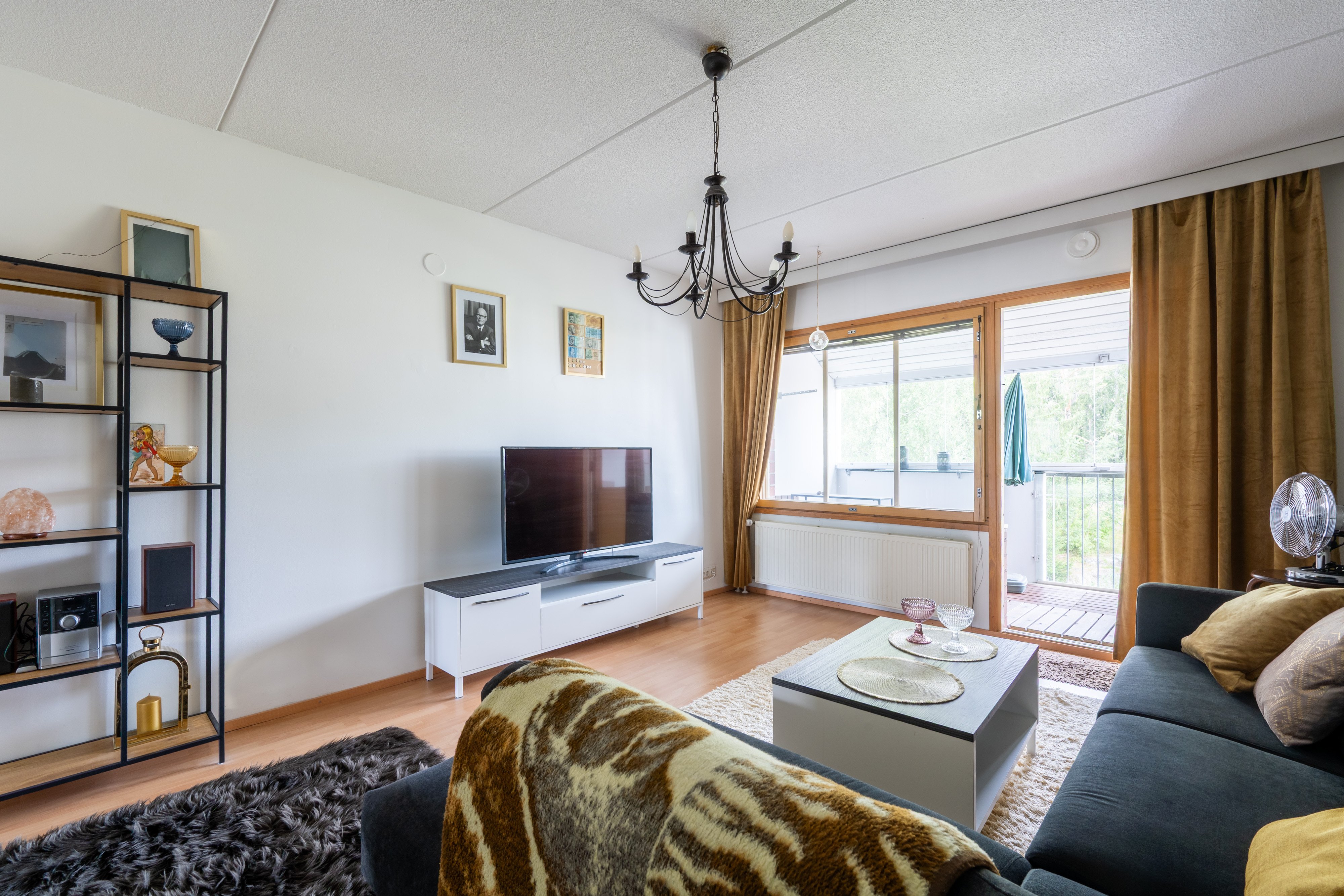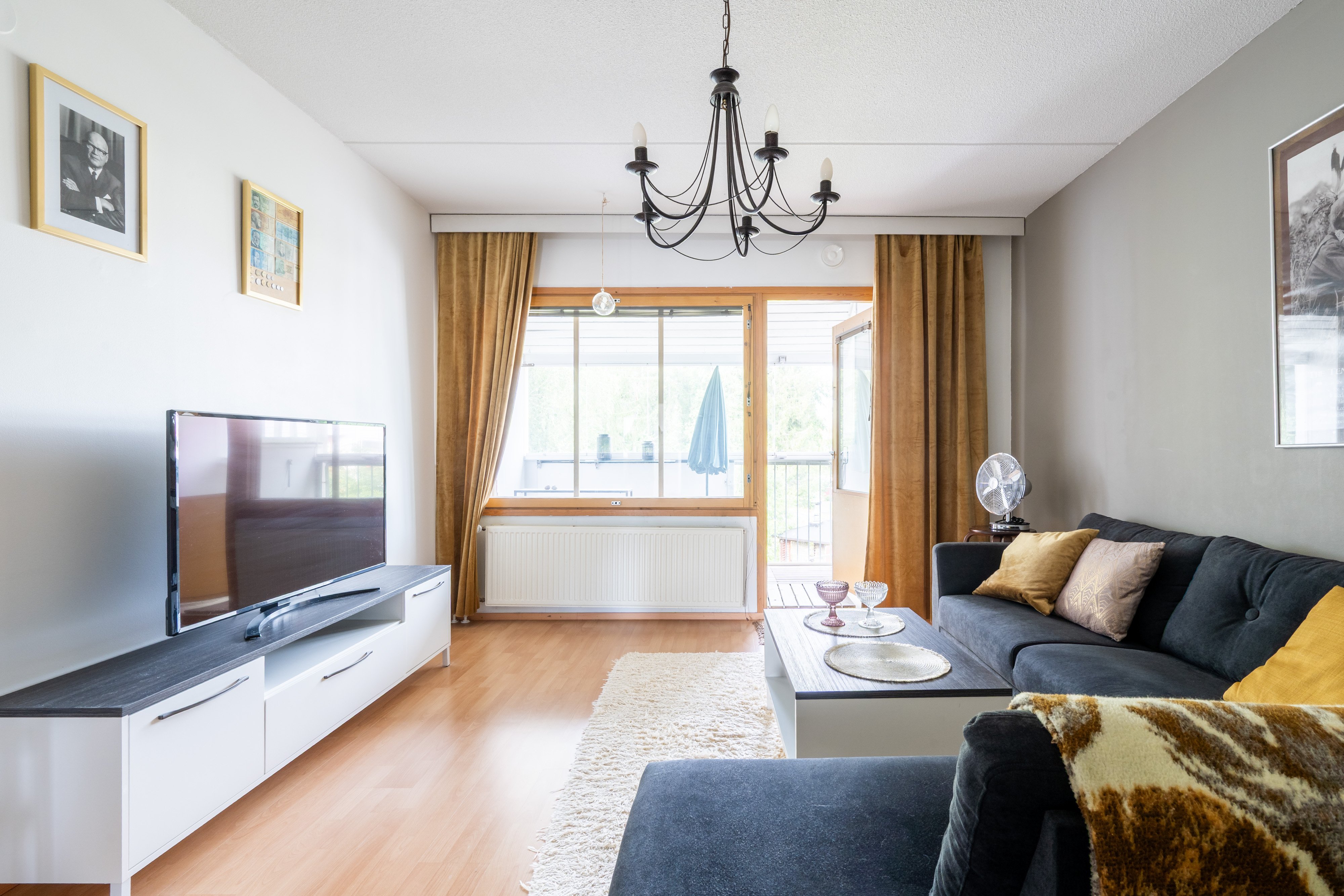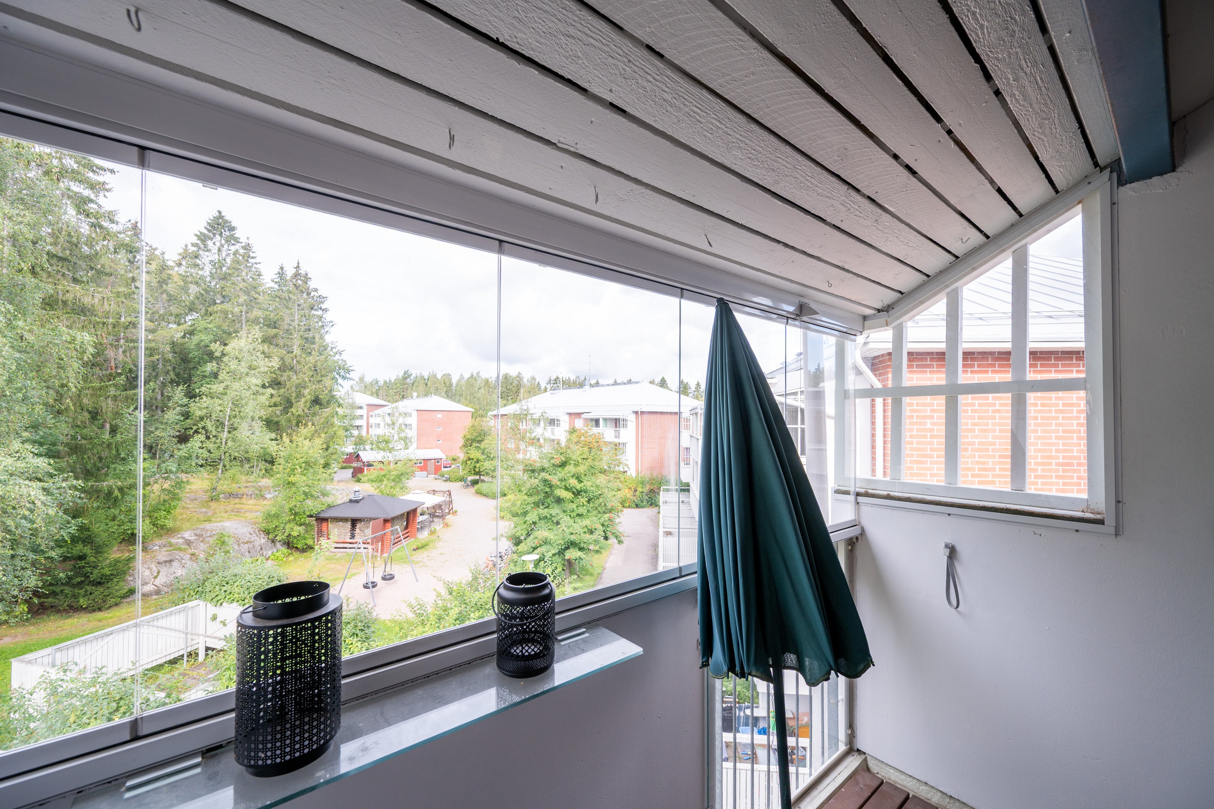 Tässä kodissa on rauha, valo ja arjen helppous samassa paketissa. Kolmannen kerroksen kulma-asunto avautuu lasitetulle parvekkeelle länteen.
