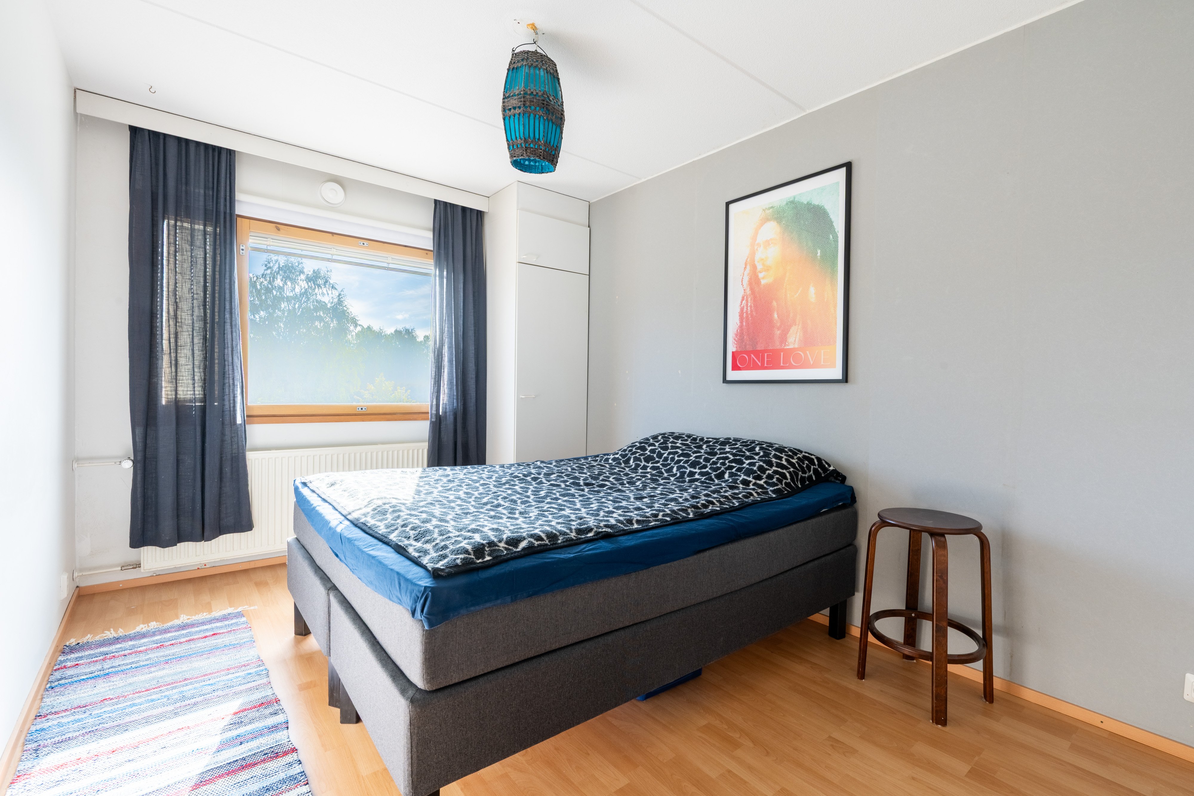 59,5 neliötä on jaettu käytännöllisesti: tilava olohuone, selkeä makuuhuone ja erillinen keittiö, jossa ruoanlaitto tuoksuineen pysyy omassa rauhassaan. Savion Marttilankadulla asut taloyhtiössä, jota kuvaillaan hyväksi ja rauhalliseksi.