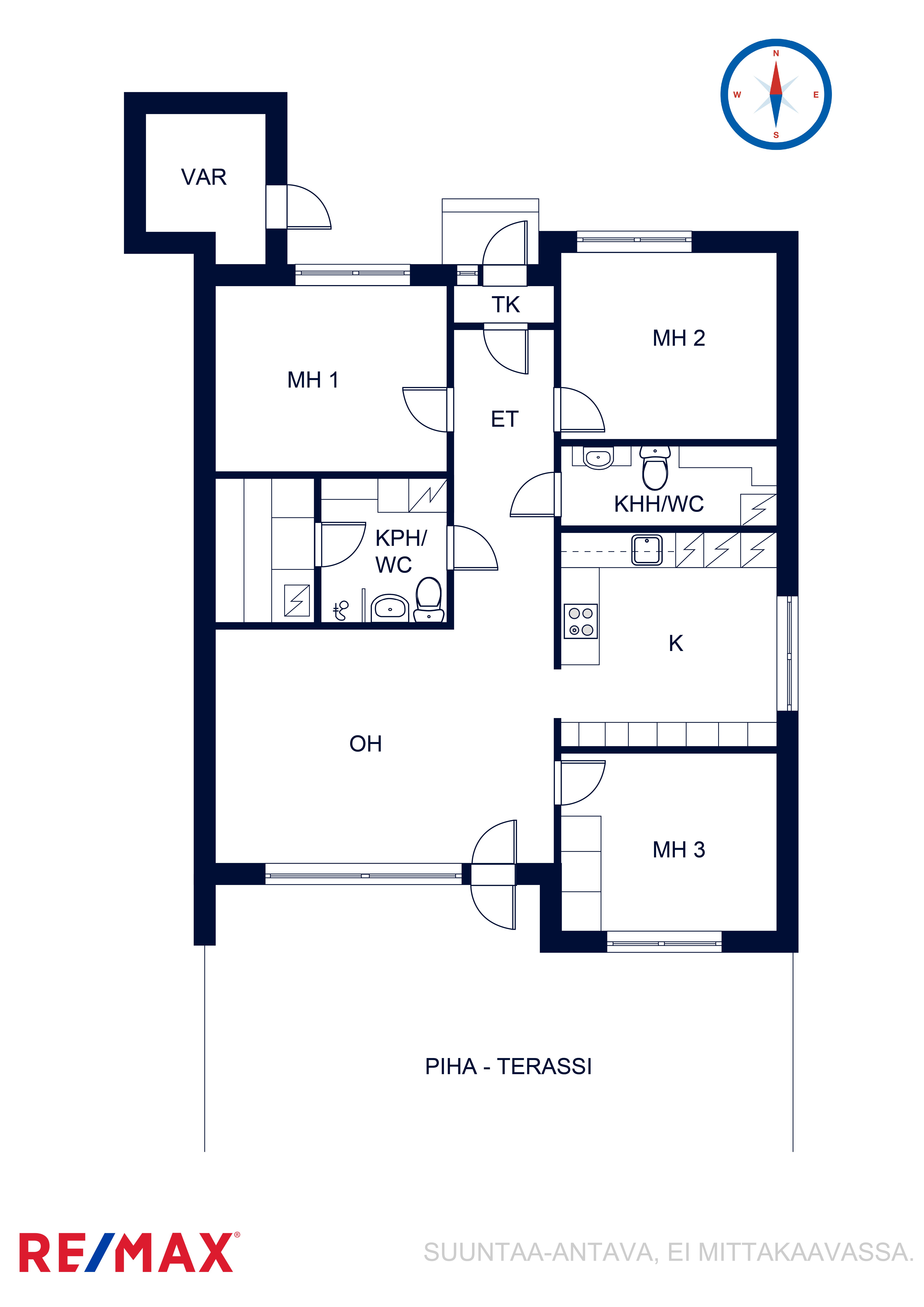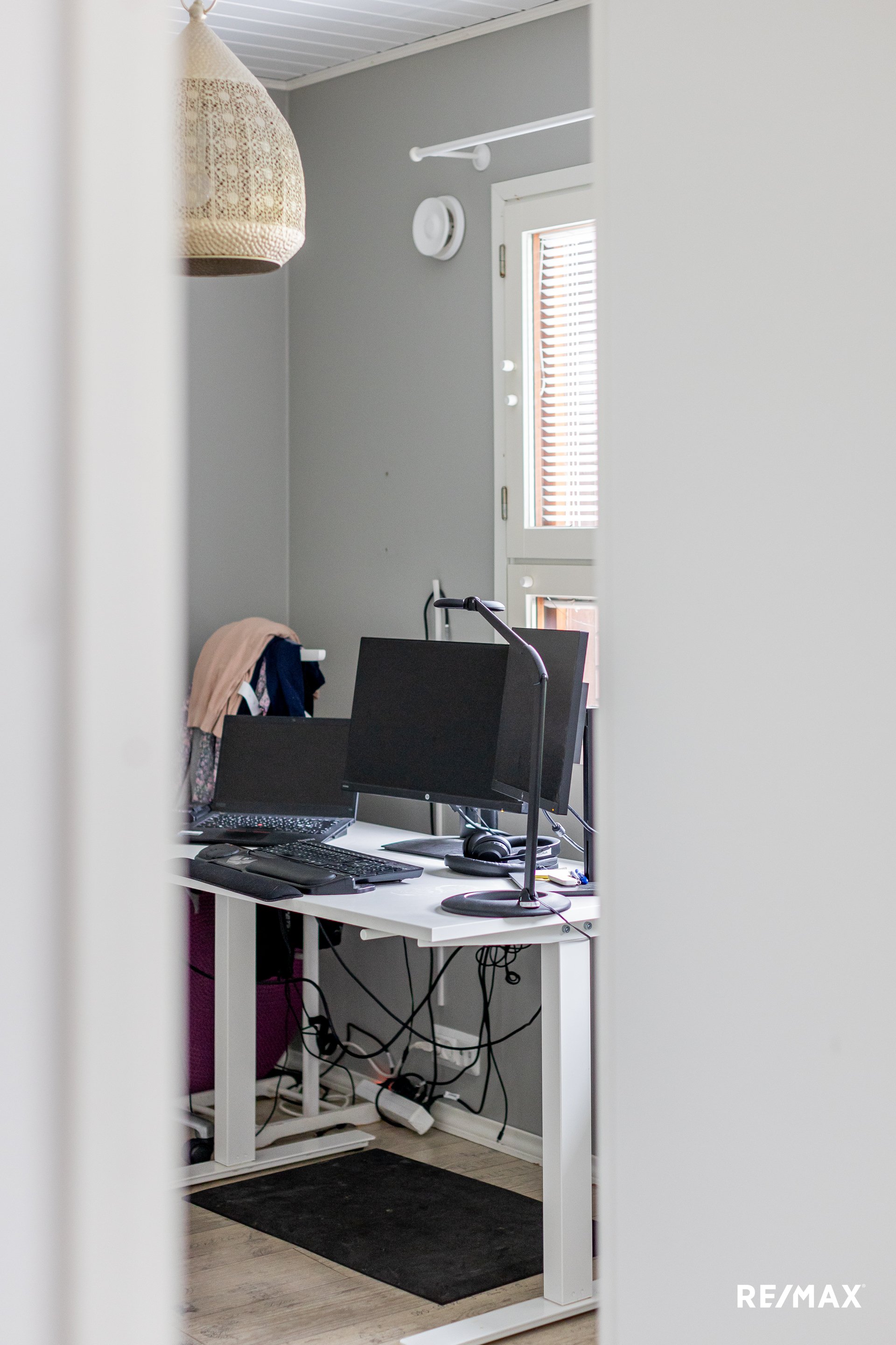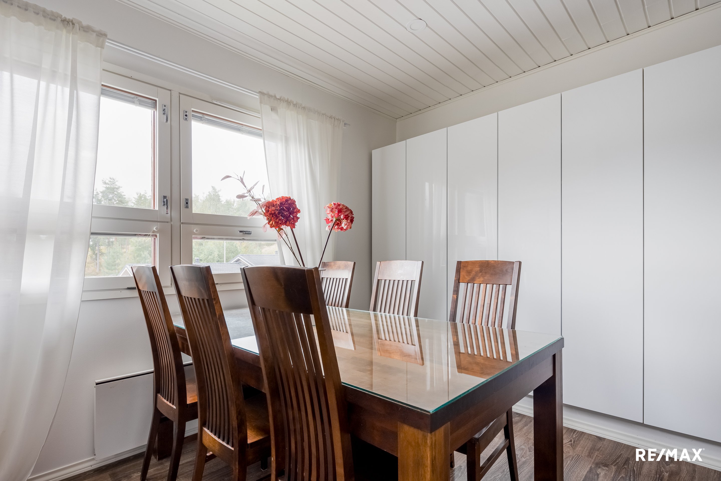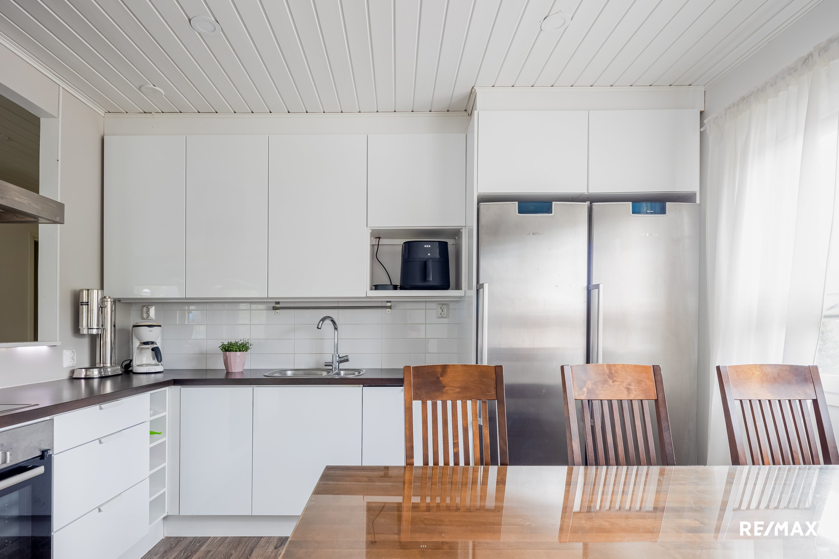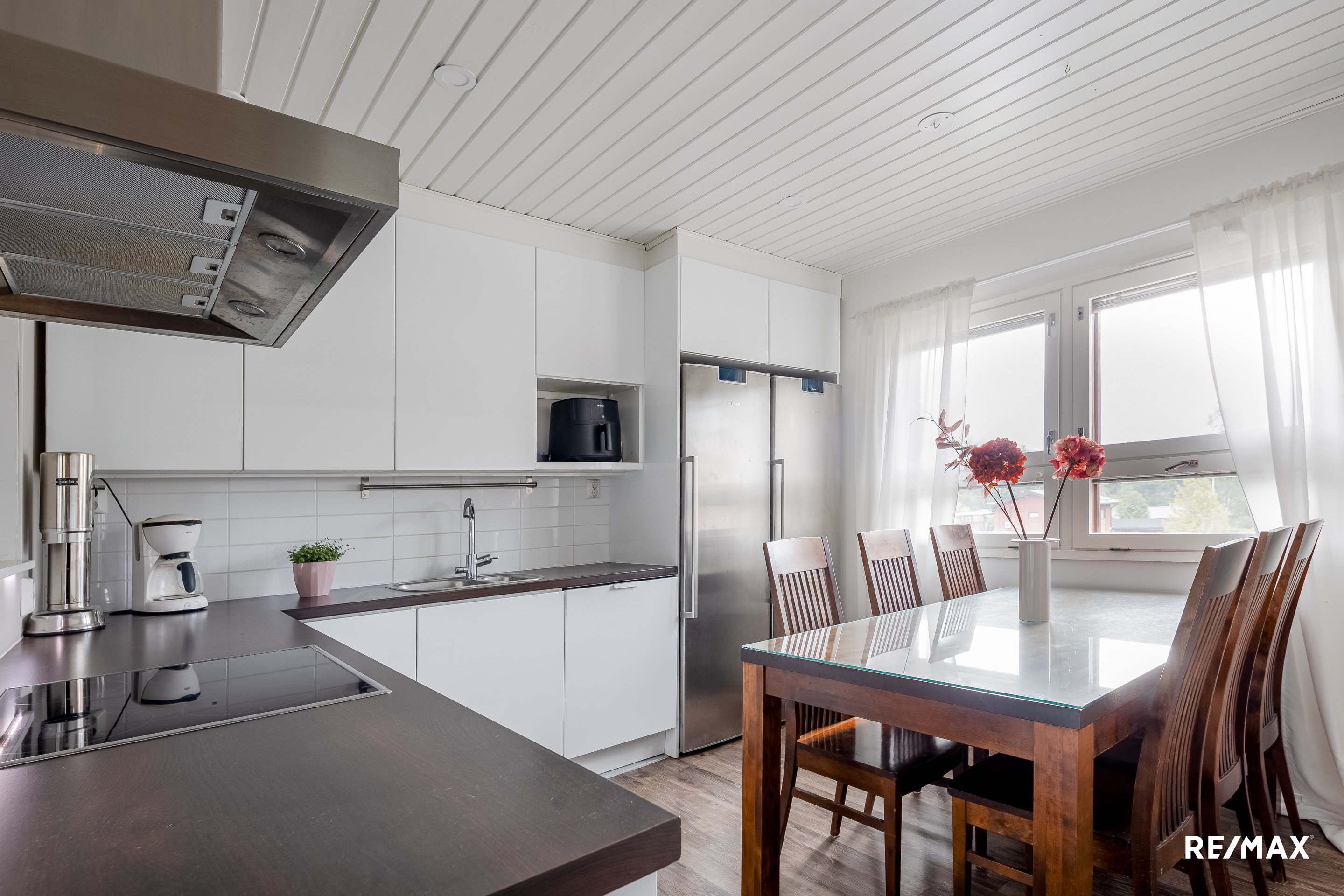 Kodin sydän on valoisa ja avara olohuone, joka avautuu tilavaan moderniin keittiöön. Vaaleasävyinen keittiö tarjoaa paikan isolle ruokailuryhmälle, runsaasti kaappi- ja laskutilaa sekä laadukkaat kodinkoneet, jotka tekevät ruoanlaitosta helppoa ja inspiroivaa. Kolme erillistä makuuhuonetta tarjoavat jokaiselle oman rauhan sekä runsaasti säilytystilaa, ne sopivat mainiosti niin perheen arkeen kuin etätyöhönkin.