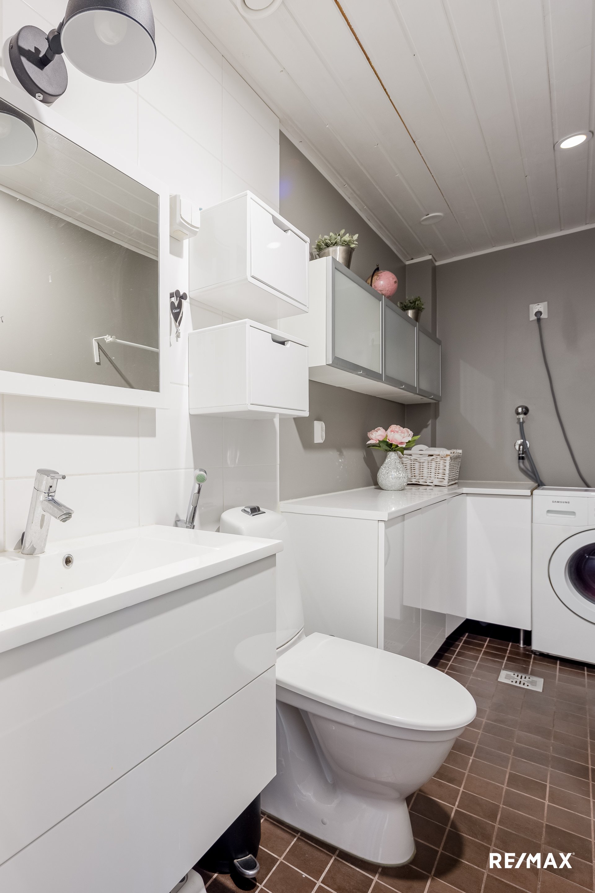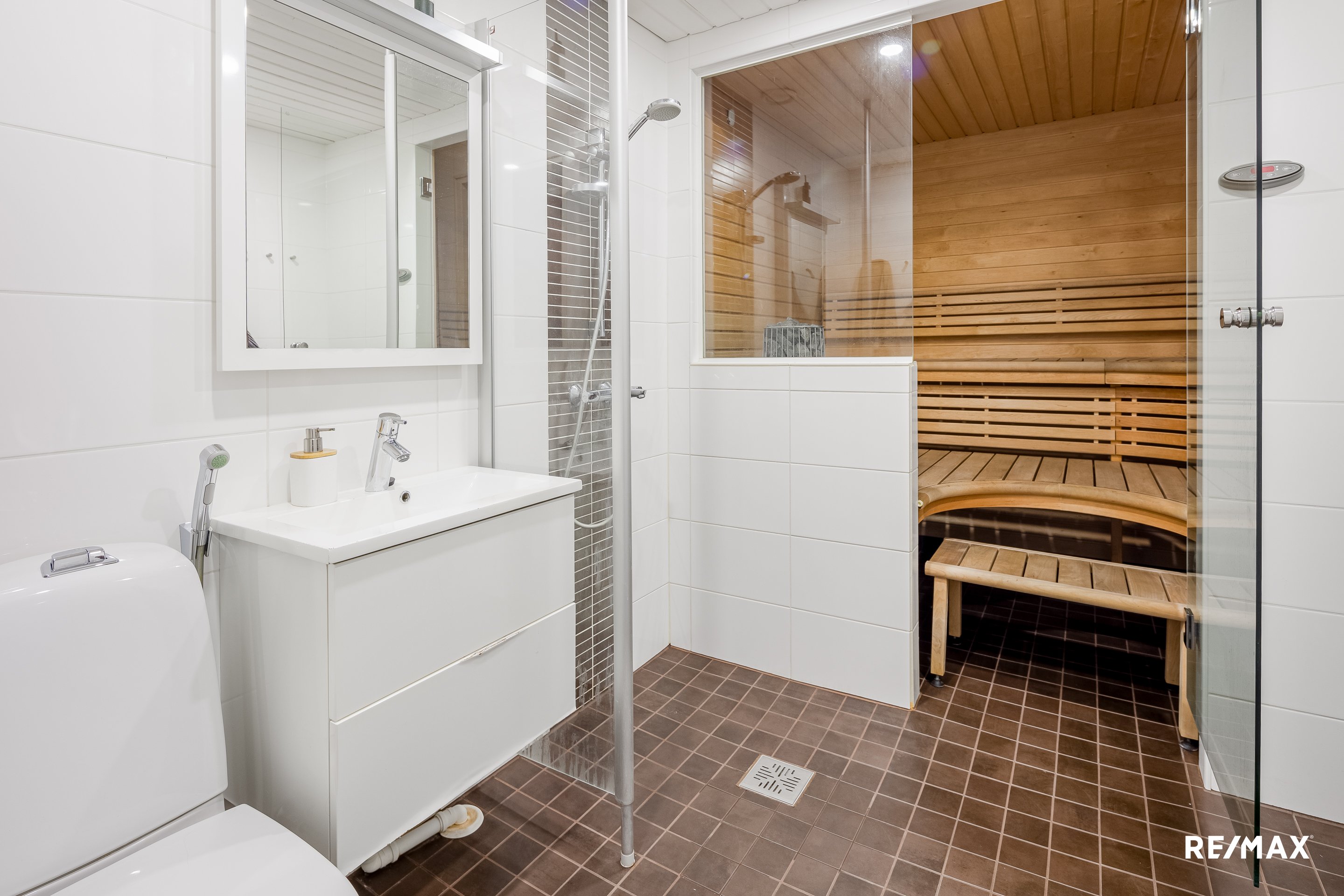 Asunnon arkea sujuvoittaa erillinen wc/kodinhoitohuone, jossa on hyvin suunnitellut tilat niin kodinhoidolle kuin pesukoneelle ja kuivausrummulle. Asunnon kruunaa tilava ja tunnelmallinen sauna, joka tarjoaa täydellisen paikan rentoutua ja unohtaa arjen kiireet. Saunan yhteydessä sijaitsee oma kylpyhuone/wc, jonka vaaleat laatat ja kalusteet luovat raikkaan ja tyylikkään ilmeen.