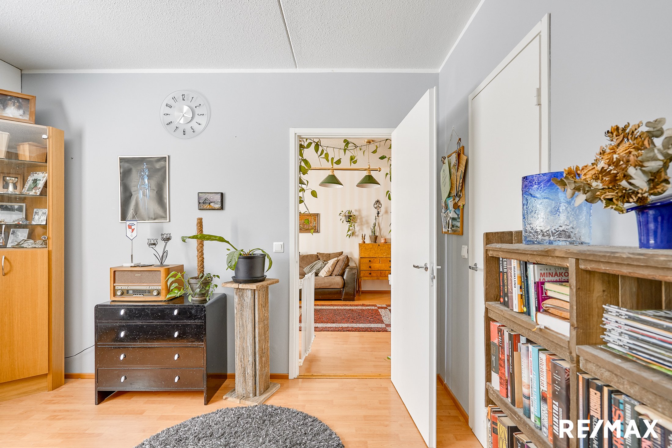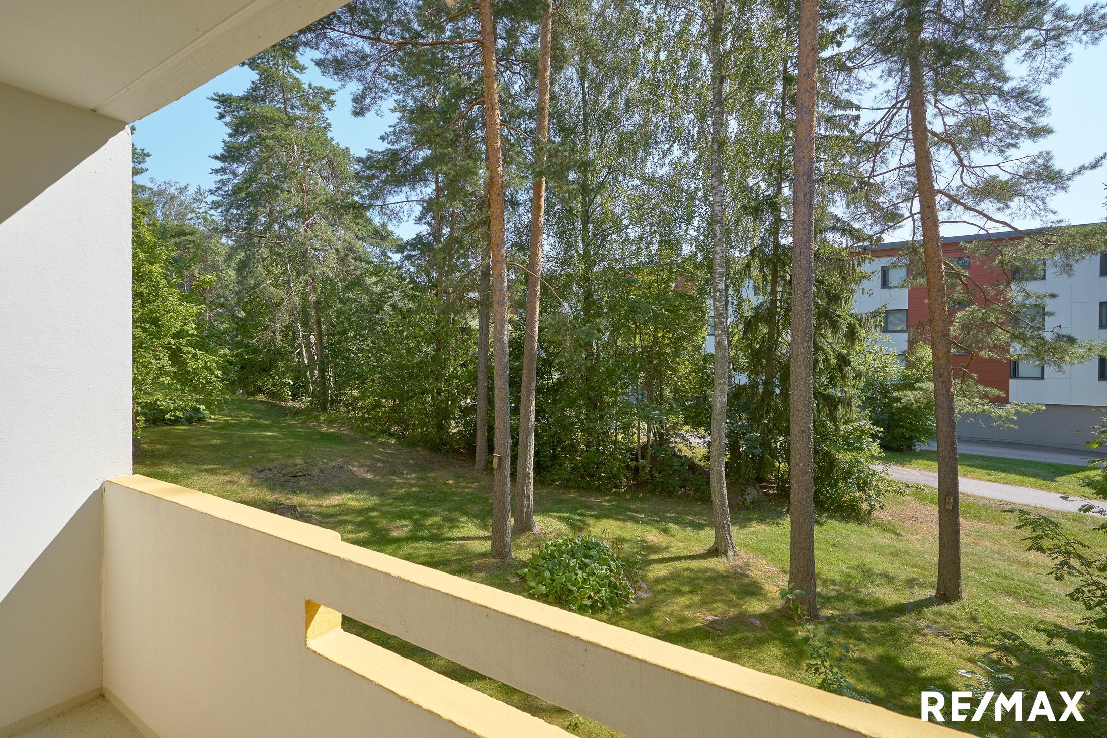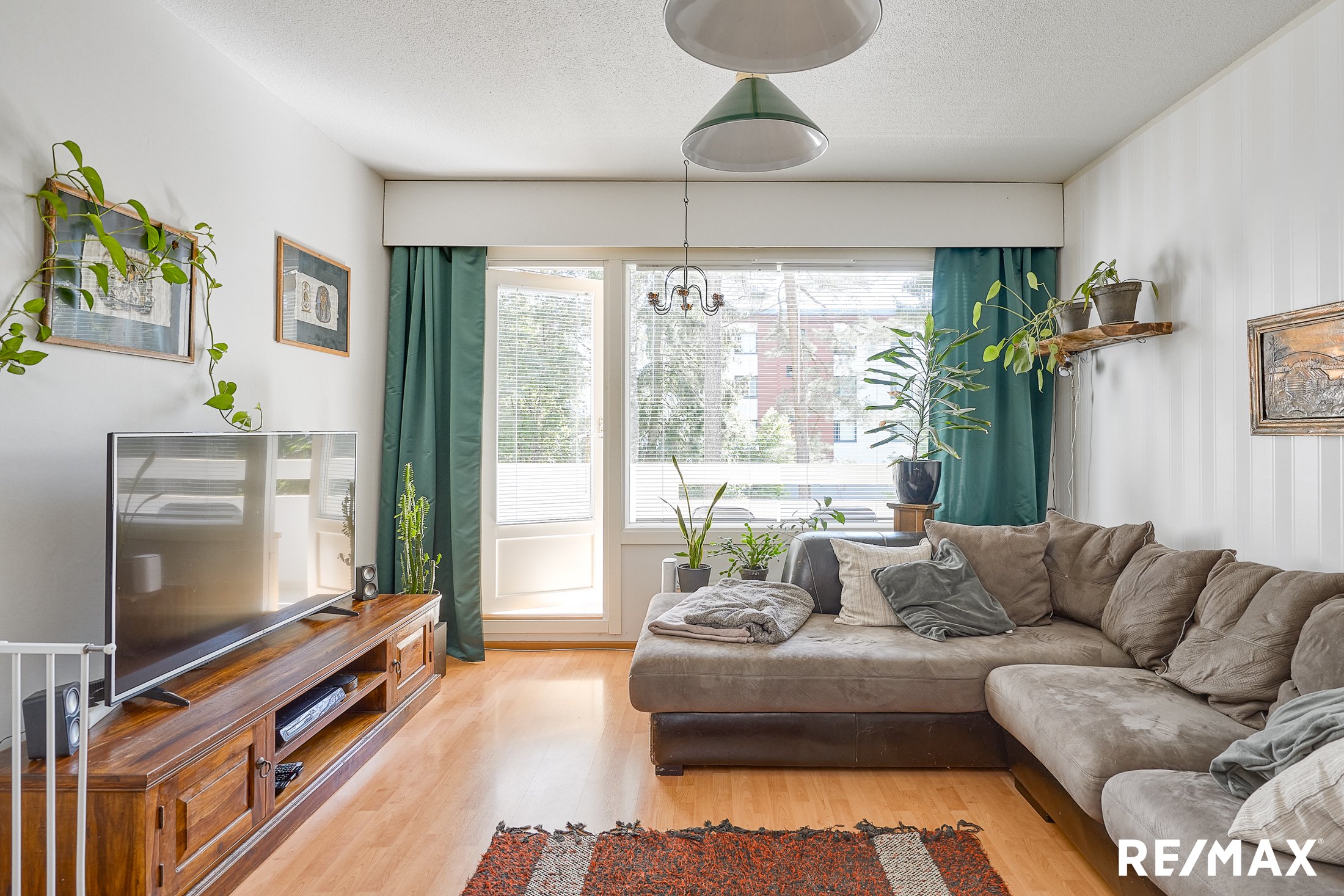 Pesuhuone laattapinnoilla. Tilava keittiö, josta ikkunanäkymät sisäpihalle. Asunnossa kaksi makuuhuonetta ja toisesta käynti vaatehuoneeseen. Viihtyisästä olohuoneesta käynti parvekkeelle ja näkymät vehreälle takapihalle. Huoneistoon kuuluu kaksi huoneistovarastoa taloyhtiön yhteistiloissa.
