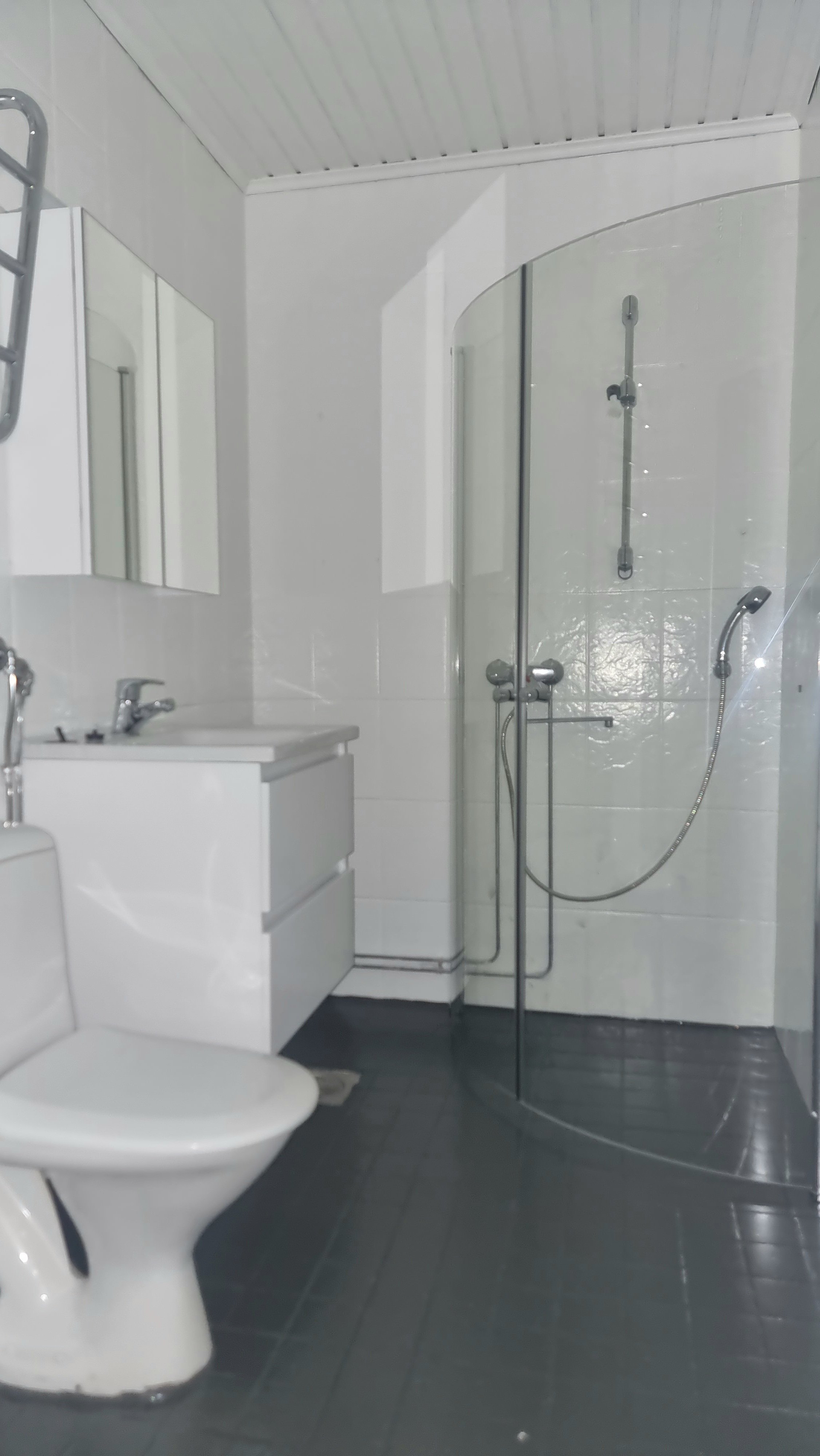 WC-istuin, suihku, suihkukaappi, pesukoneliitäntä, peili ja pesuallas
