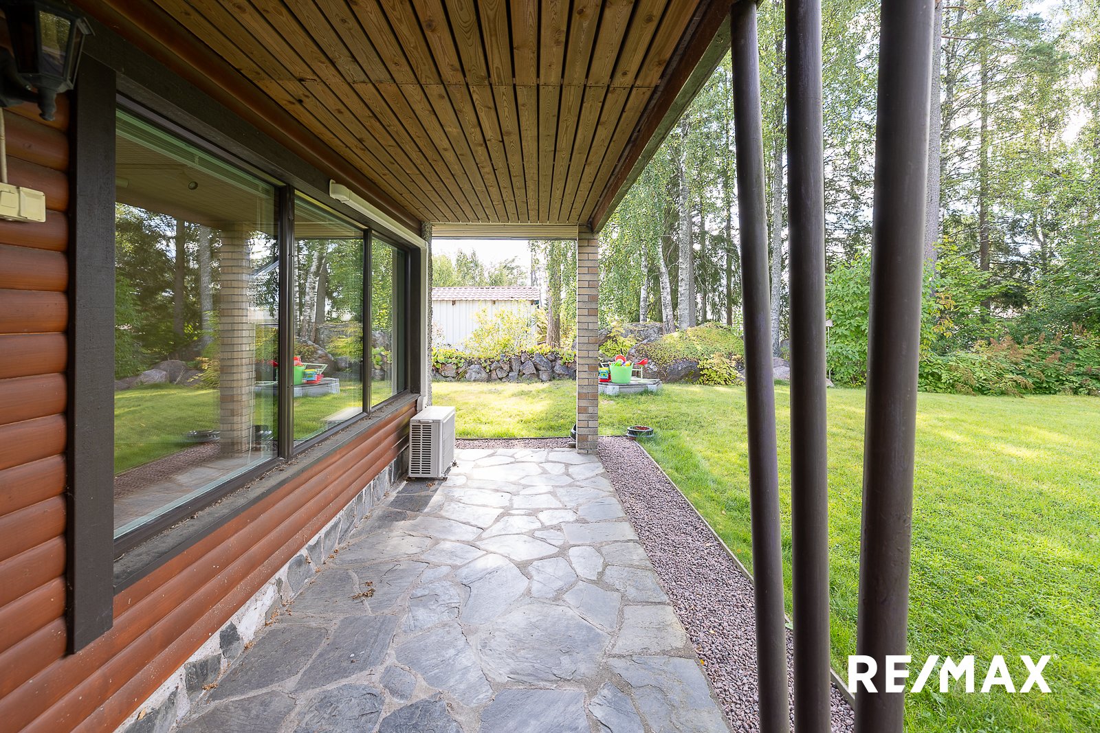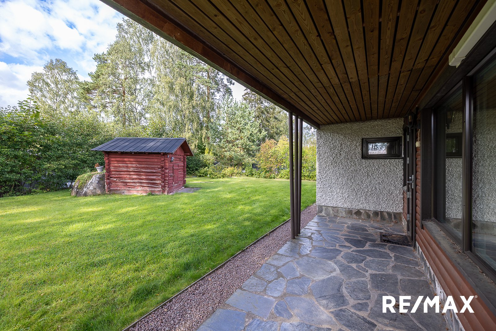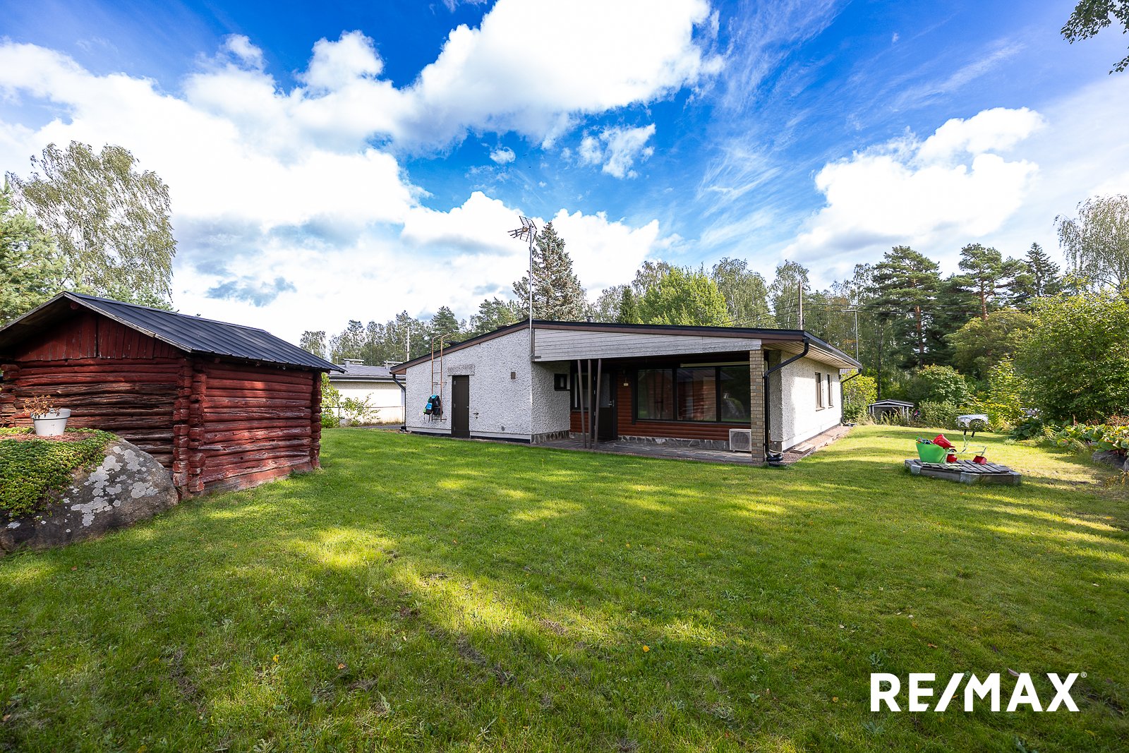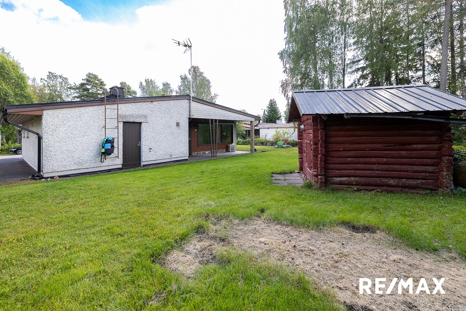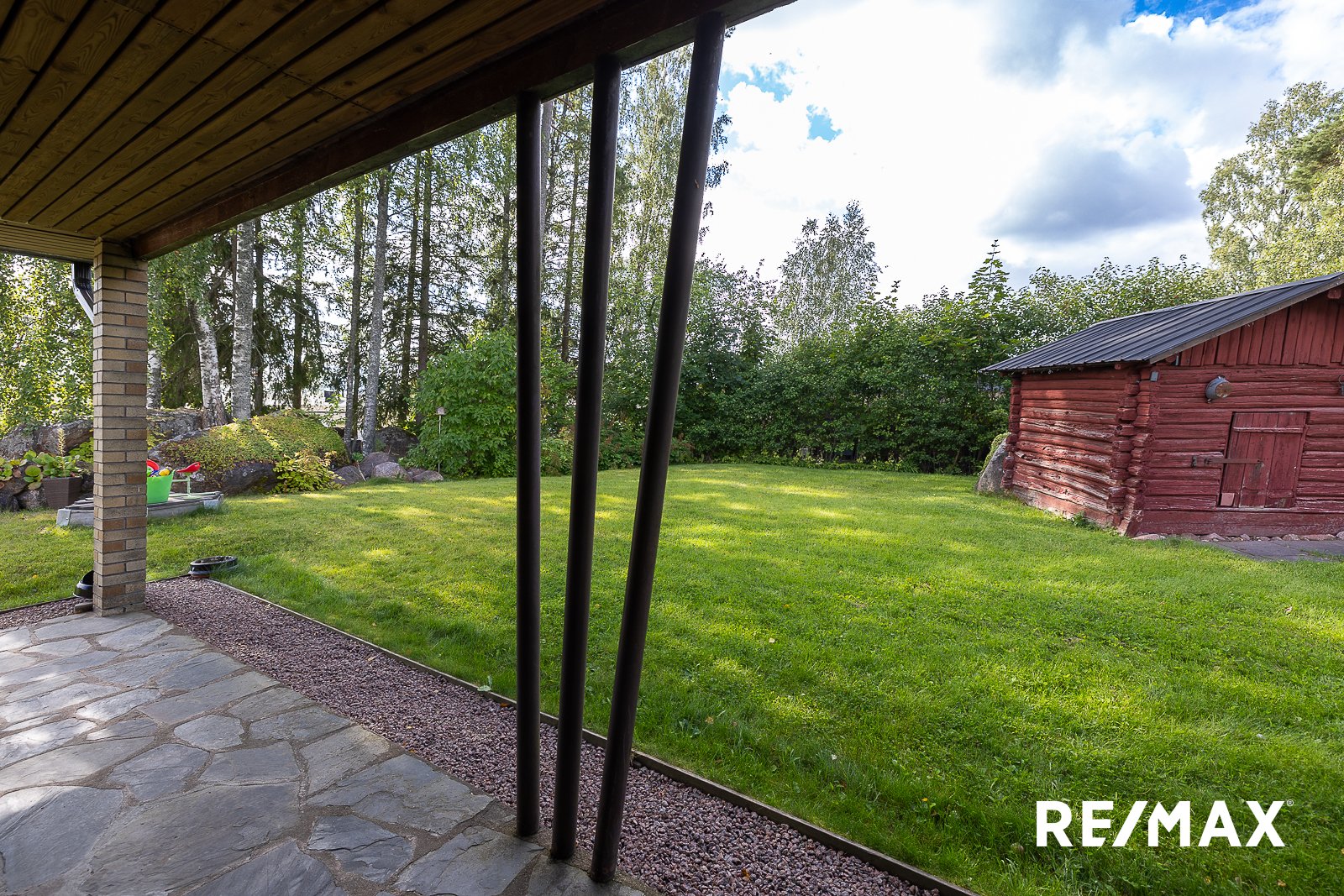 Tasainen ja helppohoitoinen piha kutsuu viihtymään ja erityisen viehättävä lisä on takapihalla sijaitseva vanha aittarakennus.