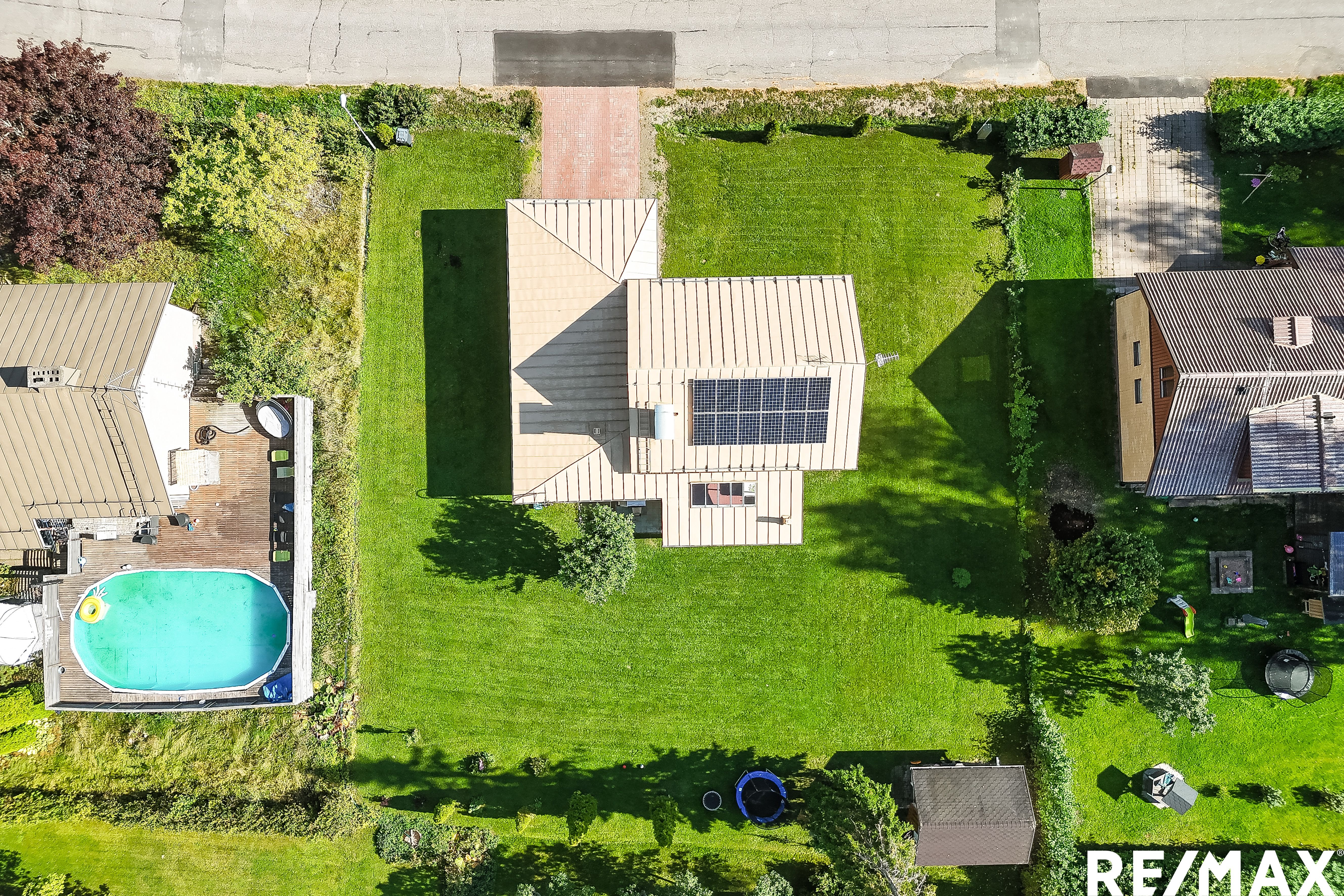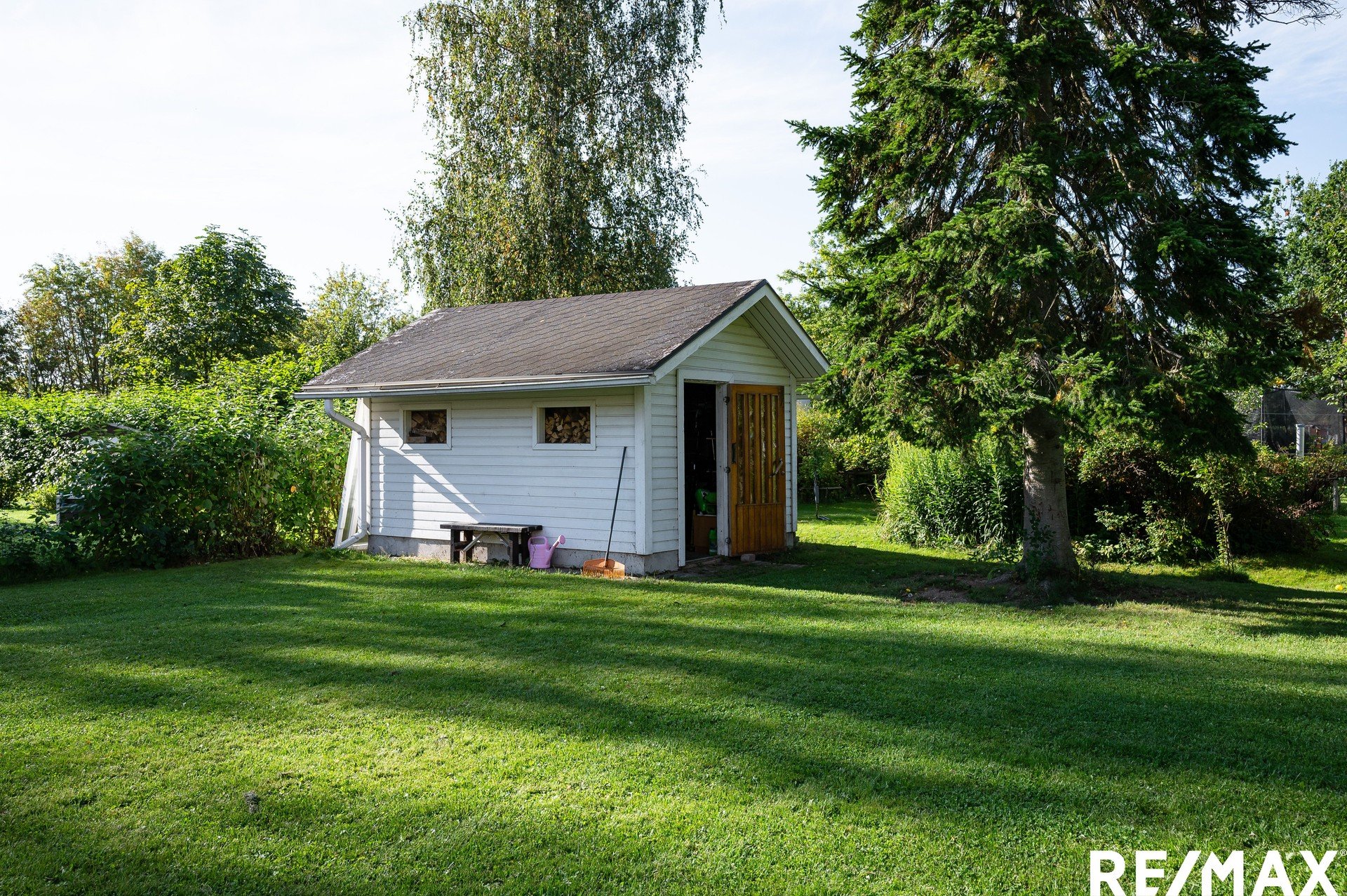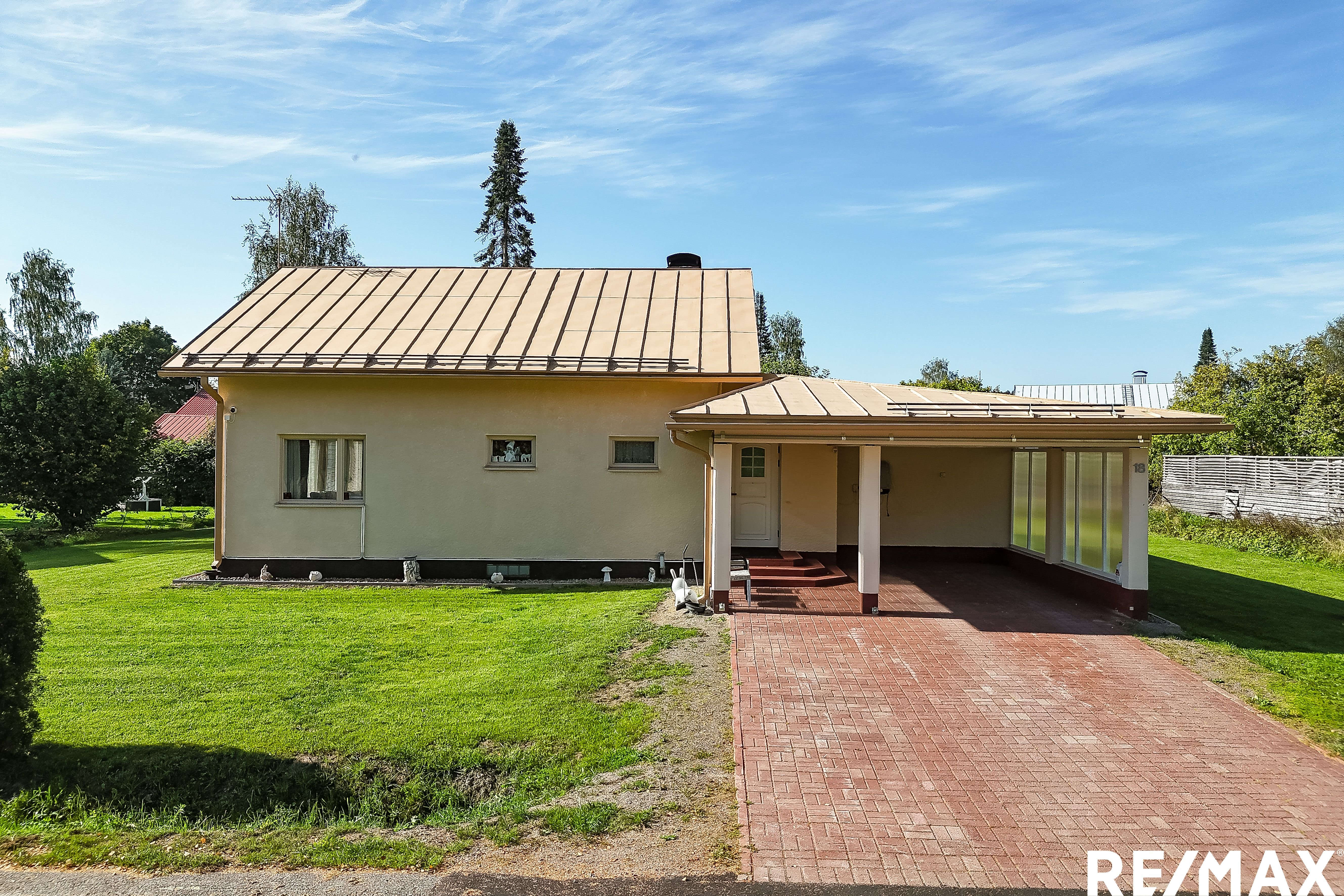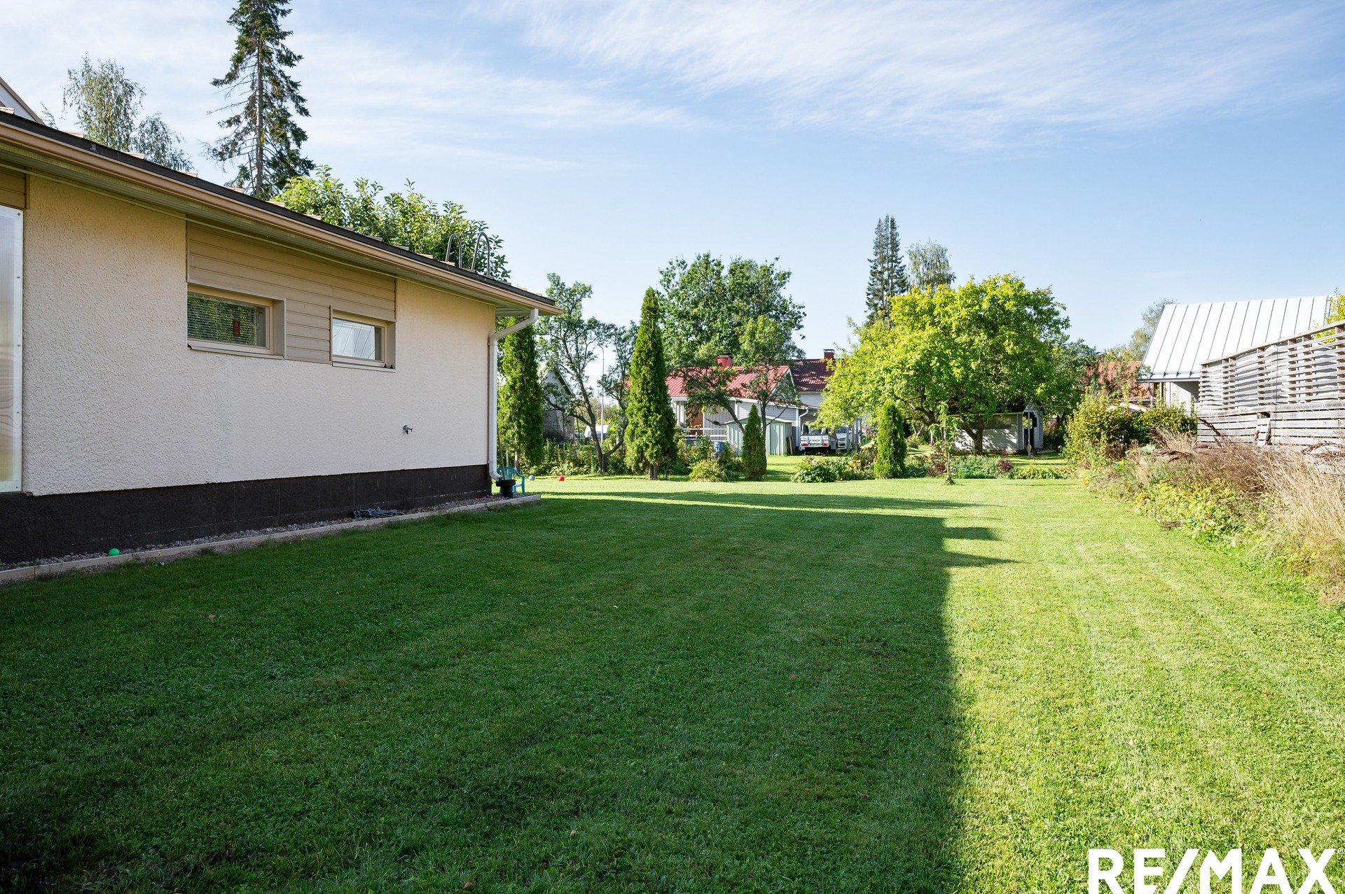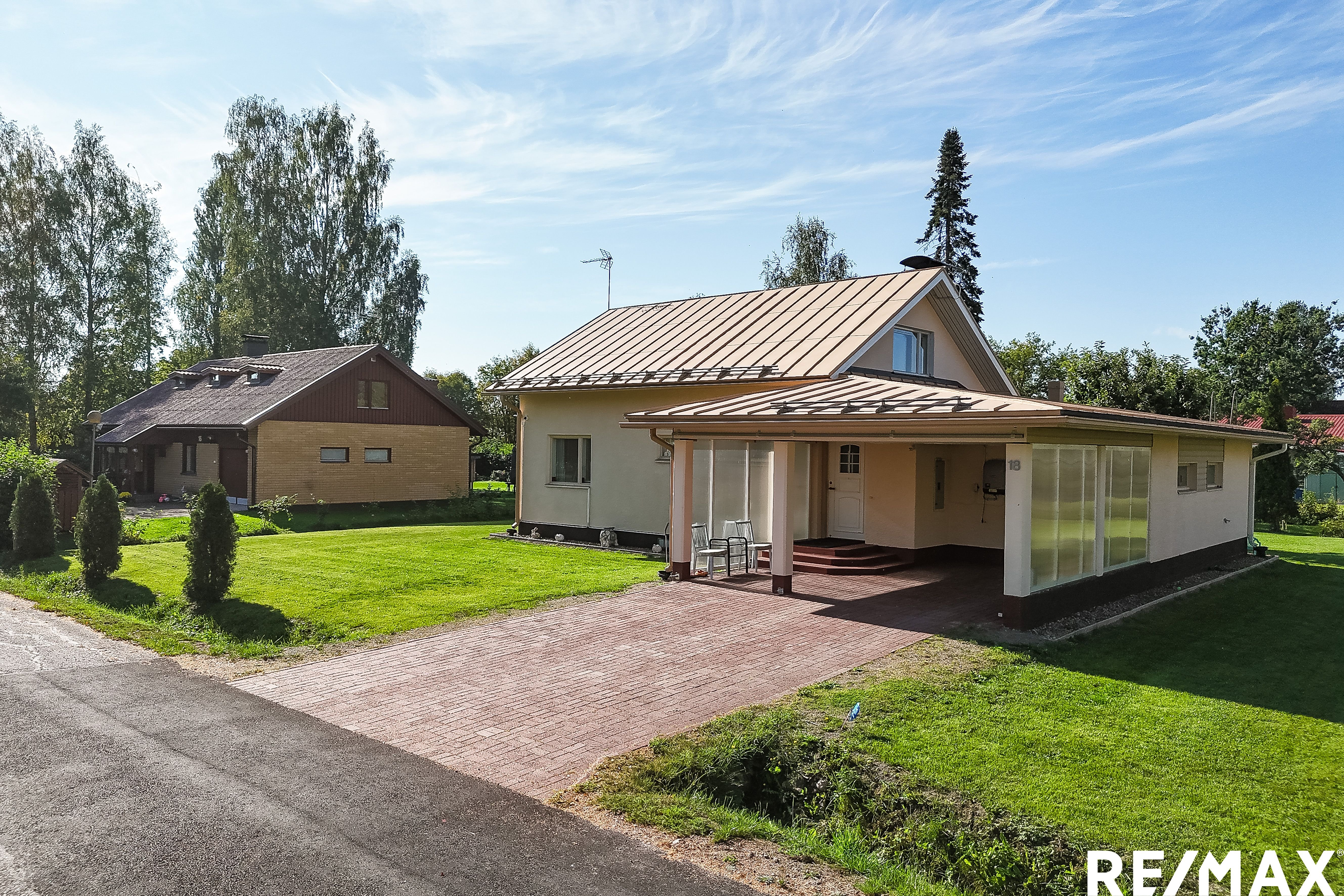 Vehreä tontti tarjoaa aurinkoiset puitteet pihapiirin elämälle, ja talon yhteydessä on käytännöllinen autokatos ja pihalle mahtuu lisäksi muutama auto lisää.