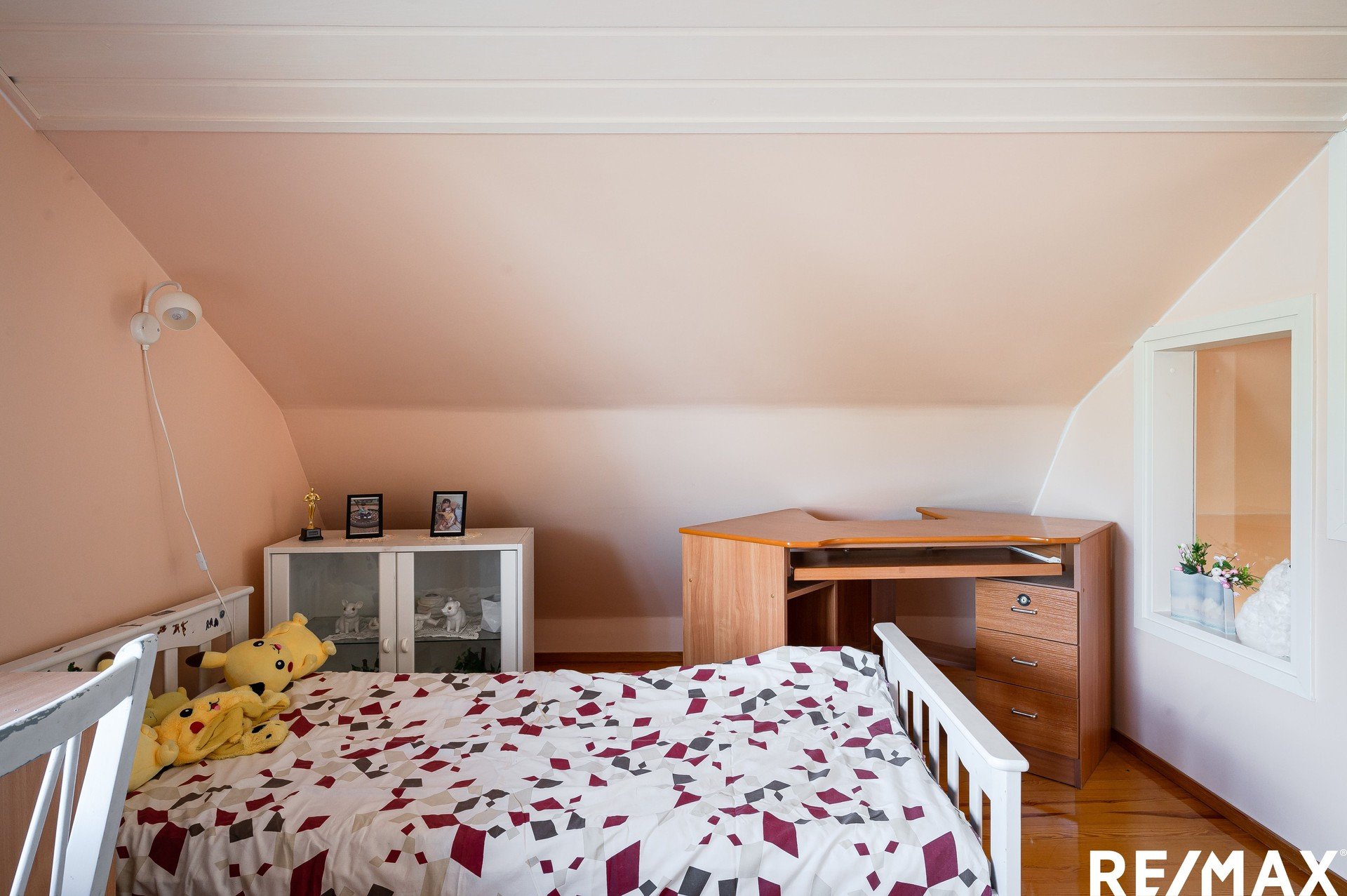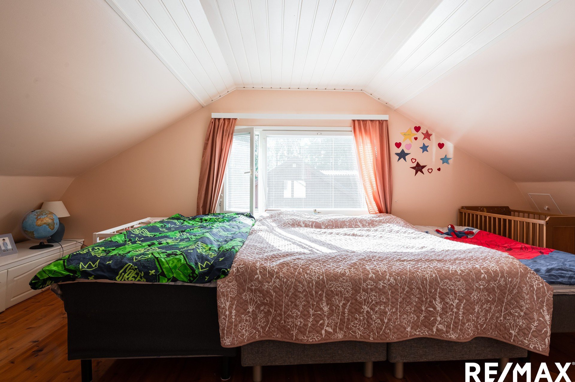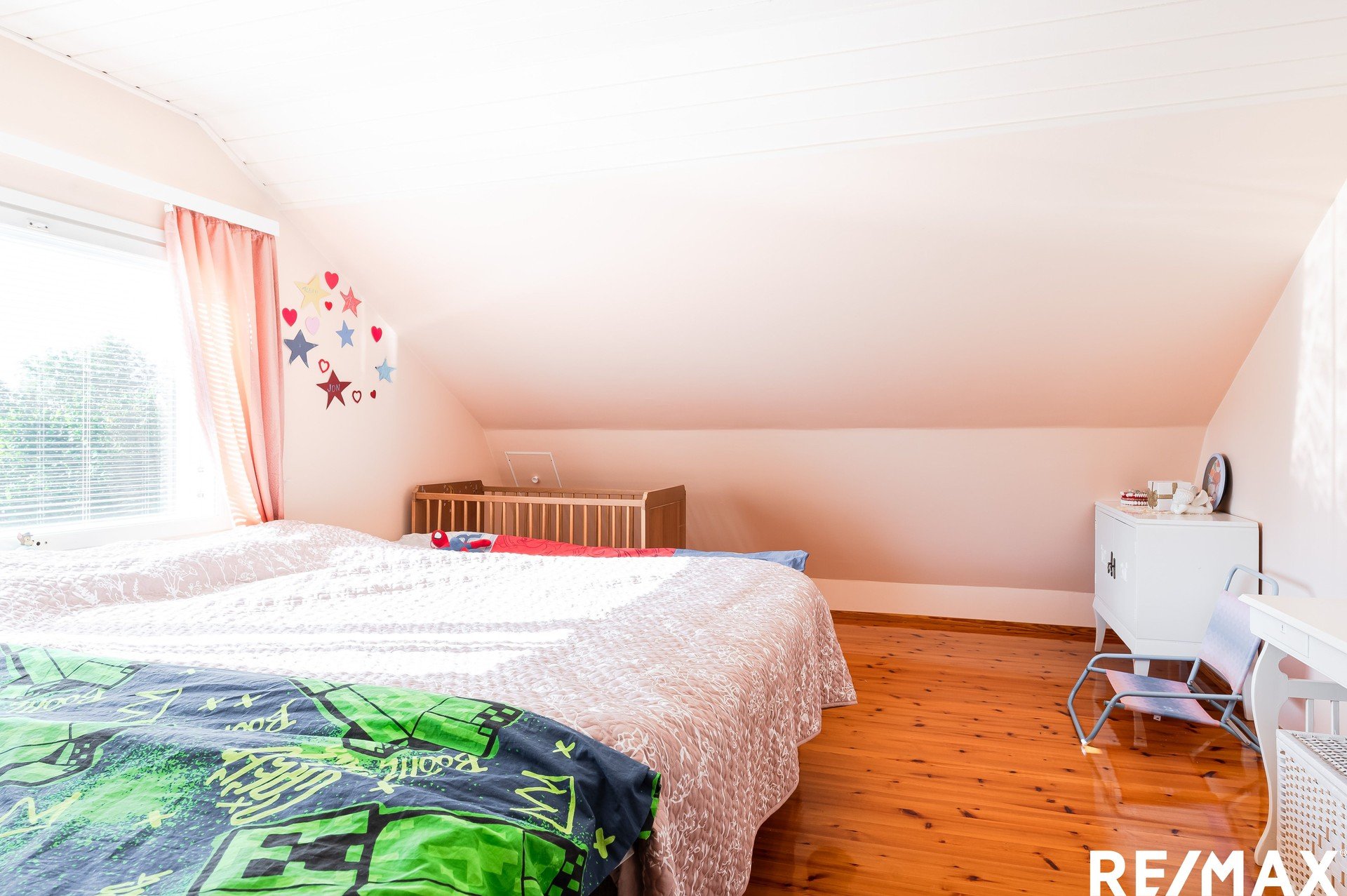 Yläkerrassa on kaksi suurta makuuhuonetta sekä wc.
