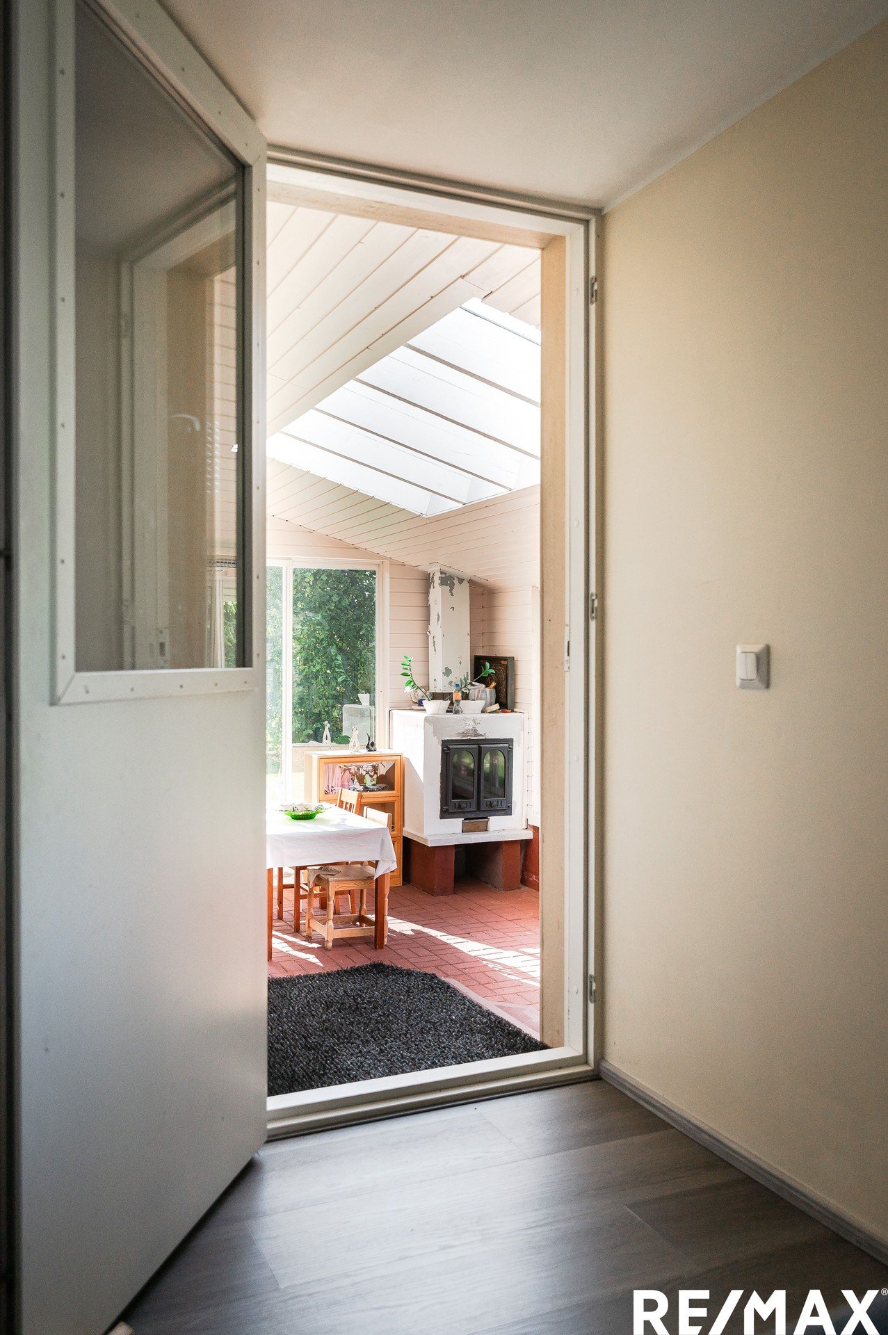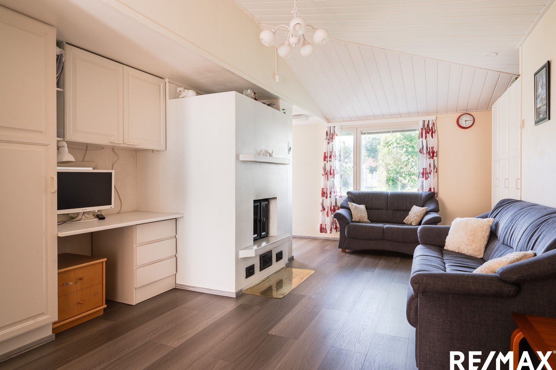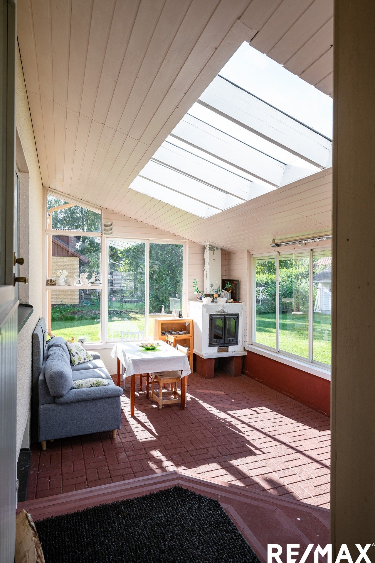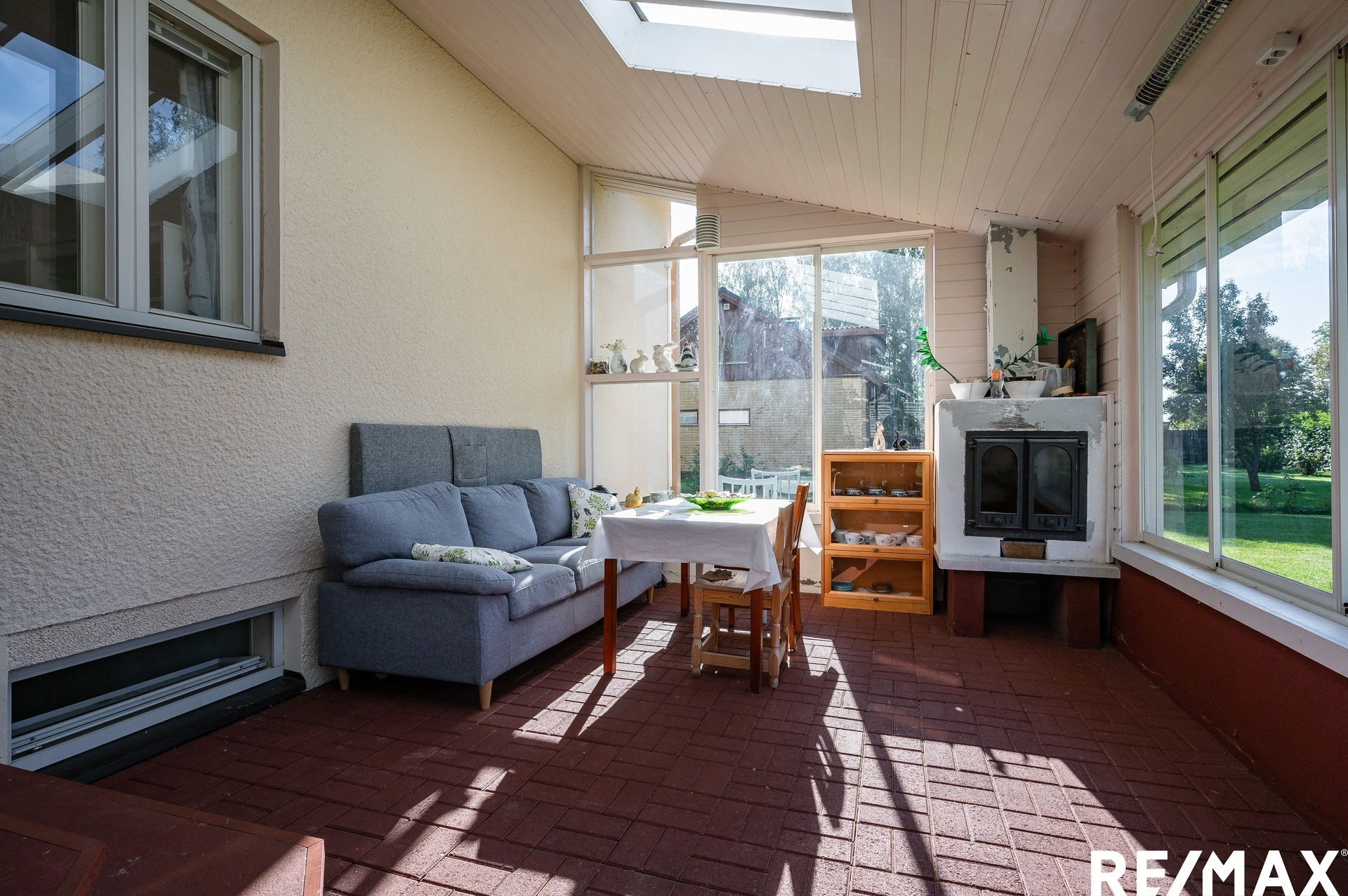 Alakerrassa valoisa olohuone isoilla ikkunoilla, tunnelmallinen takkahuone sekä katettu lasiterassi. Terassilla viihdyt pitkälle syksyyn lämmittimien ja takan ansiosta.