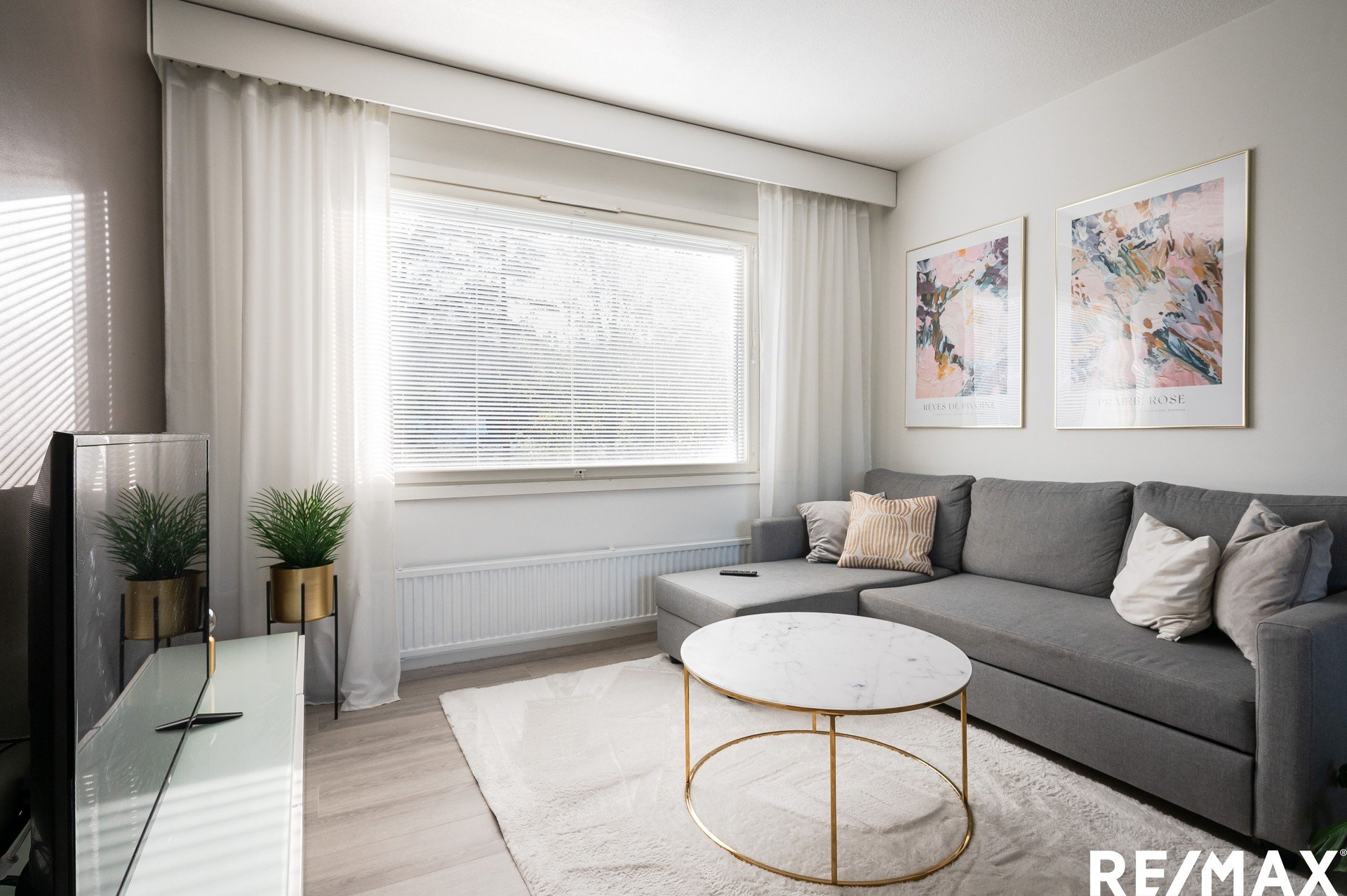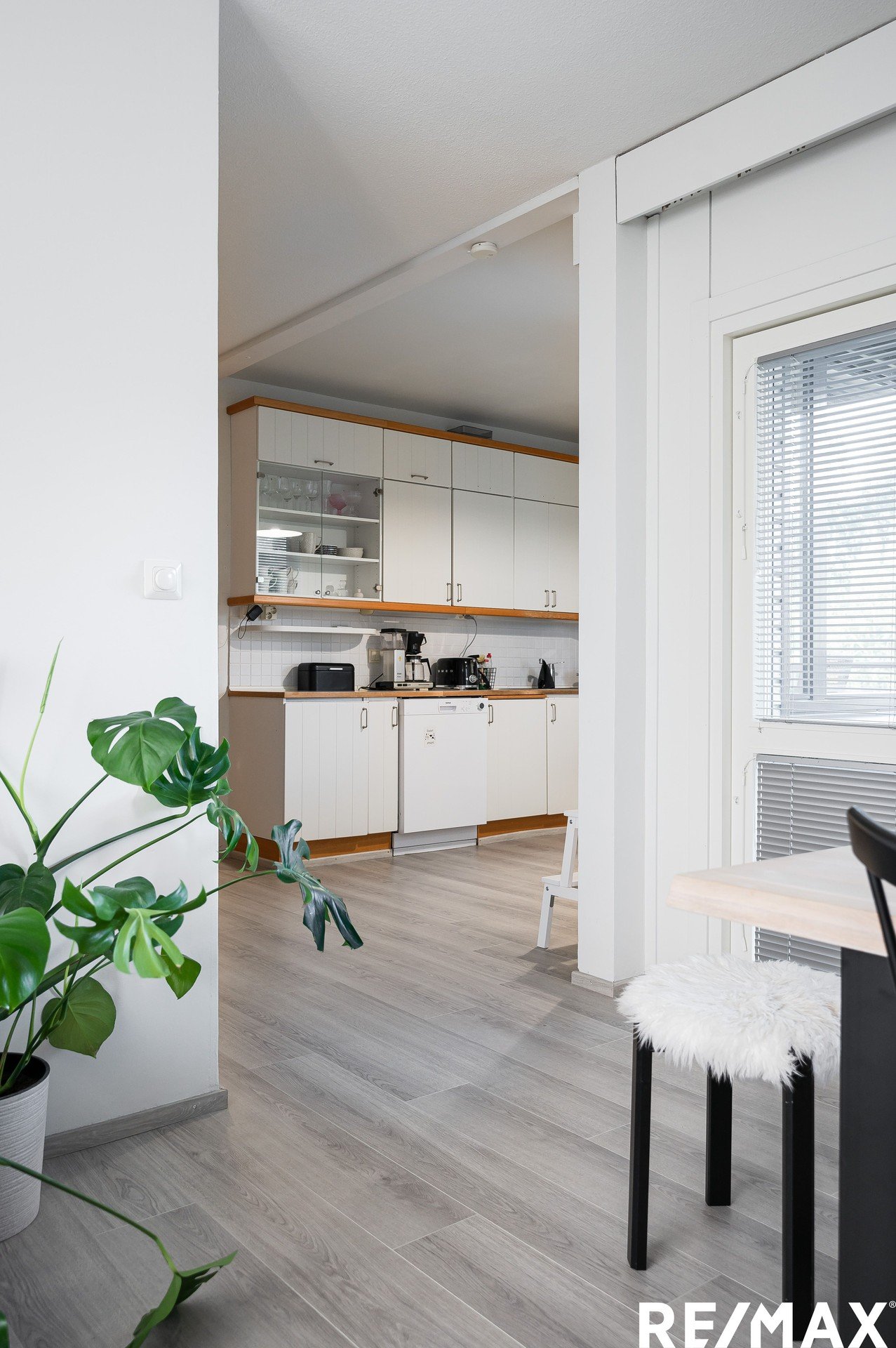 Valoisassa ja toimivapohjaisessa kodissa arki sujuu vaivattomasti. Olohuoneessa on ikkunat sekä pohjoiseen että etelään, joten luonnonvalo kulkee kauniisti huoneen läpi. Keittiön ikkuna avautuu puolestaan itään. Asumisen helmeä täydentää tilava lasitettu parveke, jolta avautuvat rauhoittavat puistonäkymät – kuin oma pieni kesähuone pitkälle syksyyn.