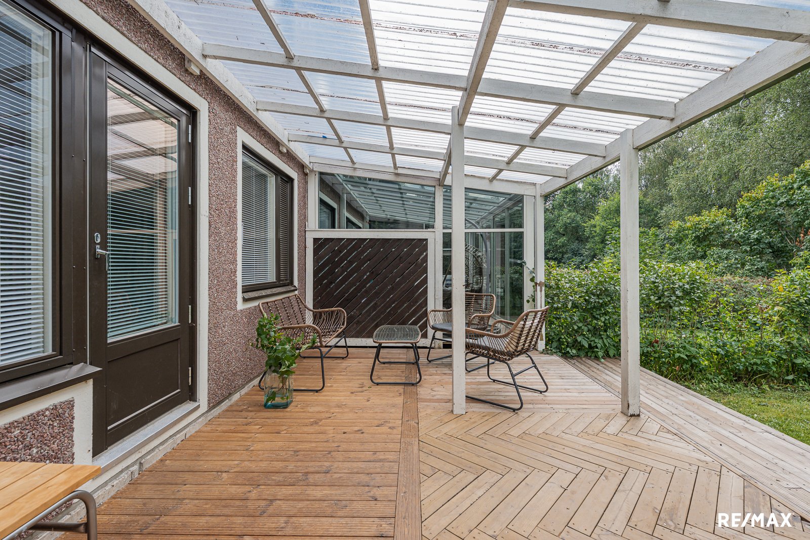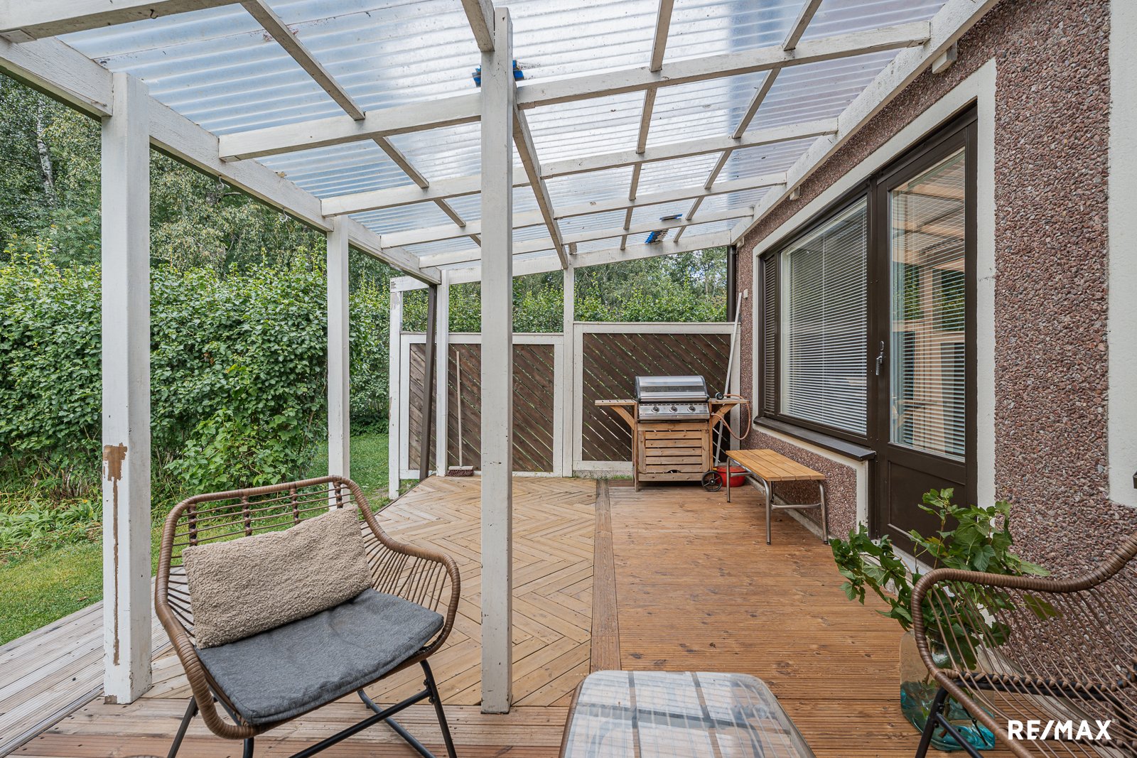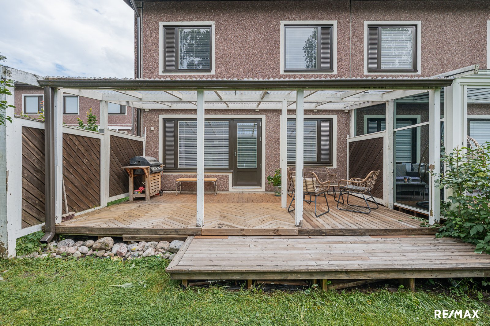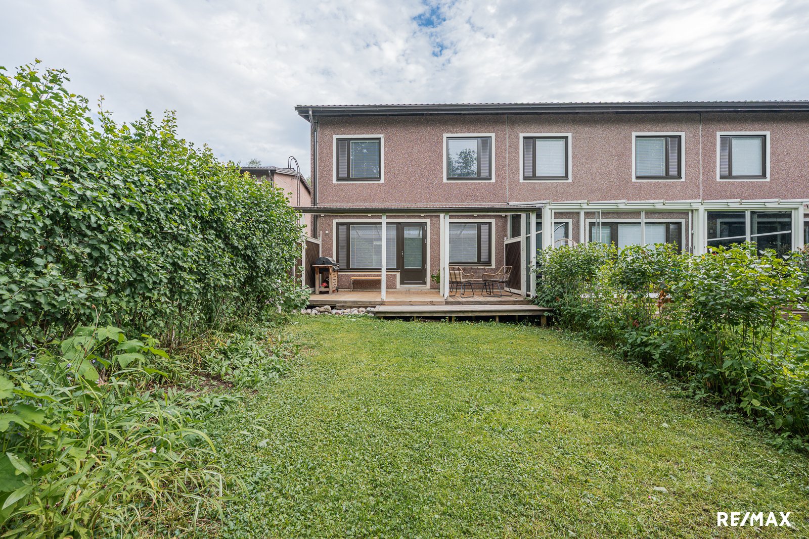 Alakerrassa on eteinen, olohuone, ruokailutila, keittiö ja erillinen wc. Olohuoneesta on käynti takapihan valokatetulle terasille ja suojaisa takapiha on vehreä ja edessä ei ole taloja.