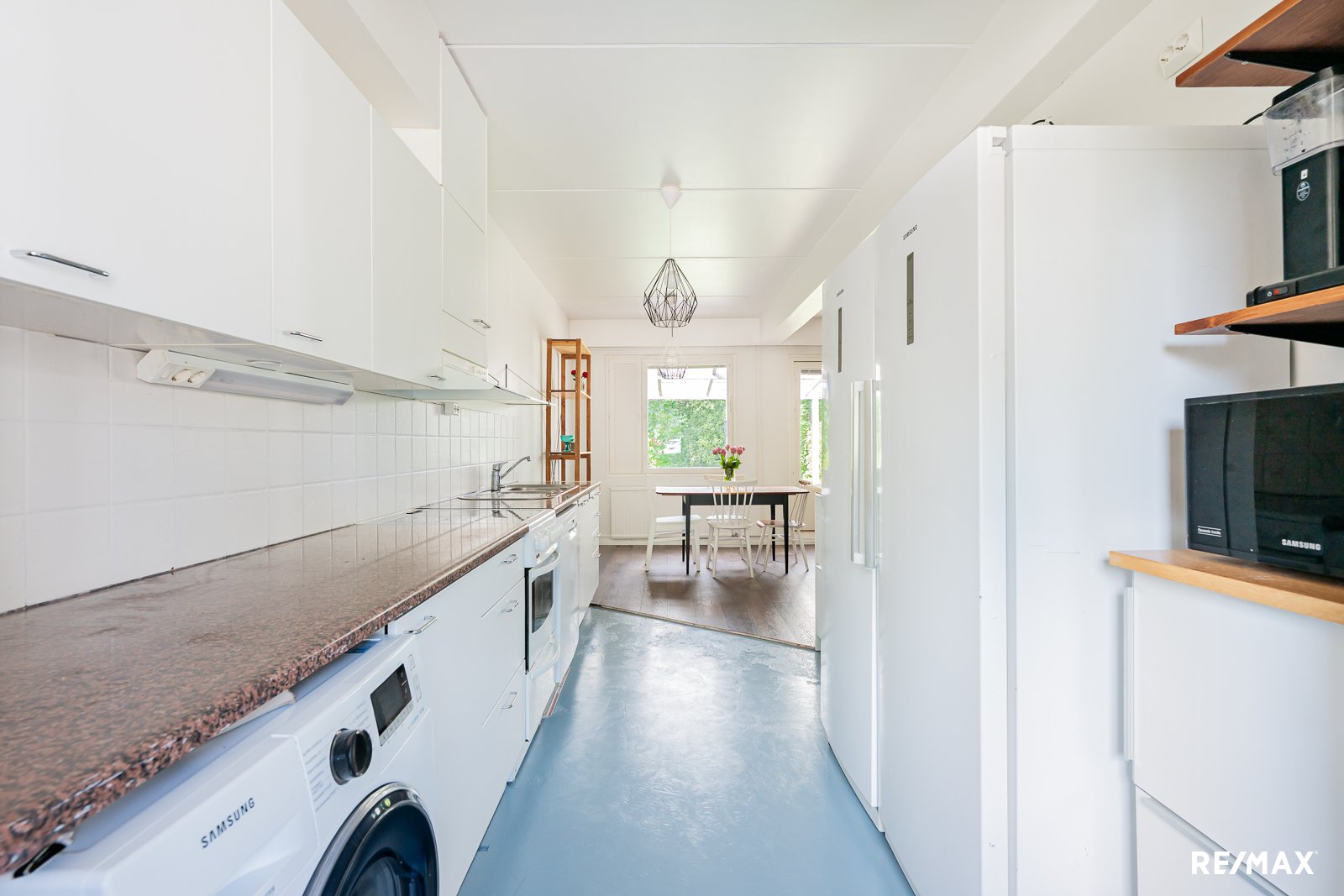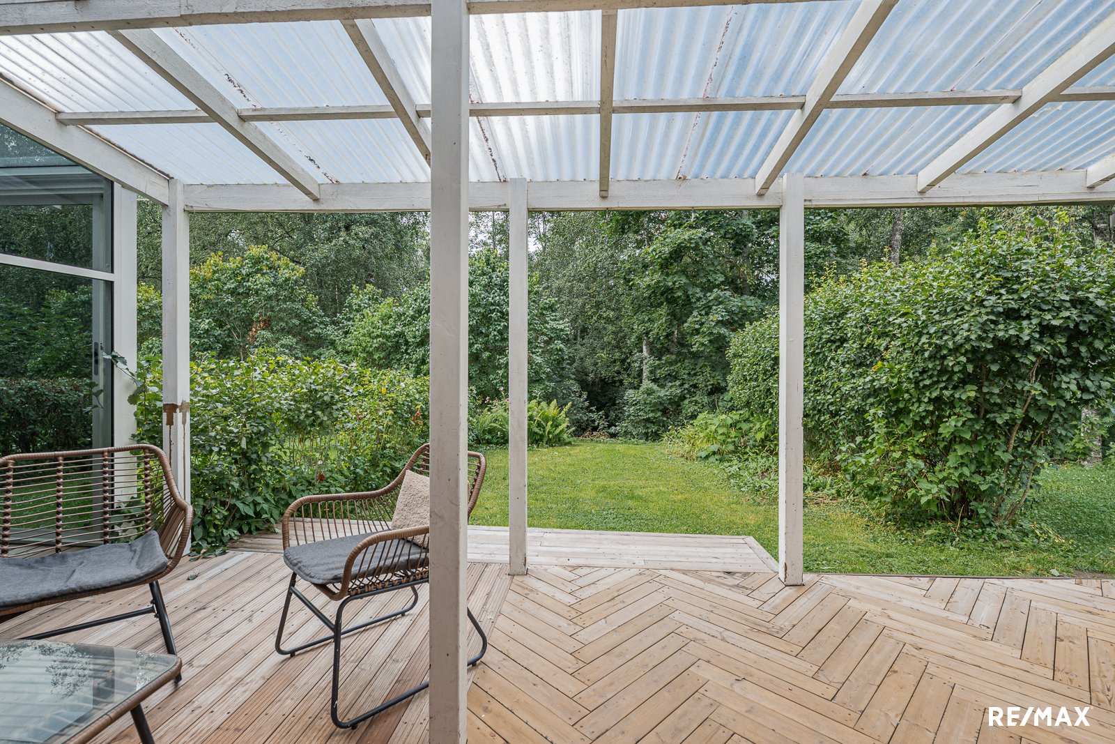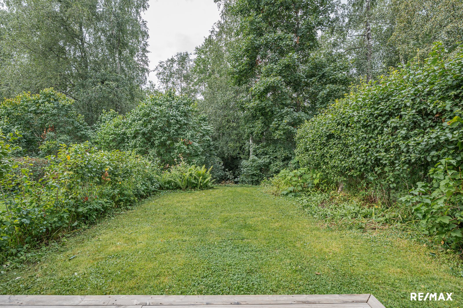 Alakerrassa on eteinen, olohuone, ruokailutila, keittiö ja erillinen wc. Olohuoneesta on käynti takapihan valokatetulle terasille ja suojaisa takapiha on vehreä ja edessä ei ole taloja.