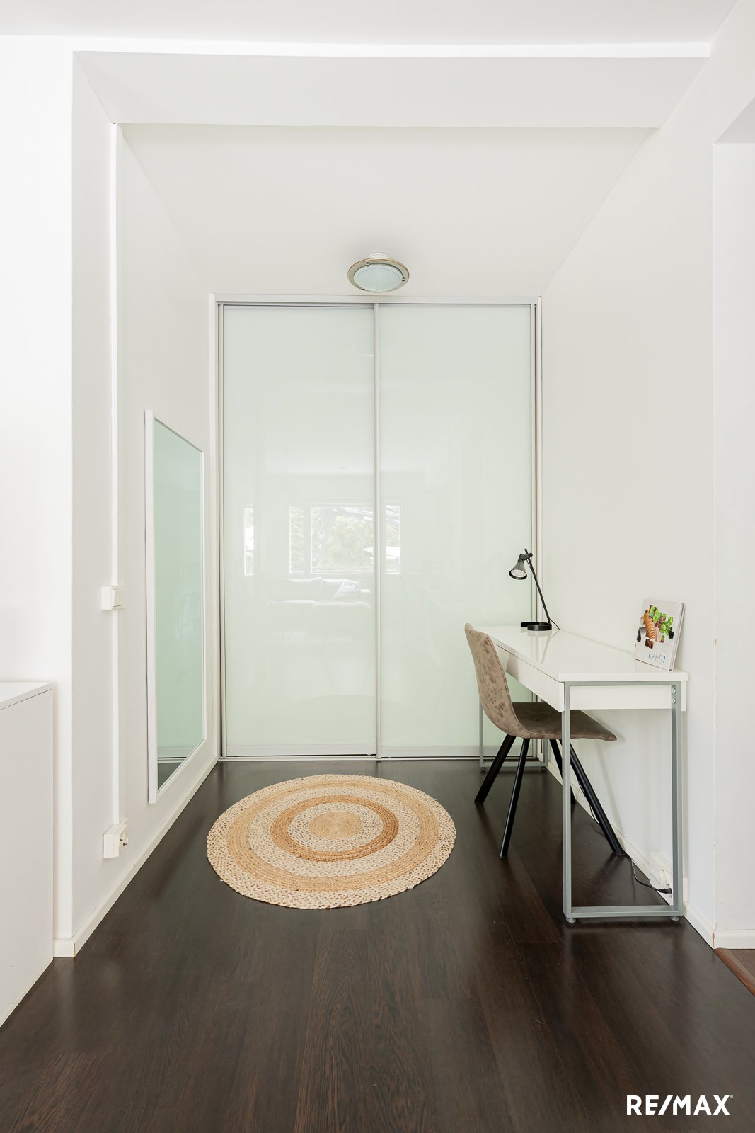Olohuoneen yhteydessä myös mukava työskentelytila ja kaapistot säilytystä varten,