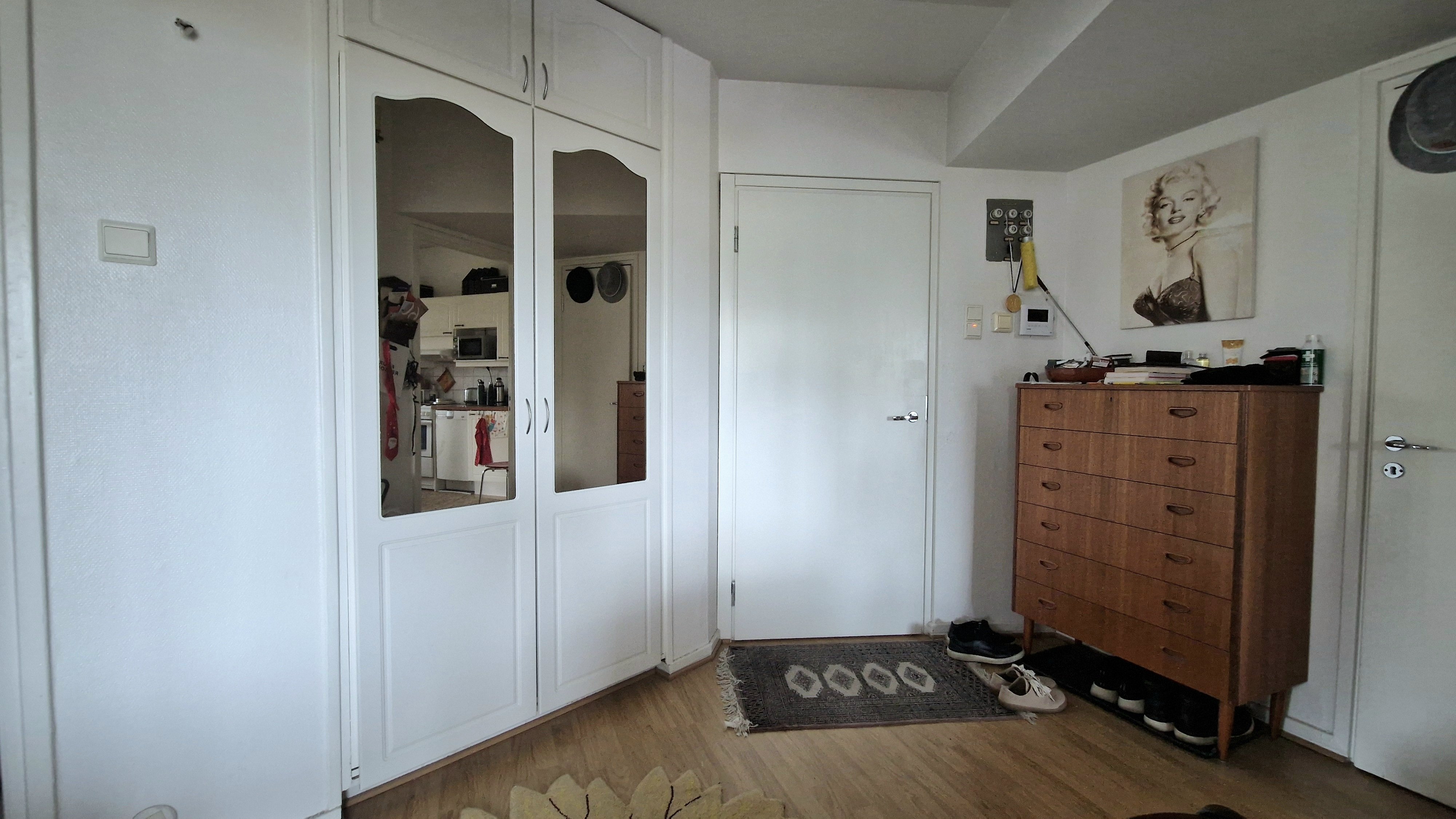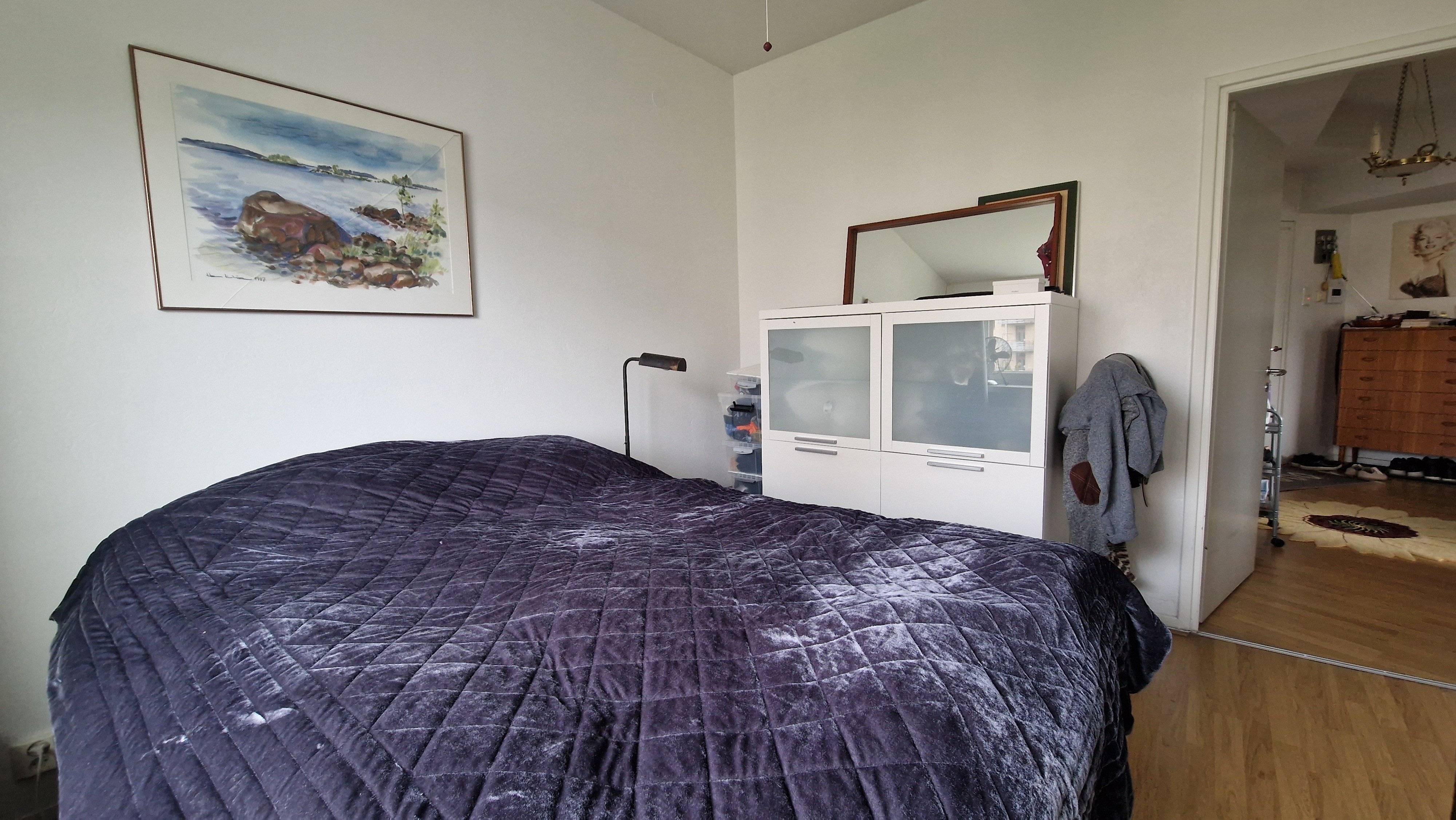 Makuuhuone on omassa rauhassaan ja se on kompaktin kokoinen. Makuuhuoneessa ei ole kiinteitä kaapistoja, mutta eteisestä löytyy käynti asunnon tilavaan vaatehuoneeseen. Eteinen toivottaakin kotiin tilavuudella, joka helpottaa arkisia toimintoja tässä kodissa.